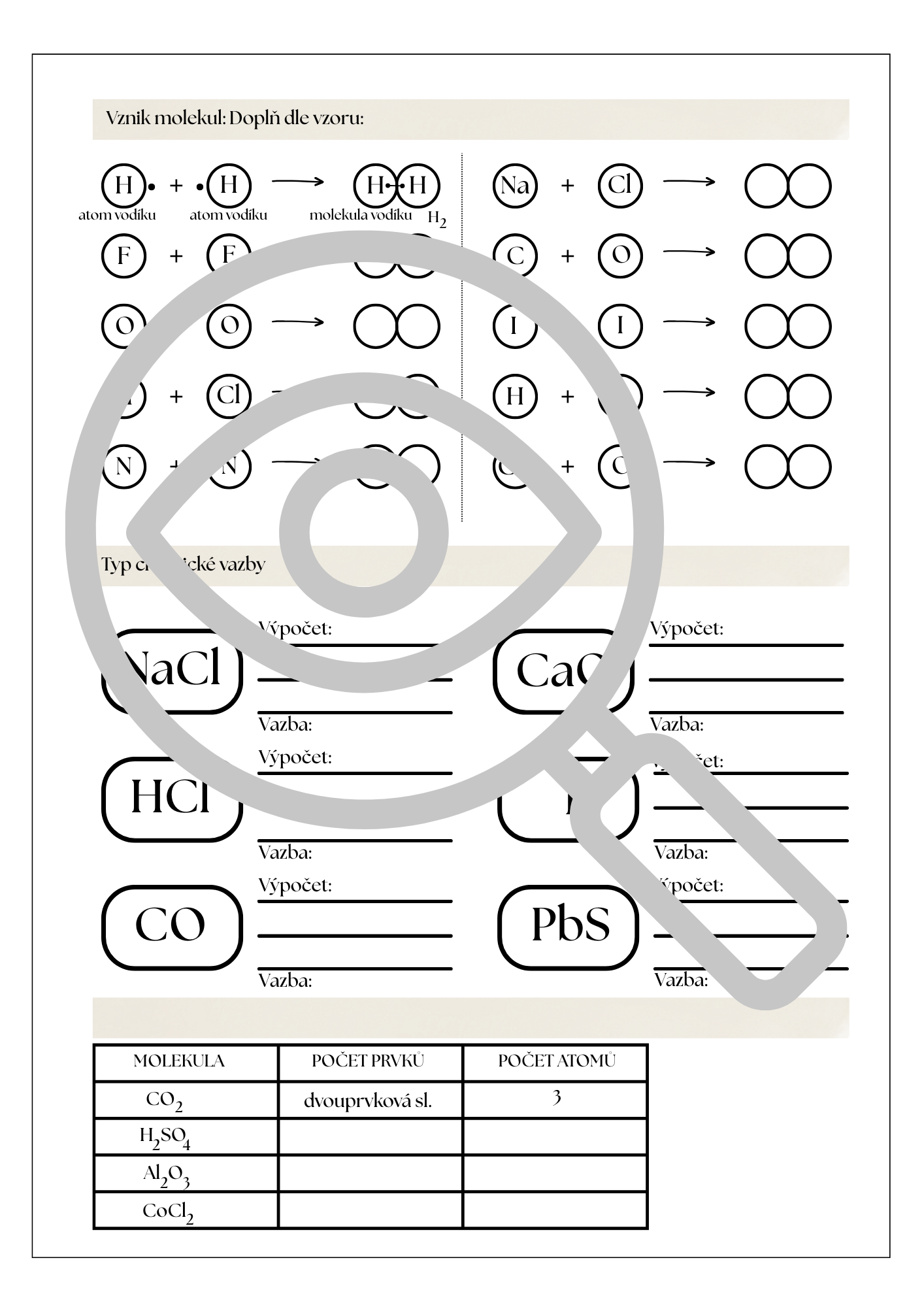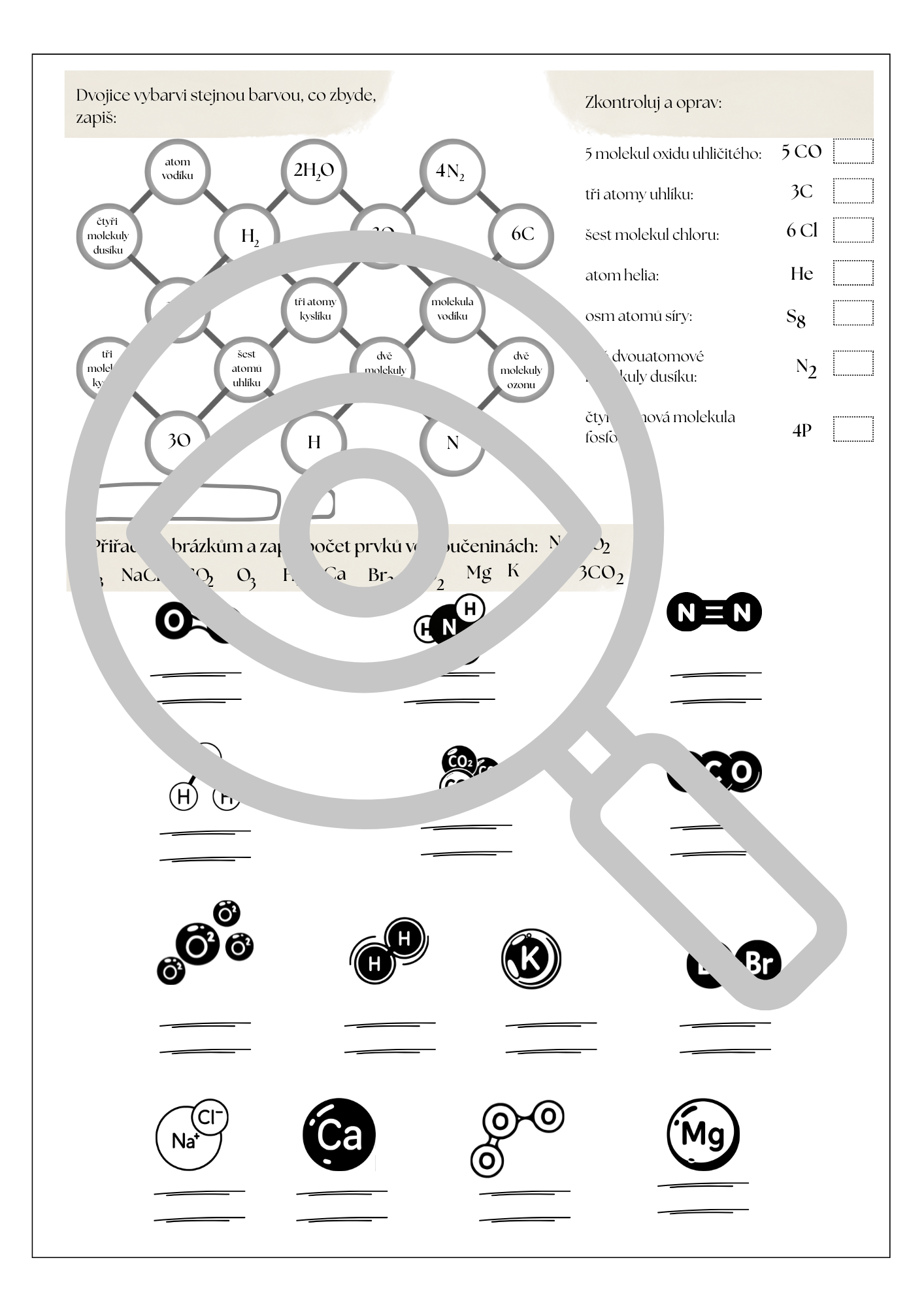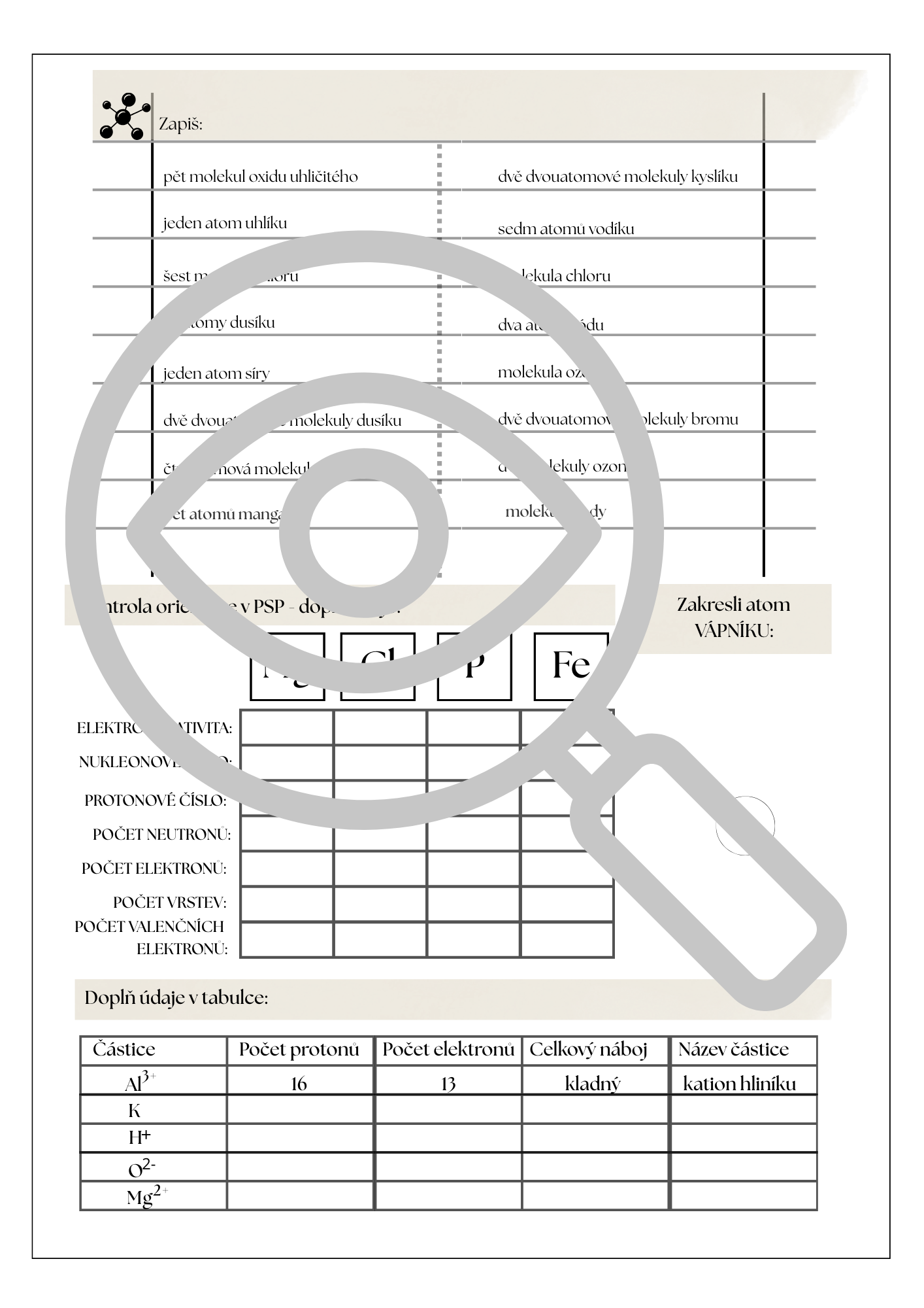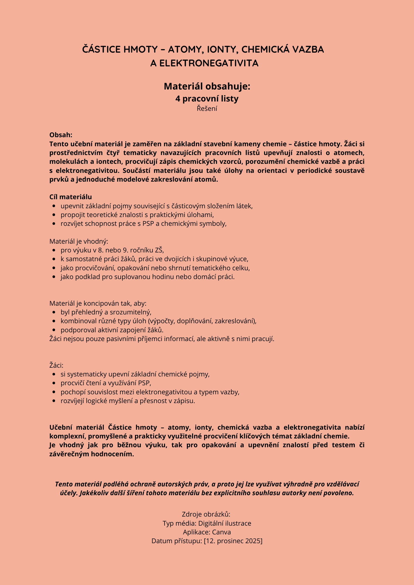 Tento učební materiál je zaměřen na základní stavební kameny chemie – částice hmoty. Žáci si prostřednictvím čtyř tematicky navazujících pracovních listů upevňují znalosti o atomech, molekulách a iontech, procvičují zápis chemických vzorců, porozumění chemické vazbě a práci s elektronegativitou. Součástí materiálu jsou také úlohy na orientaci v periodické soustavě prvků a jednoduché modelové zakreslování atomů.