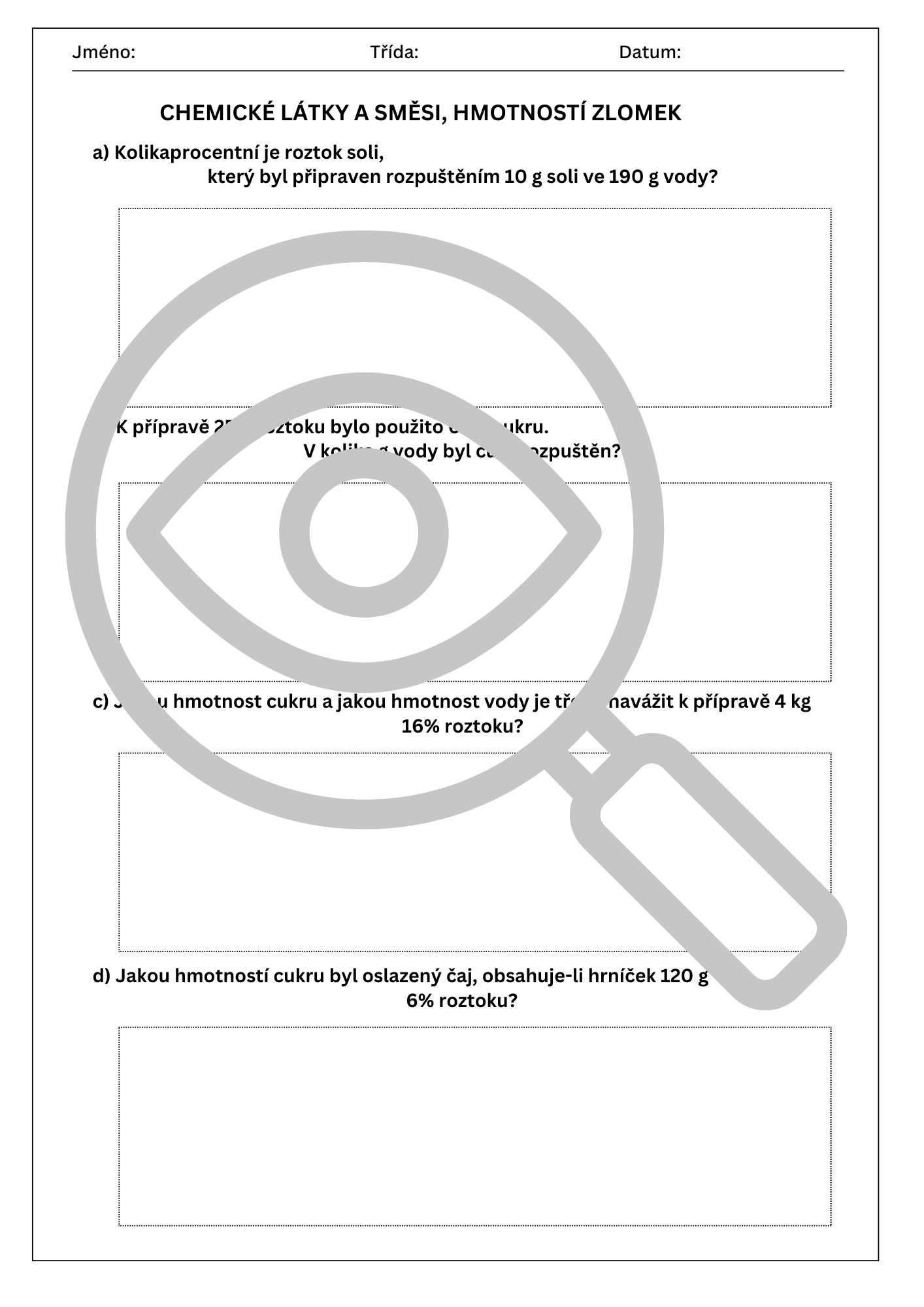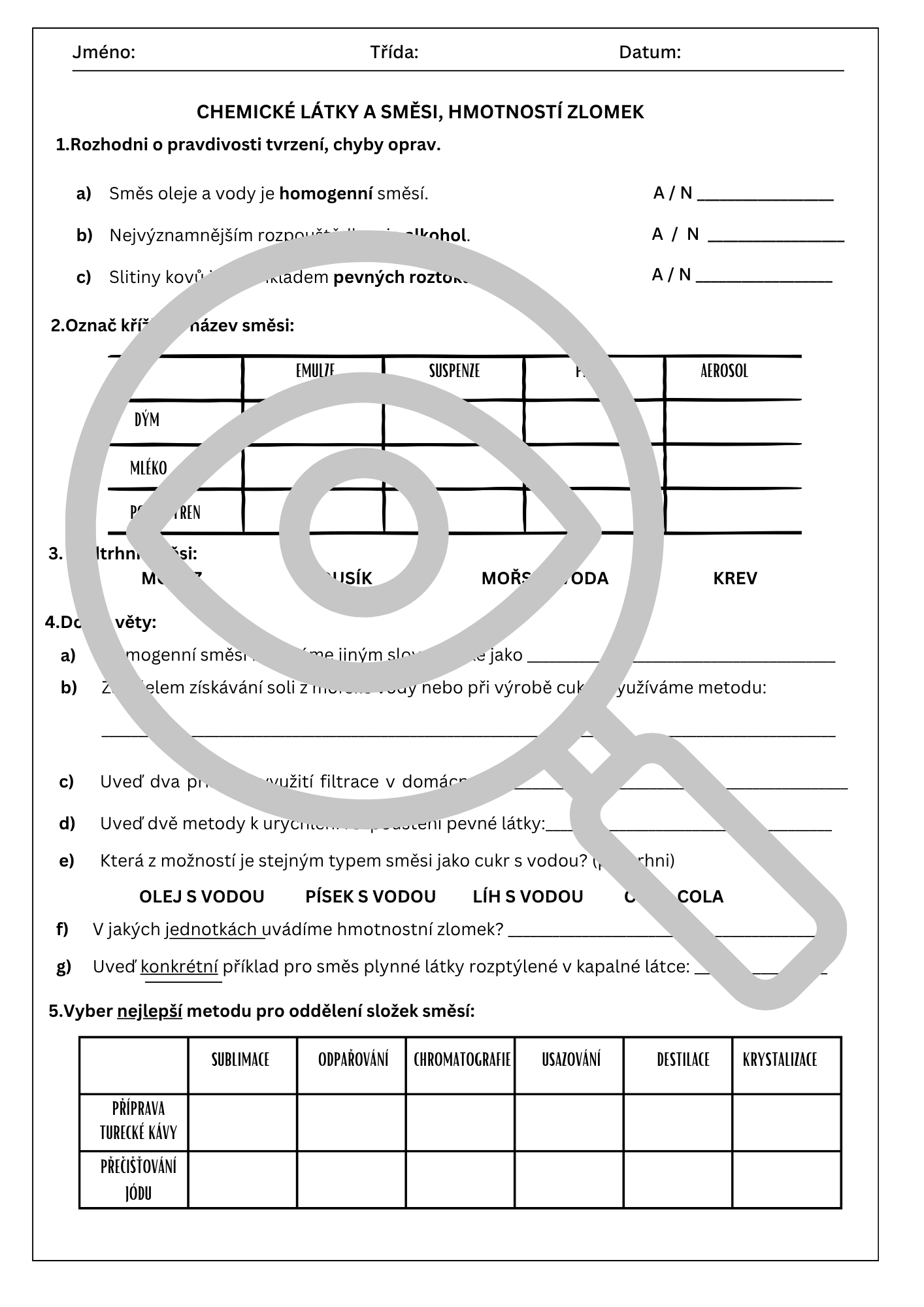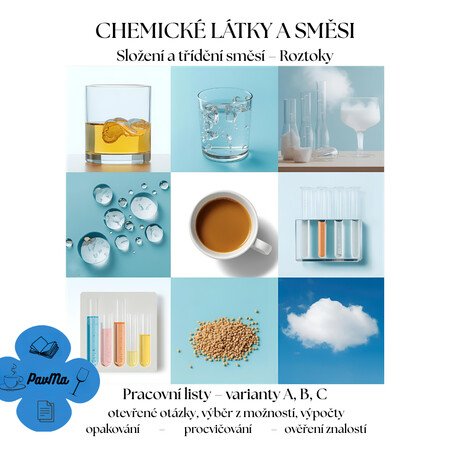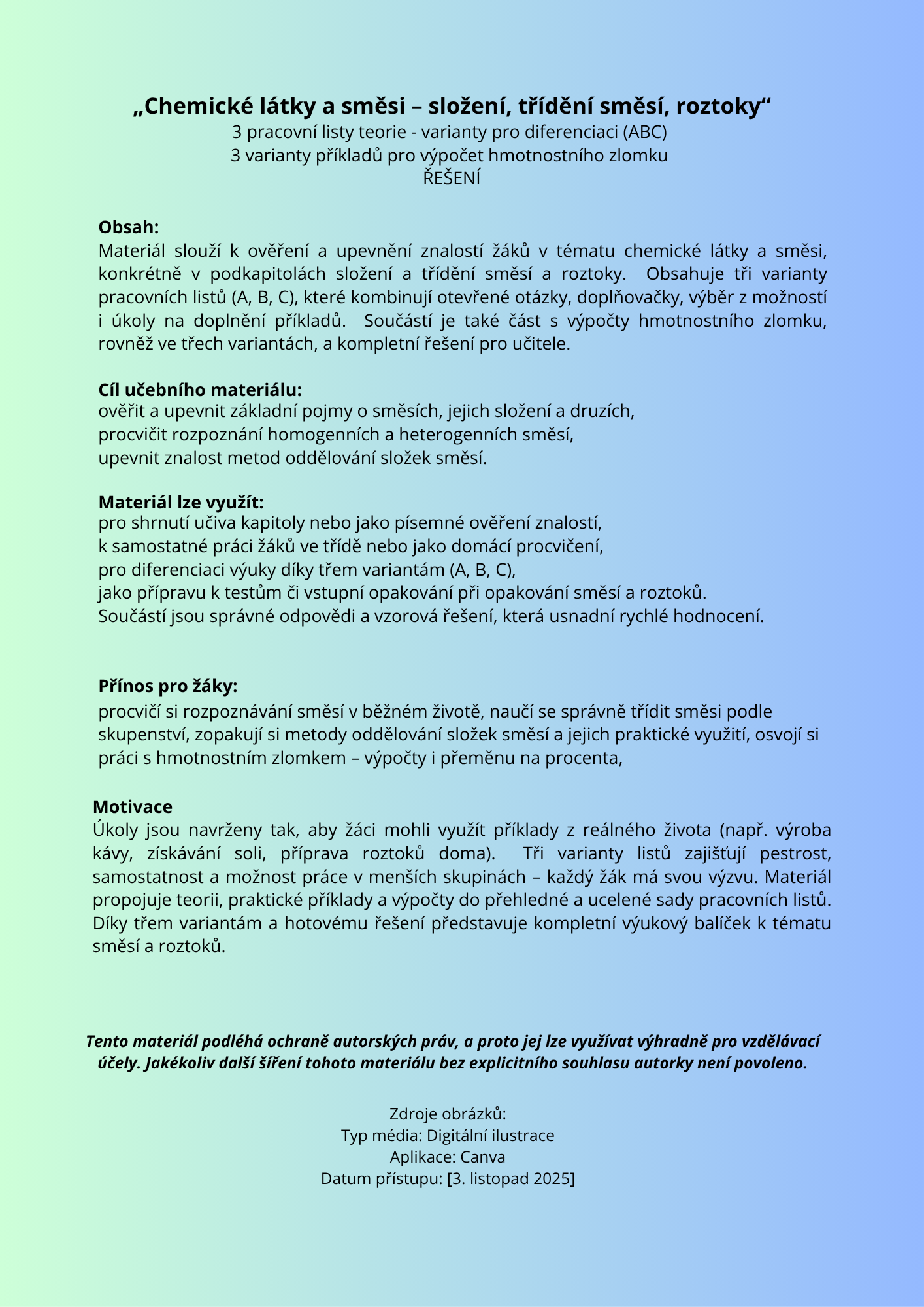 Materiál propojuje teorii, praktické příklady a výpočty do přehledné a ucelené sady pracovních listů. Díky třem variantám a hotovému řešení představuje kompletní výukový balíček k tématu směsí a roztoků.