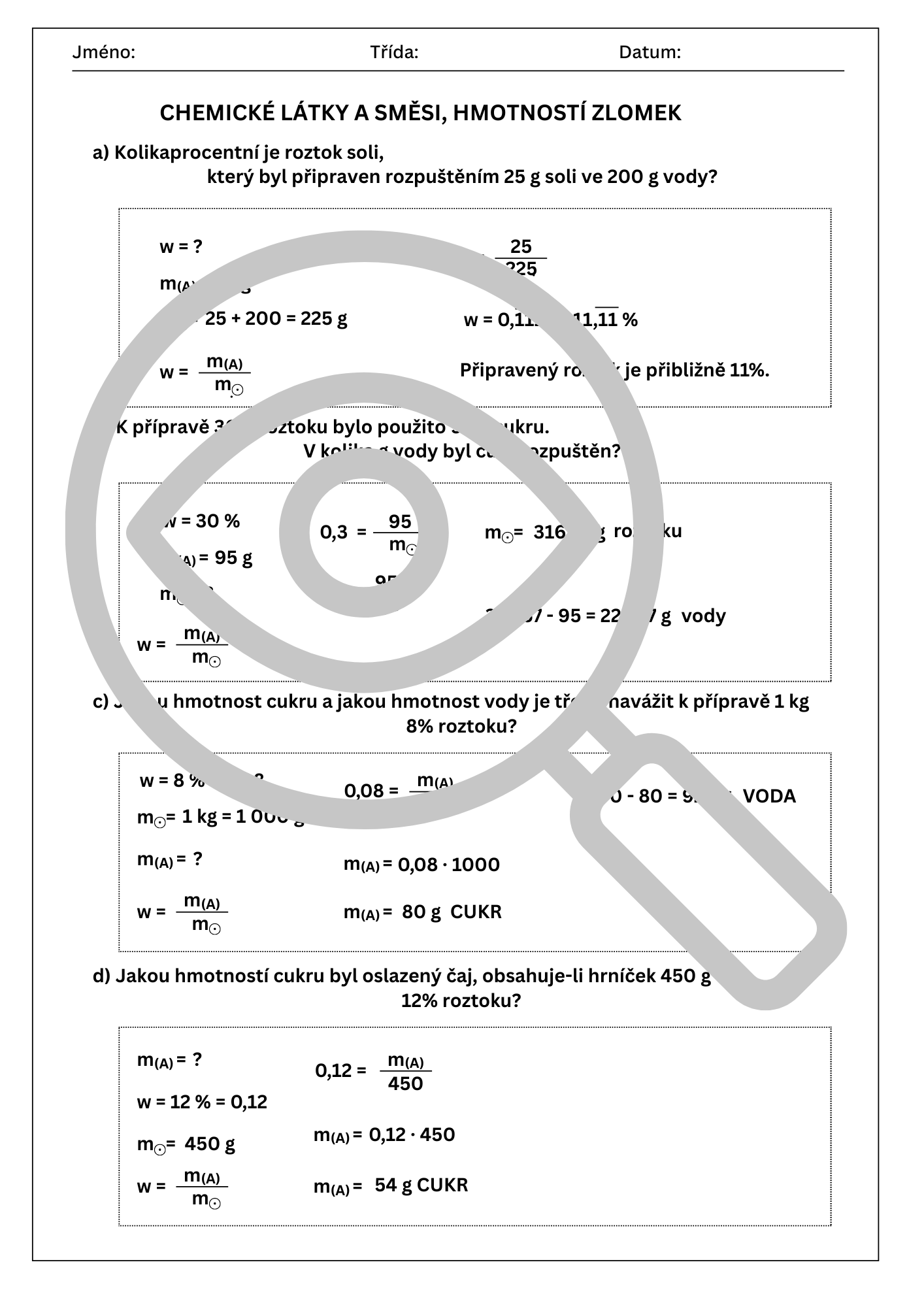 - osvojí si práci s hmotnostním zlomkem – výpočty i přeměnu na procenta,