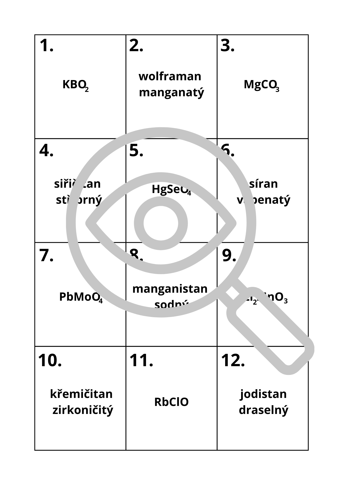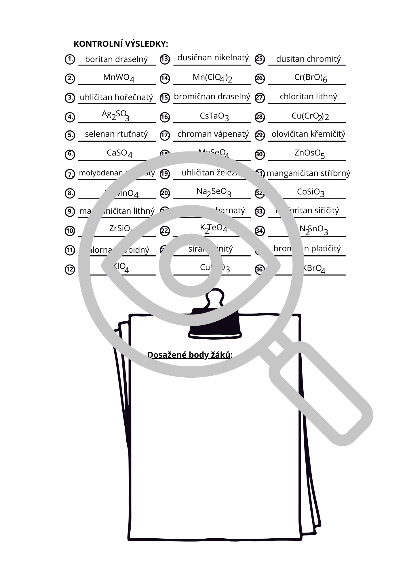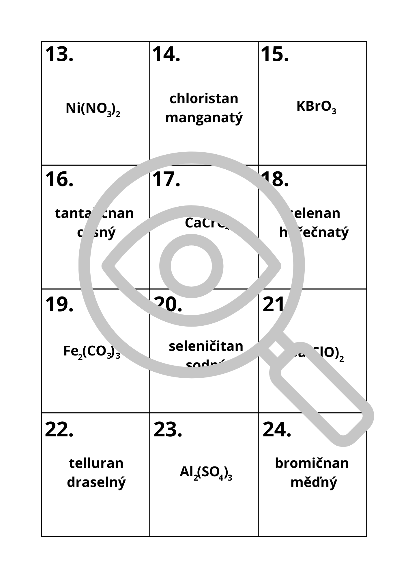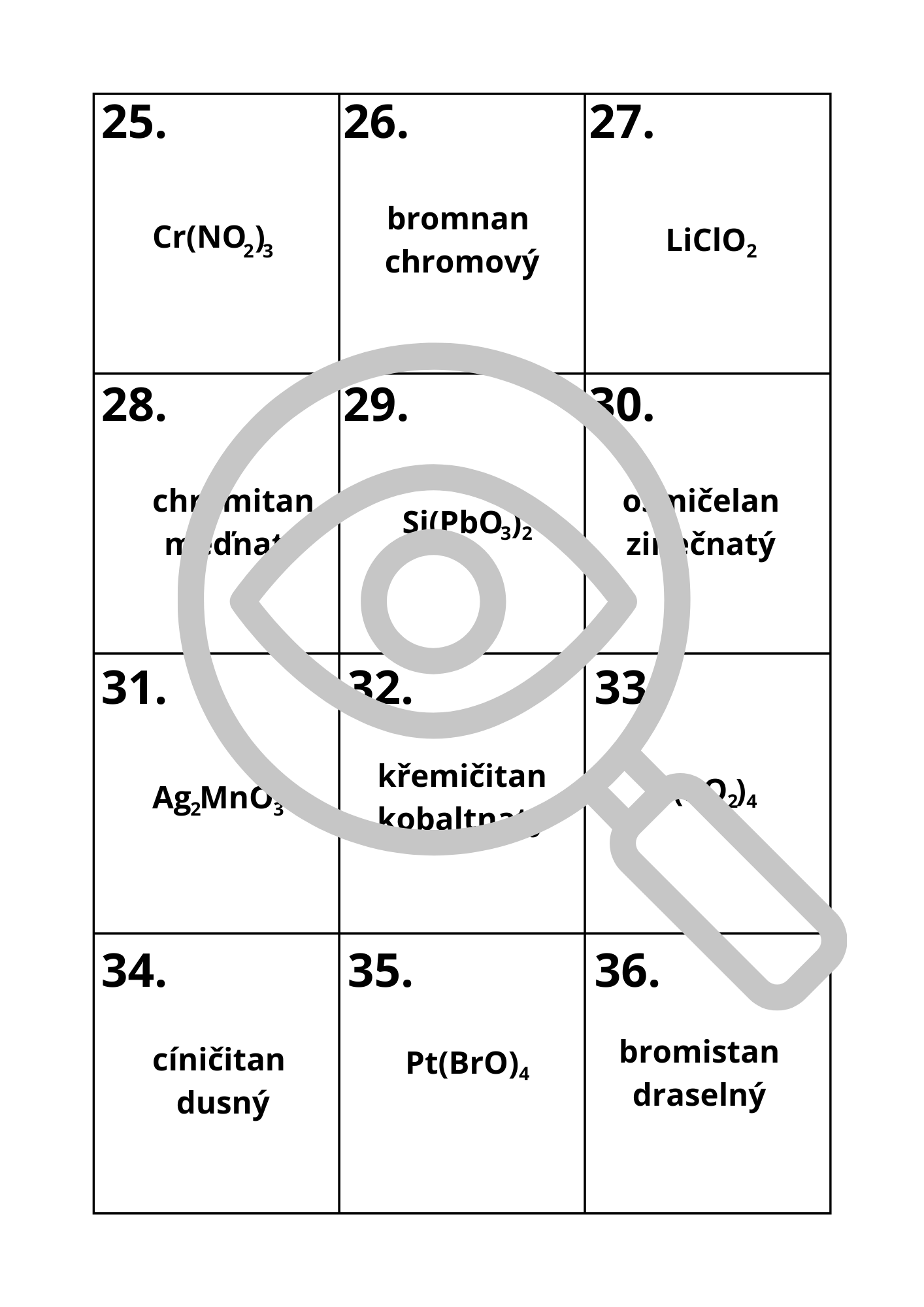 36 kartiček s názvy/vzorci solí