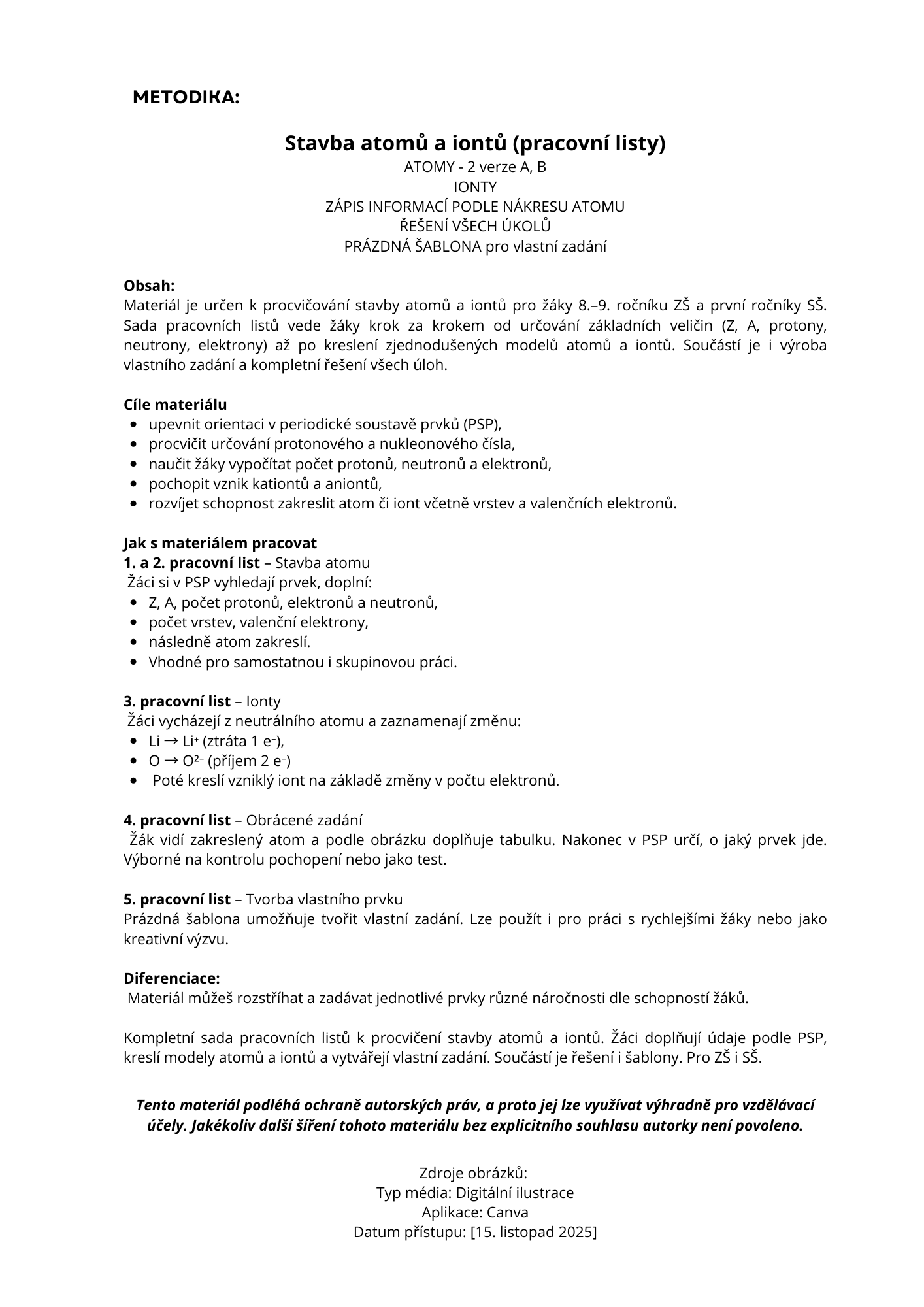 Materiál je určen k procvičování stavby atomů a iontů pro žáky 8.–9. ročníku ZŠ a první ročníky SŠ. Sada pracovních listů vede žáky krok za krokem od určování základních veličin (Z, A, protony, neutrony, elektrony) až po kreslení zjednodušených modelů atomů a iontů. Součástí je i výroba vlastního zadání a kompletní řešení všech úloh.