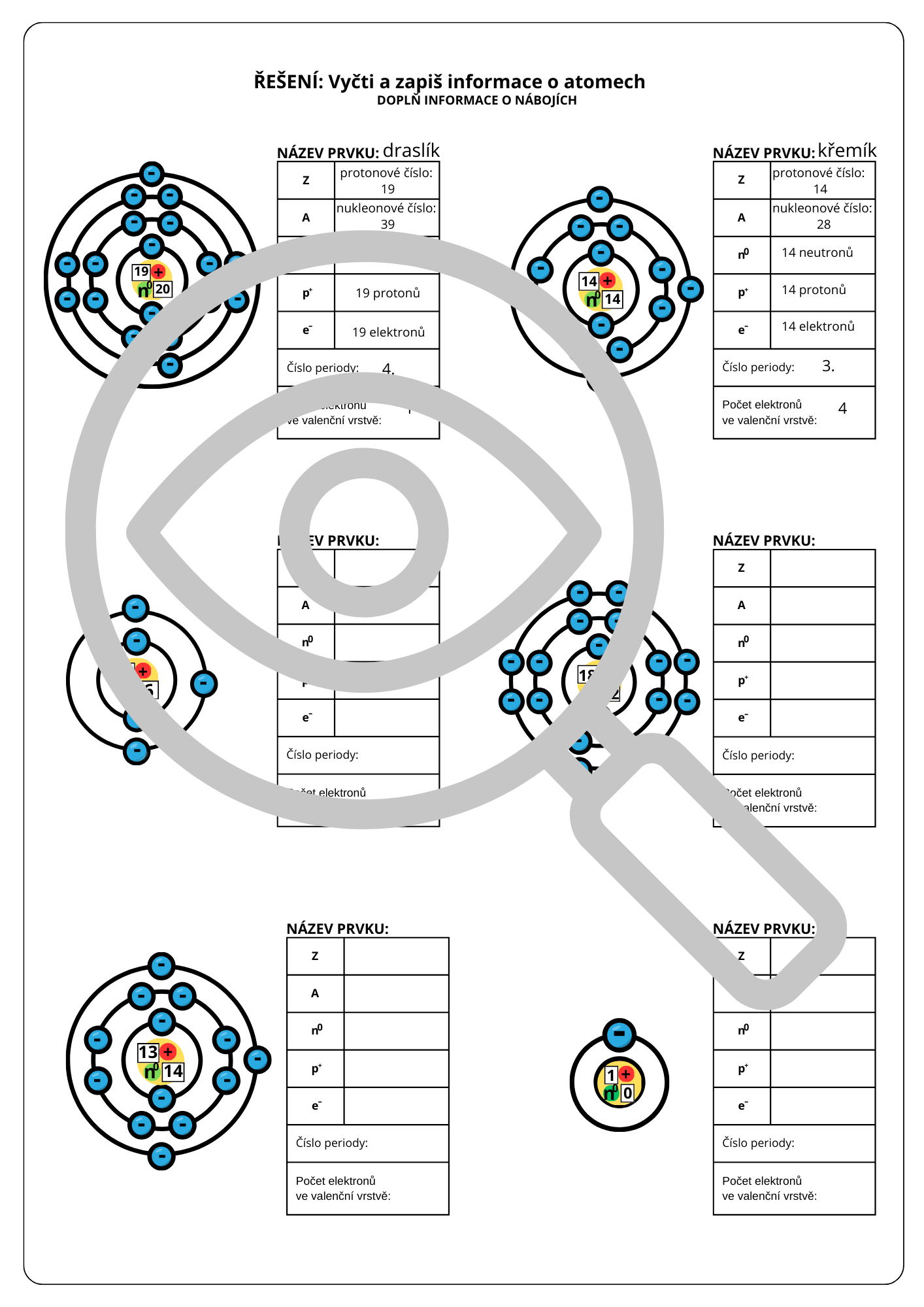 Žák vidí zakreslený atom a podle obrázku doplňuje tabulku. Nakonec v PSP určí, o jaký prvek jde. Výborné na kontrolu pochopení nebo jako test.
