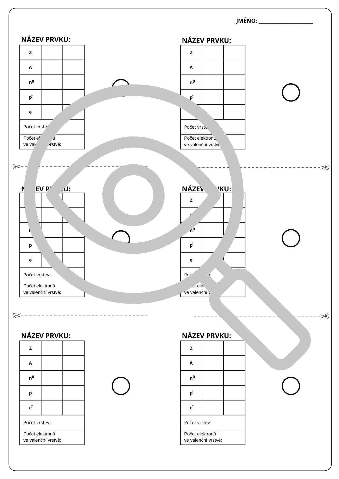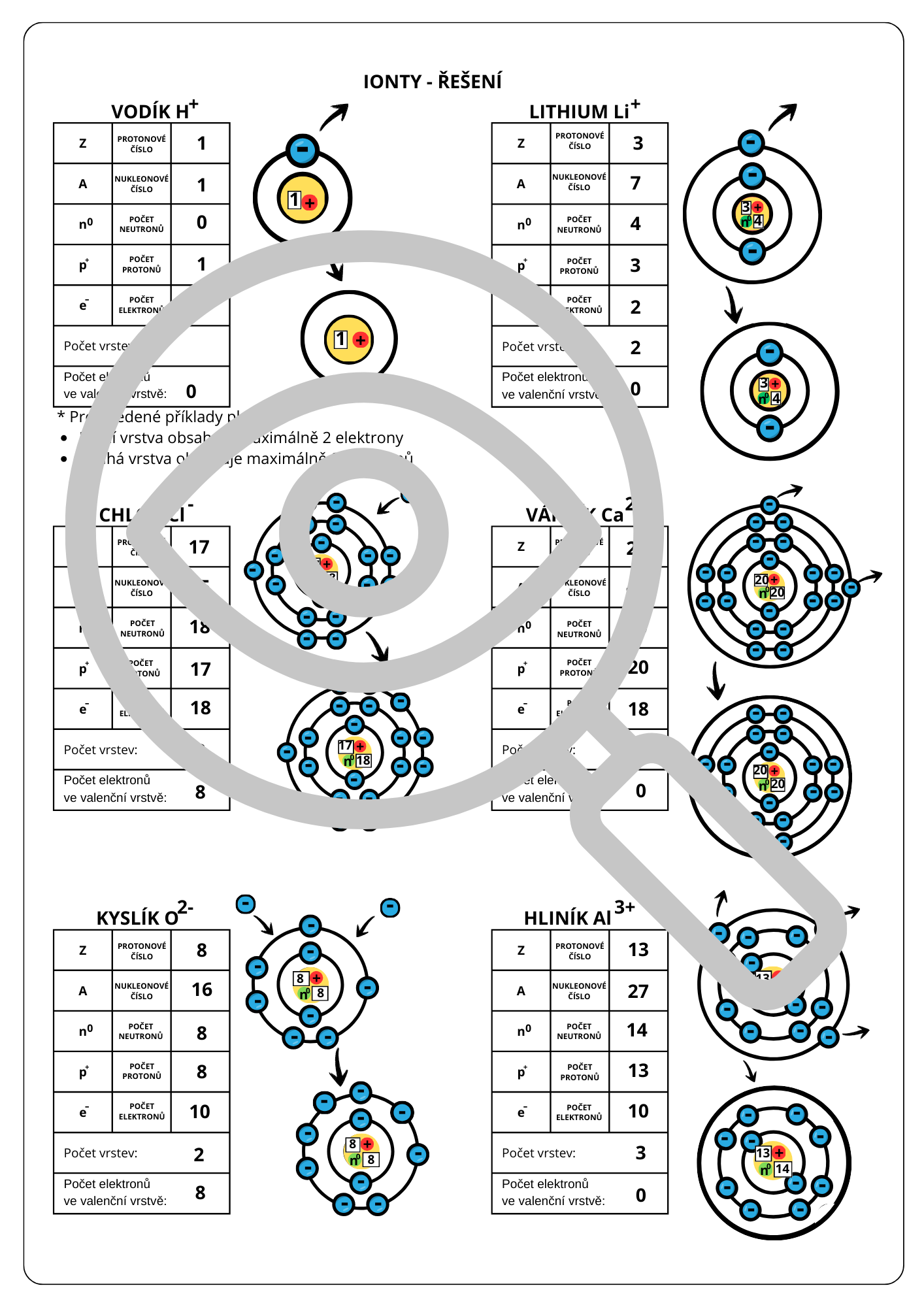 Kompletní sada pracovních listů k procvičení stavby atomů a iontů. Žáci doplňují údaje podle PSP, kreslí modely atomů a iontů a vytvářejí vlastní zadání. Součástí je řešení i šablony. Pro ZŠ i SŠ.