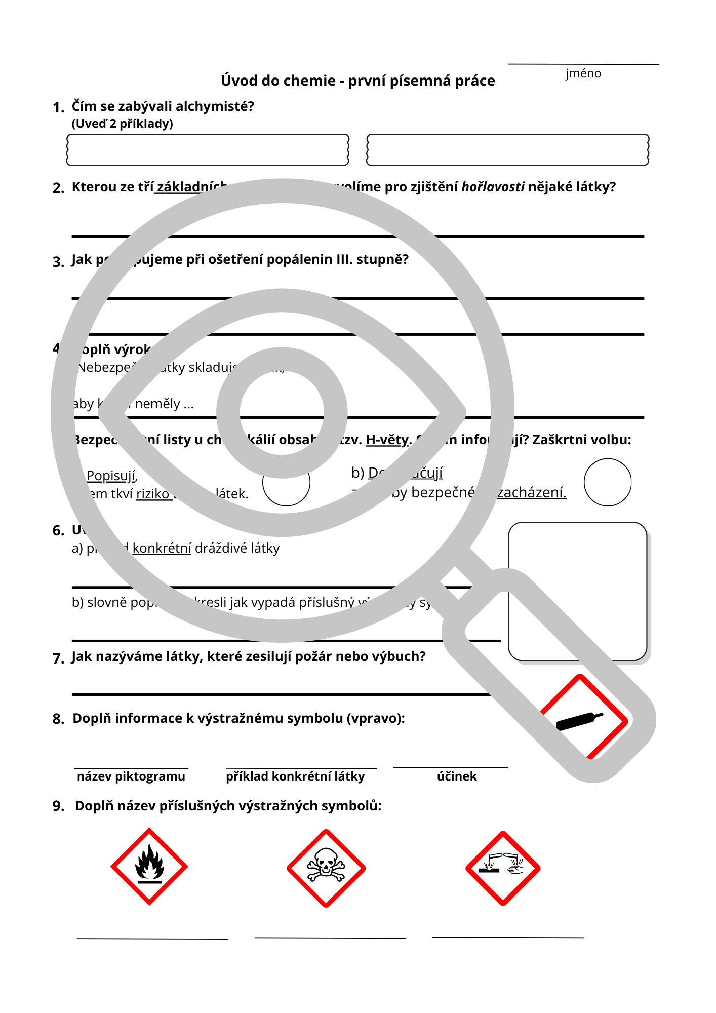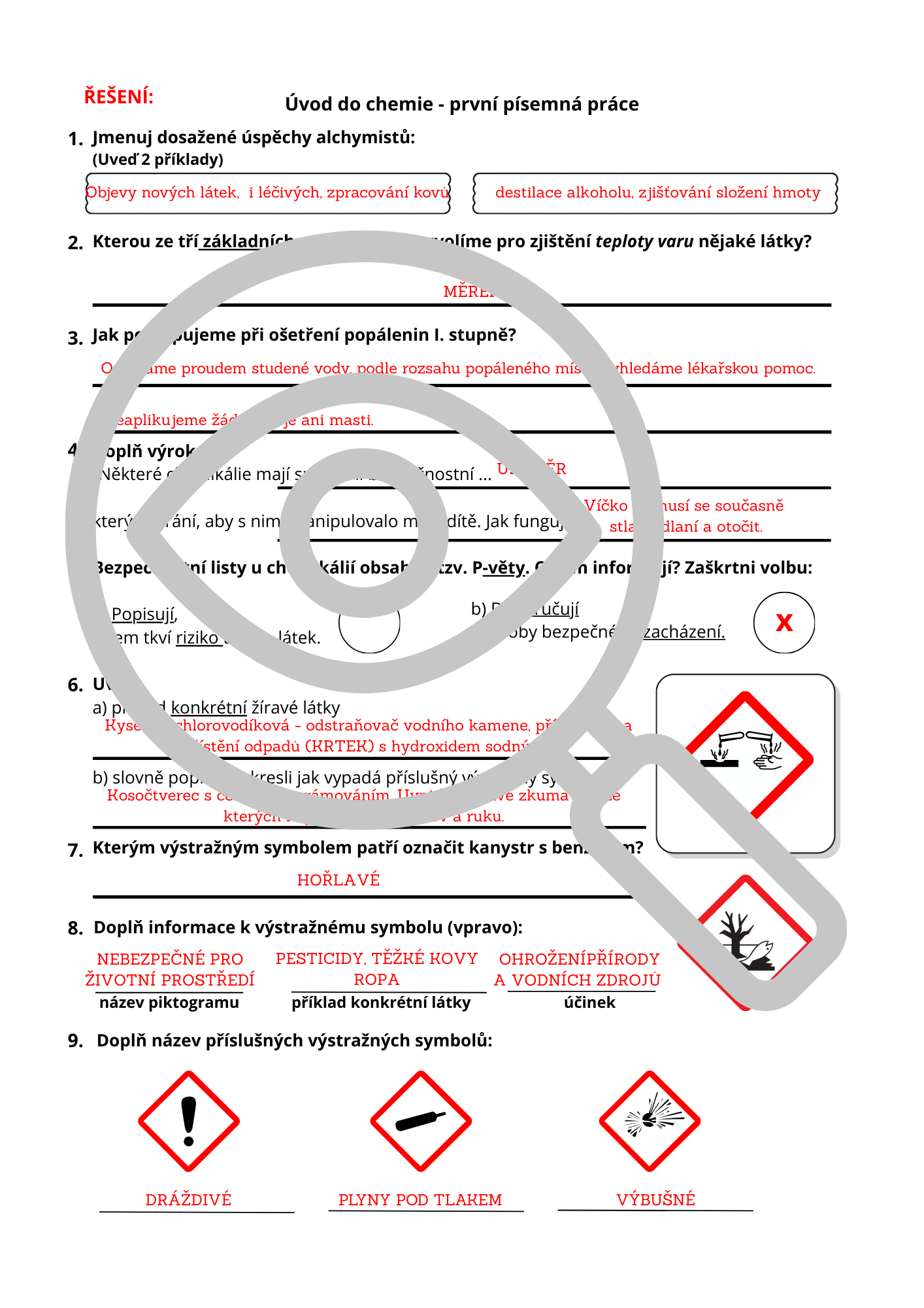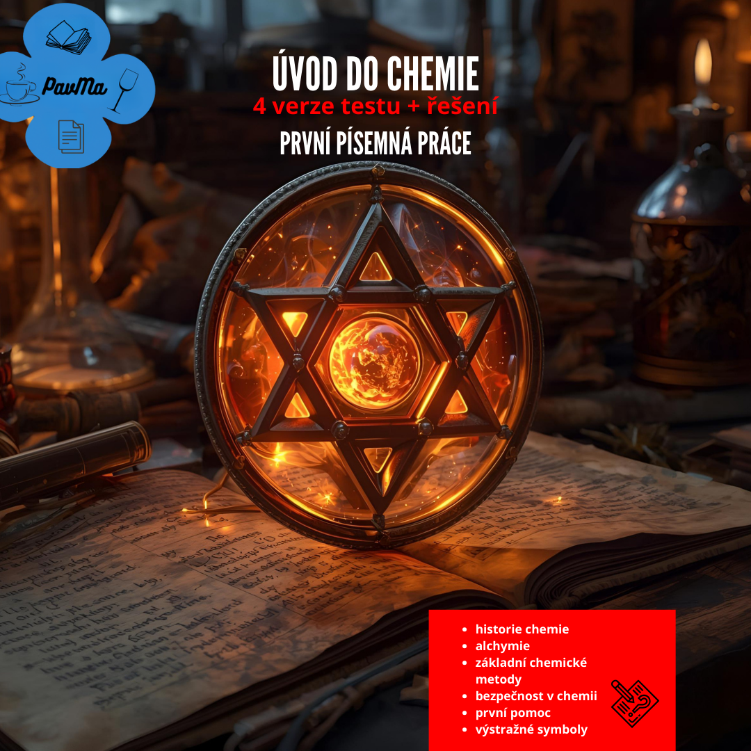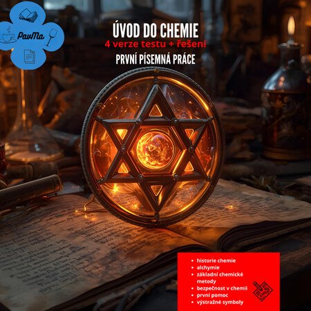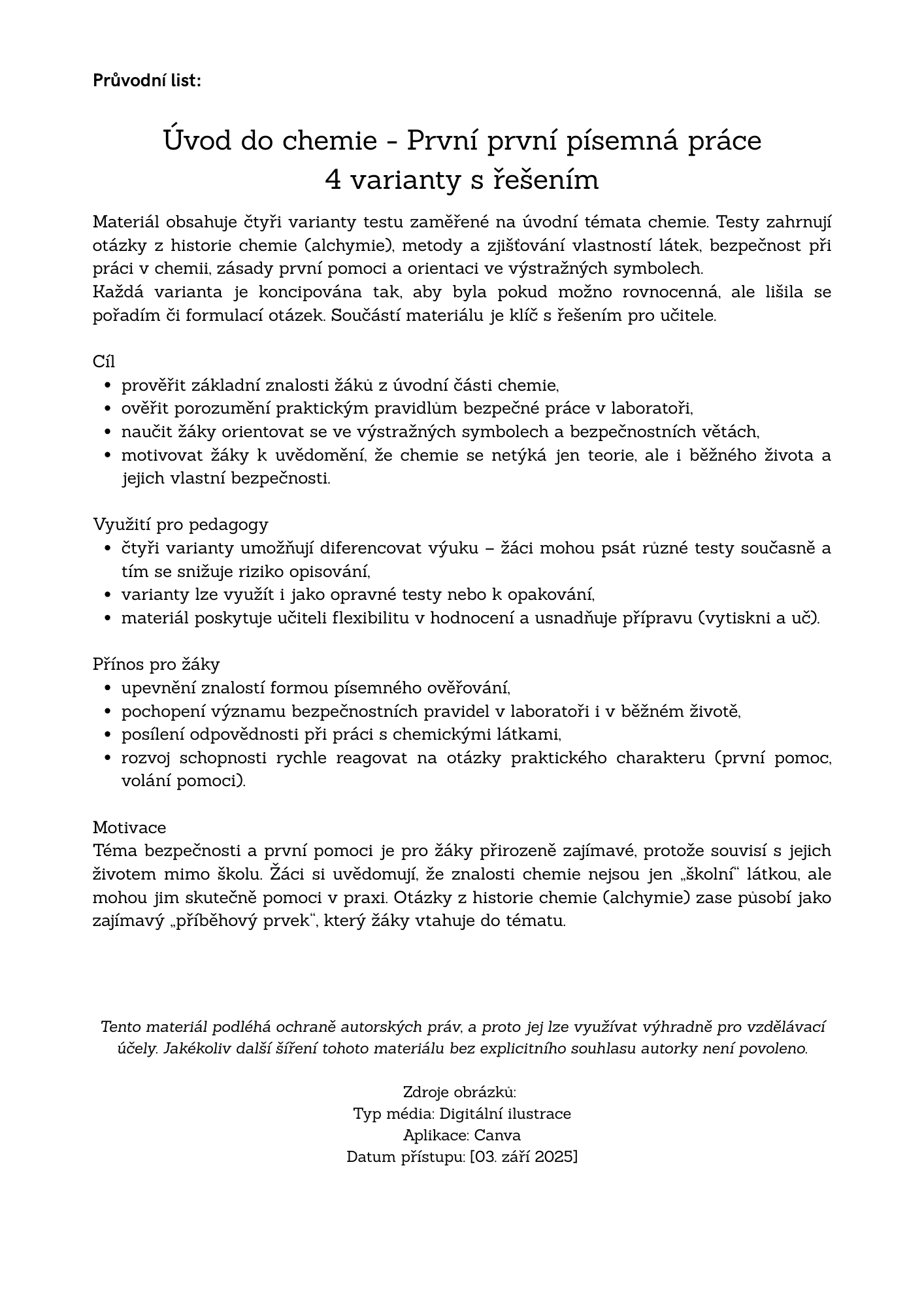 Materiál obsahuje čtyři varianty testu zaměřené na úvodní témata chemie. Testy zahrnují otázky z historie chemie (alchymie), metody a zjišťování vlastností látek, bezpečnost při práci v chemii, zásady první pomoci a orientaci ve výstražných symbolech.