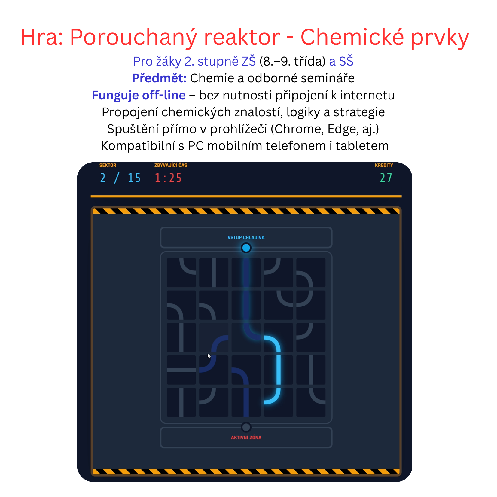 - Oprava (Potrubí): Klikáním na díly potrubí musí žák vytvořit spojitou cestu chladiva. Pokud čas vyprší, reaktor exploduje a hra končí.