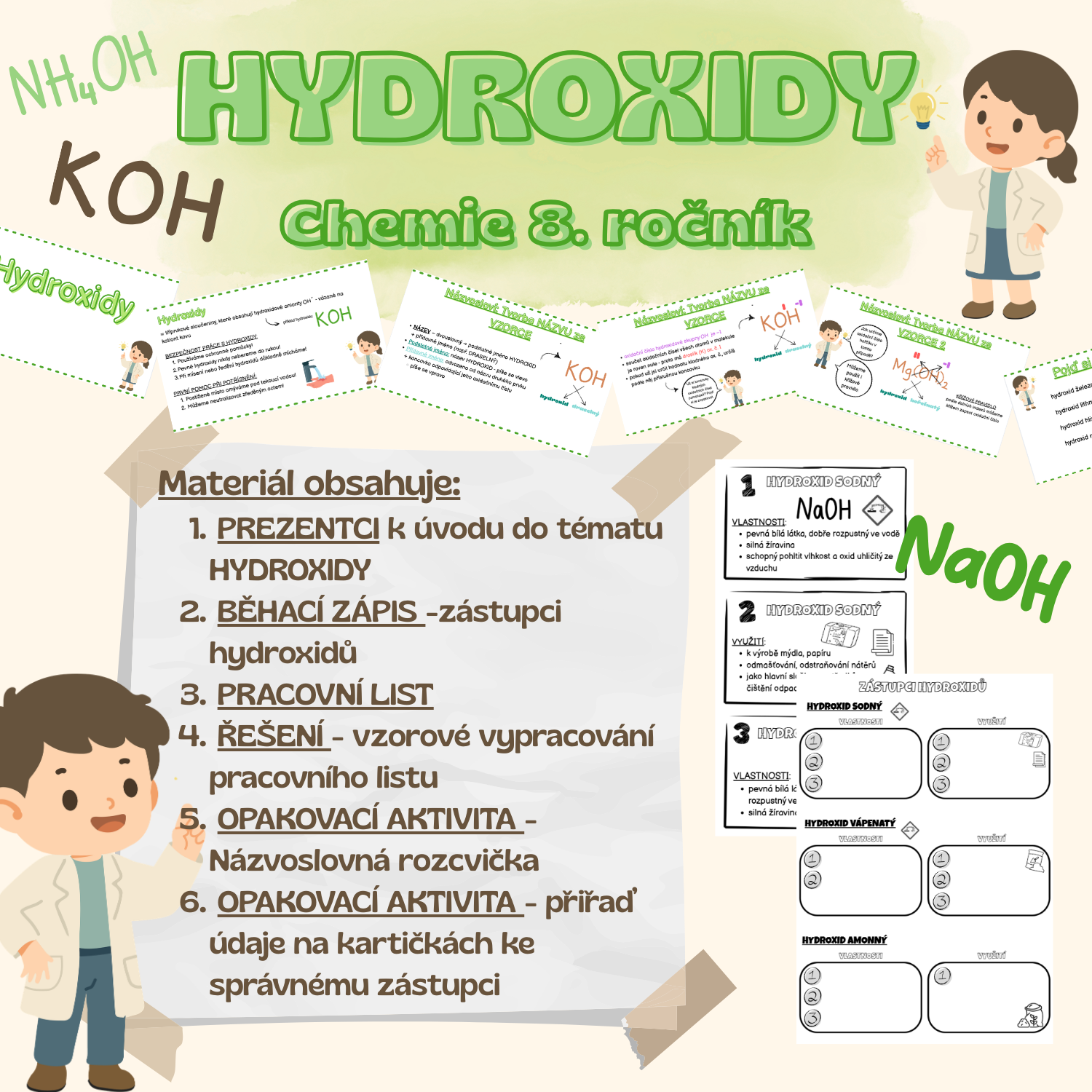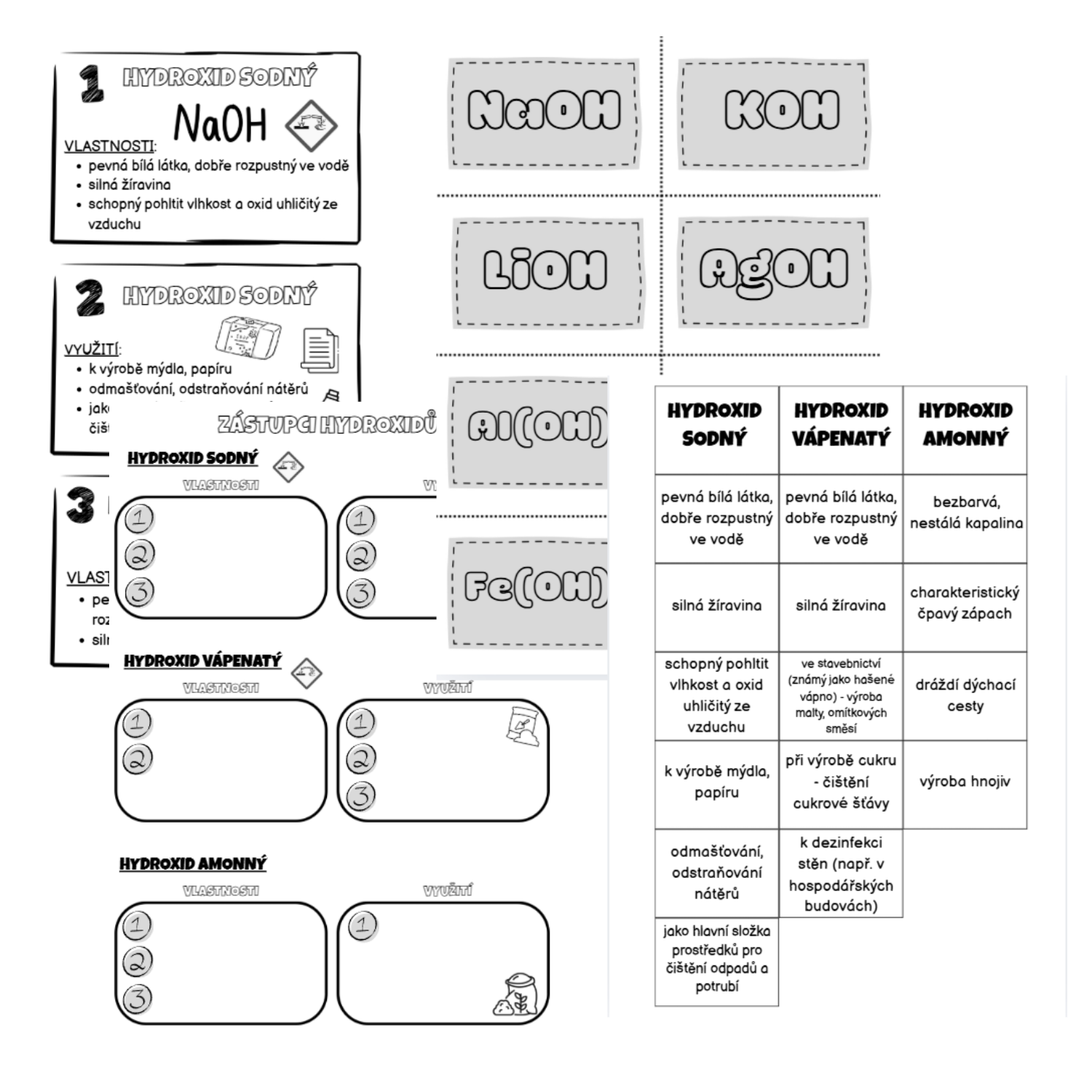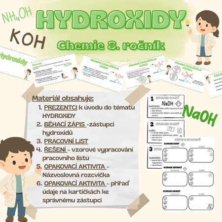 Cílem materiálu je, aby se žáci seznámili s pojmem HYDROXIDY, dále pak s názvoslovím HYDROXIDŮ. Dále se seznámí se zástupci HYDROXIDŮ zábavnou formou, kdy procvičují svoji krátkodobou paměť.