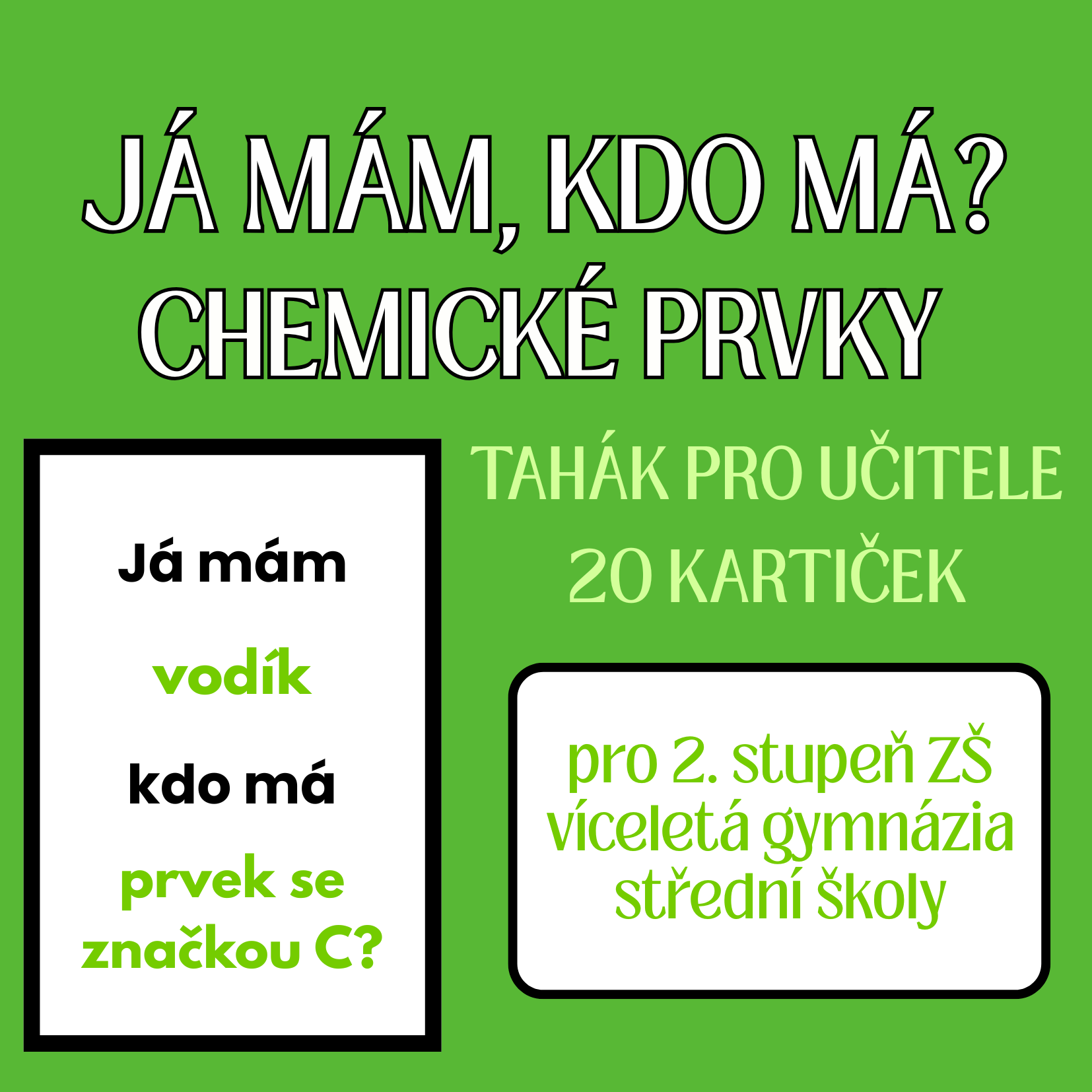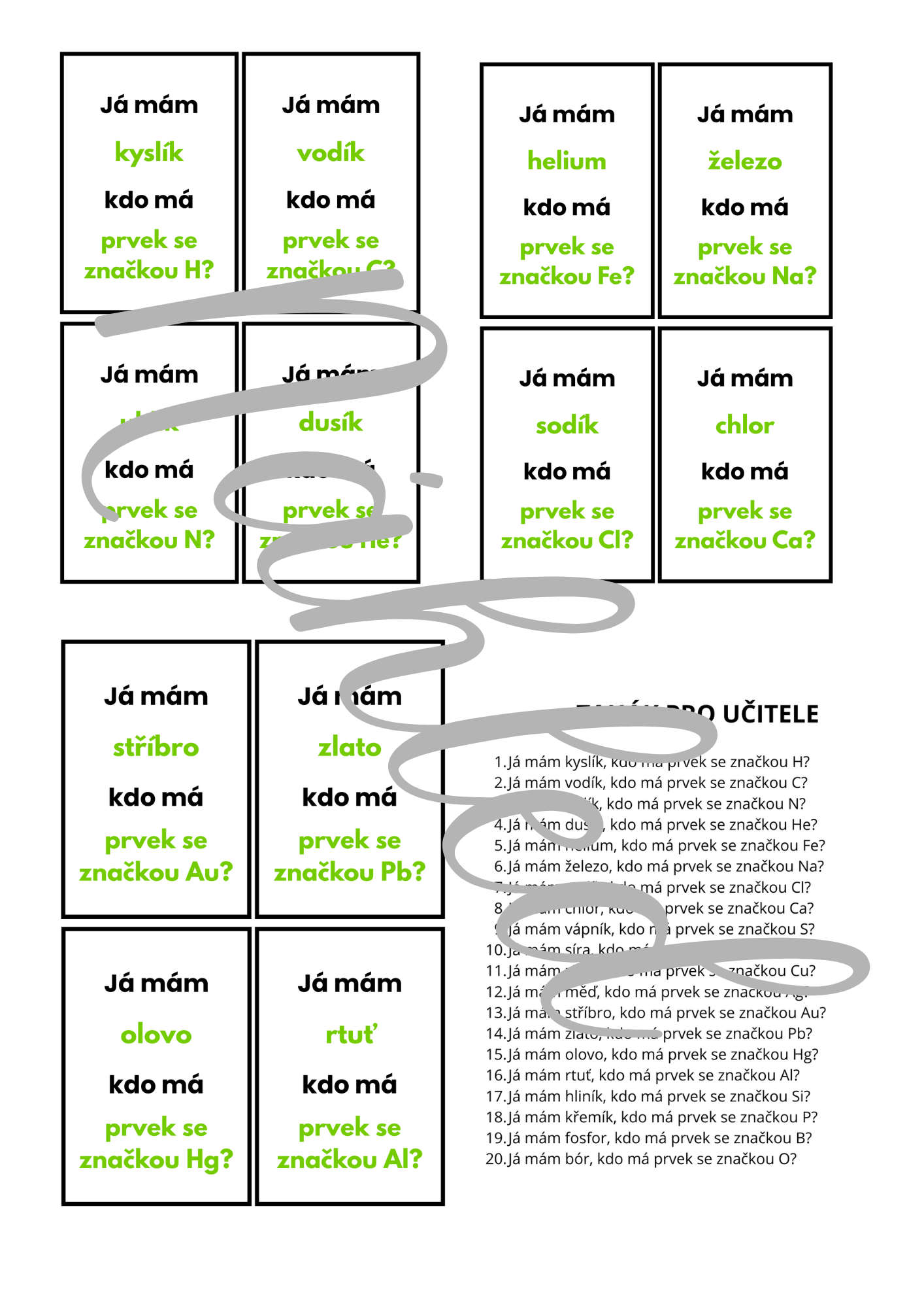 S touto sadou kartiček se žáci promění v chemické detektivy. Každý má v ruce název prvku a hledá, kdo drží odpověď na značku, kterou hledá. „Já mám kyslík, kdo má prvek se značkou H?“ – a už se rozjíždí lavina reakcí!