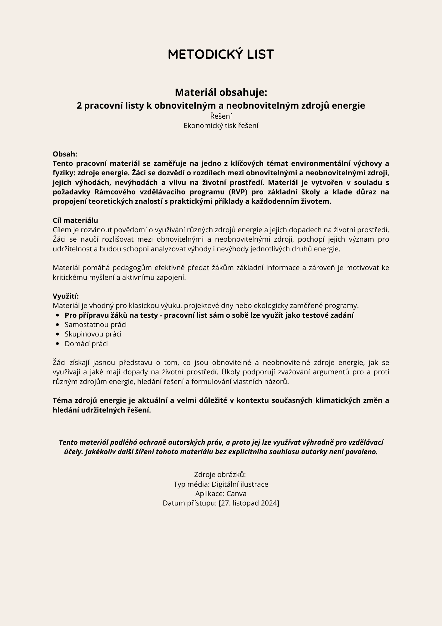 Tento pracovní materiál se zaměřuje na jedno z klíčových témat environmentální výchovy a fyziky: zdroje energie. Žáci se dozvědí o rozdílech mezi obnovitelnými a neobnovitelnými zdroji, jejich výhodách, nevýhodách a vlivu na životní prostředí. Materiál je vytvořen v souladu s požadavky Rámcového vzdělávacího programu (RVP) pro základní školy a klade důraz na propojení teoretických znalostí s praktickými příklady a každodenním životem.