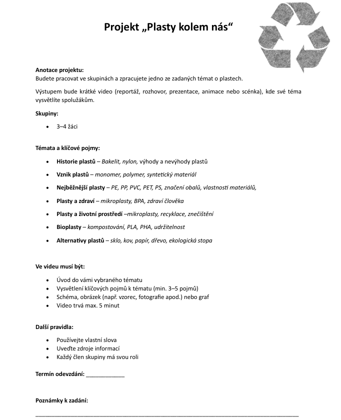 Projekt spojuje chemii, ekologii, biologii a mediální výchovu. Žáci se naučí vyhledávat, třídit a prezentovat informace a procvičí si spolupráci ve skupině.