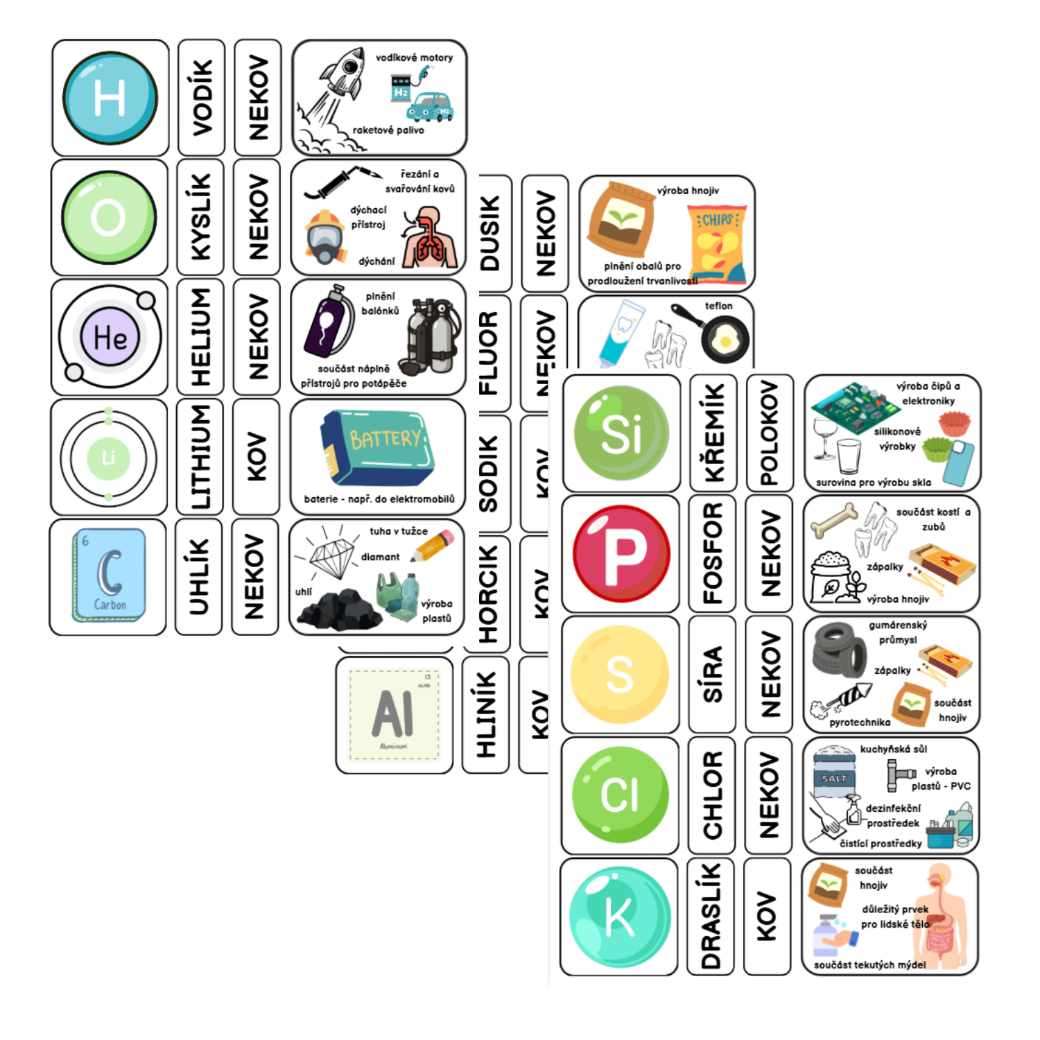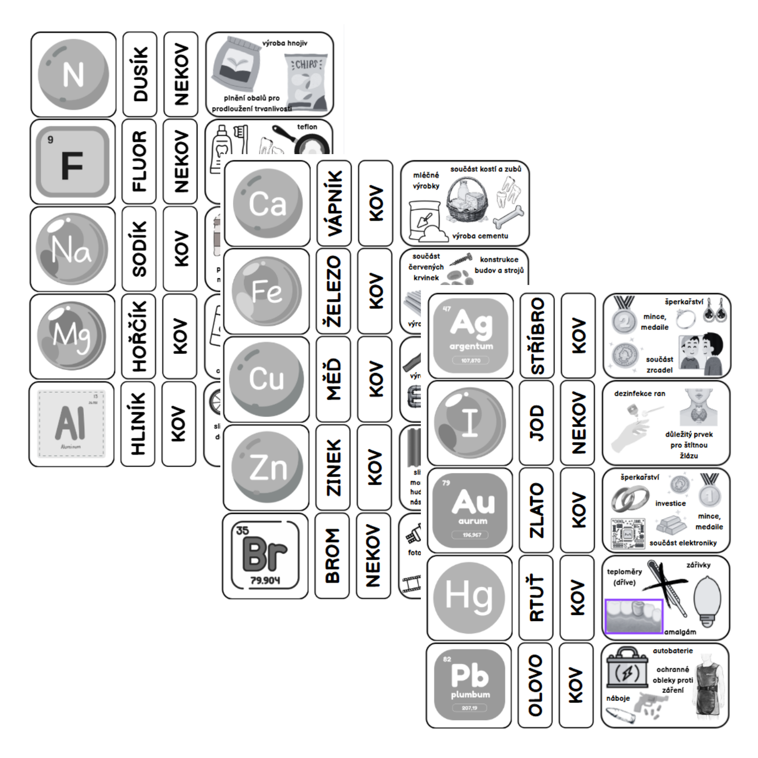 - 25 prvků - základní informace o prvcích jsou vyobrazeny vždy na čtyřech kartičkách - značka prvku, název prvku, zda se jedná o kov/polokov/nekov a význam prvku