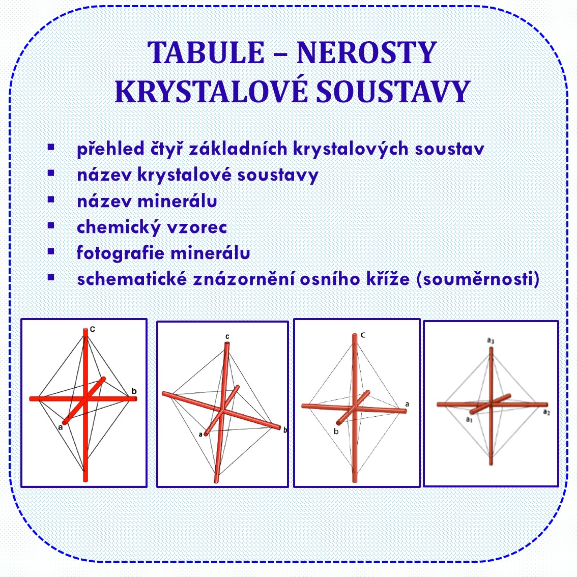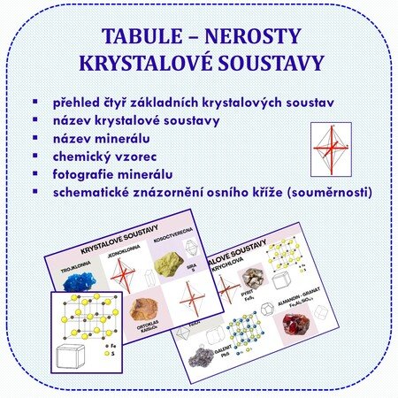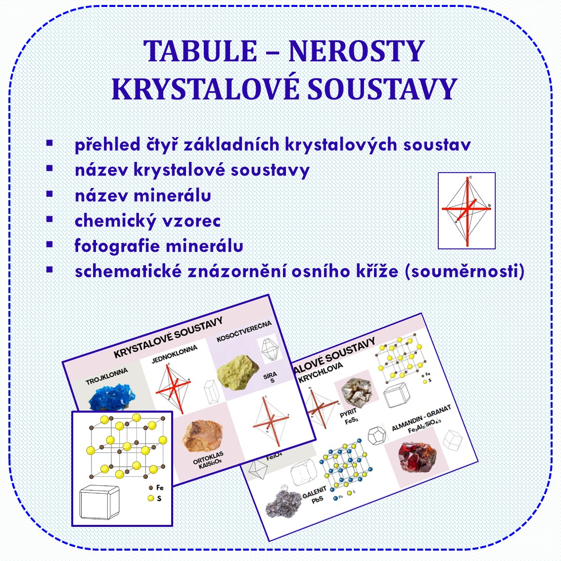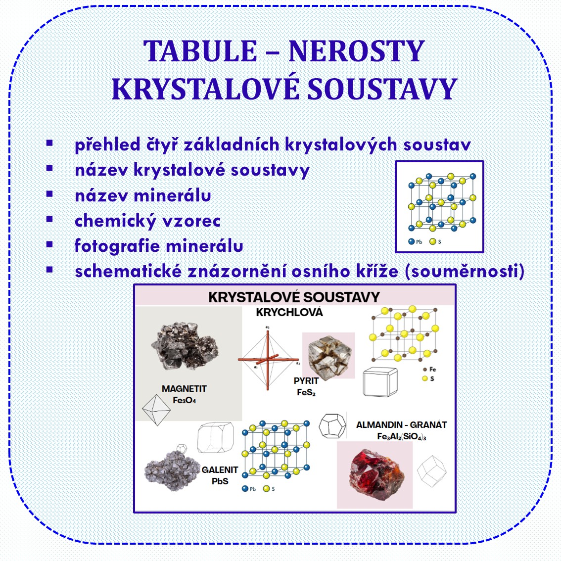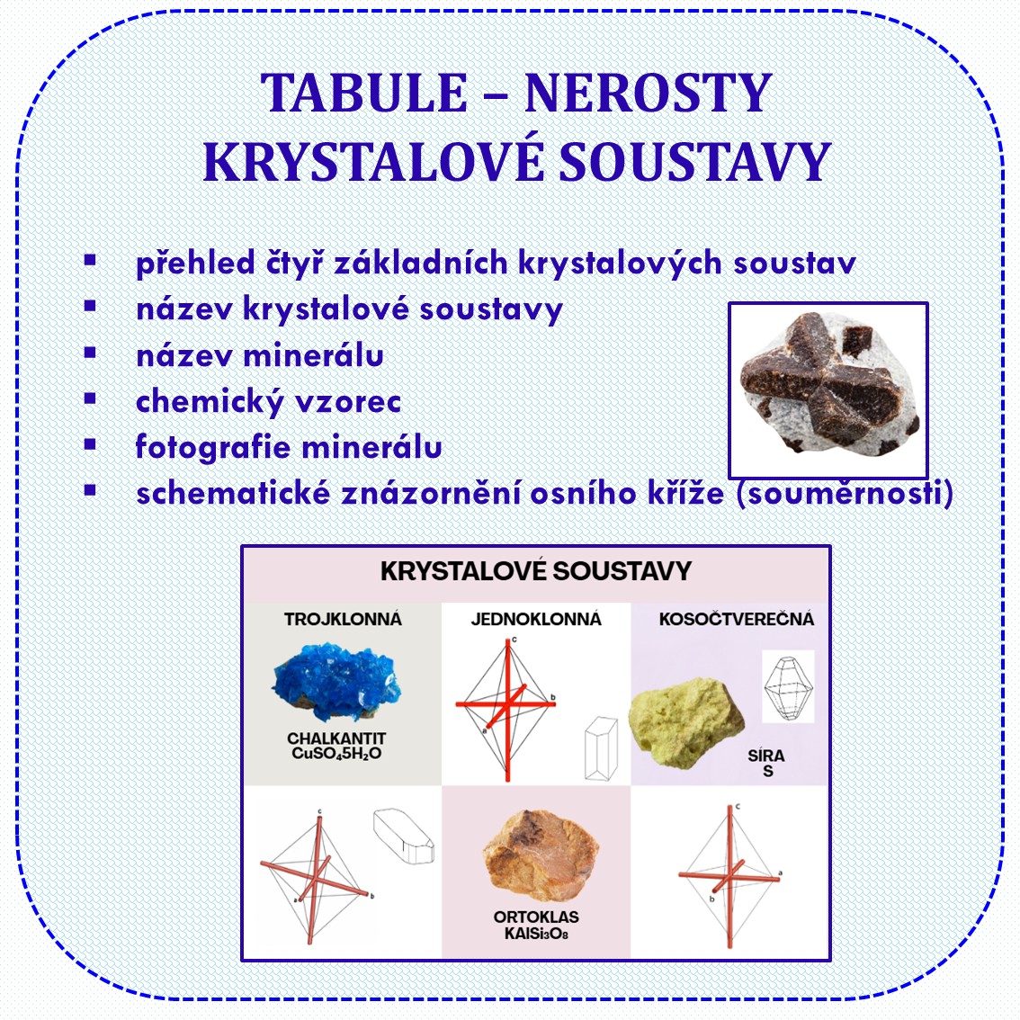 V materiálu naleznete čtyři hlavní krystalové soustavy – trojklonnou, jednoklonnou, kosočtverečnou a krychlovou. Jsou doplněné o fotografie minerálů - chalkantit, ortoklas, síra, galenit, pyrit, magnetit, almandin – granát a jednoduchá schémata osního kříže, která usnadňují pochopení souměrnosti krystalů.