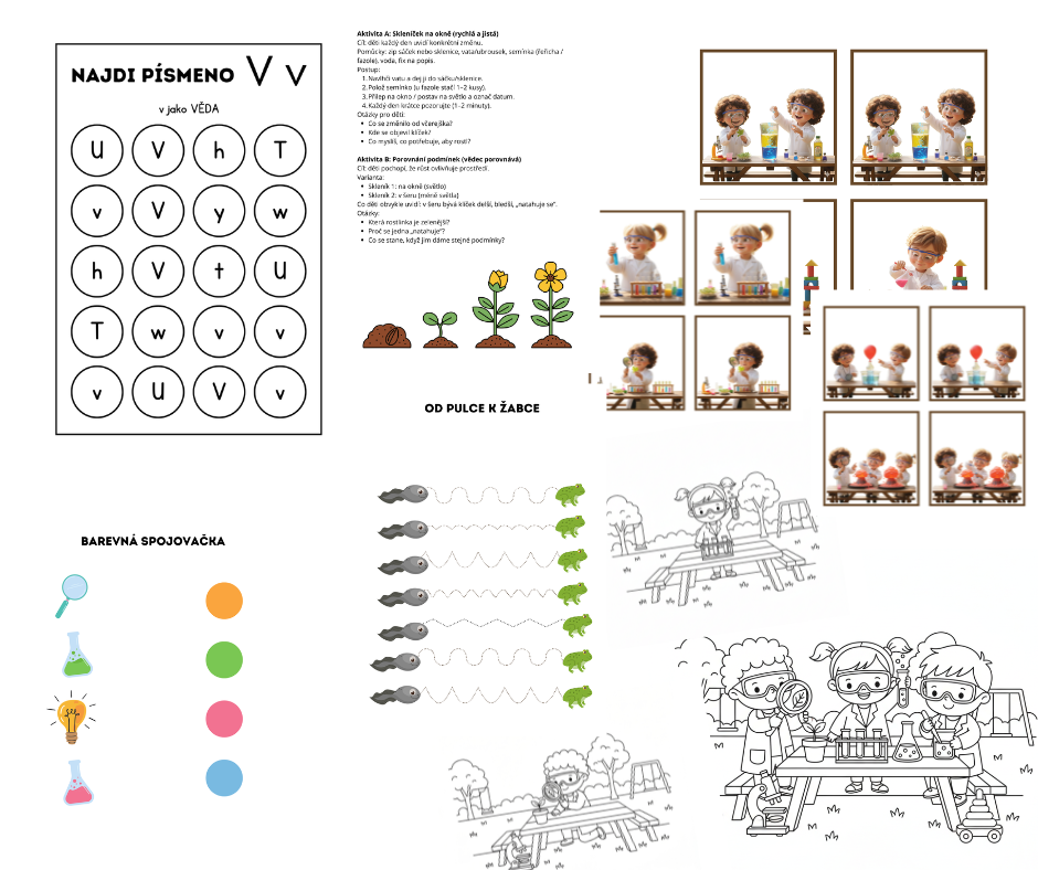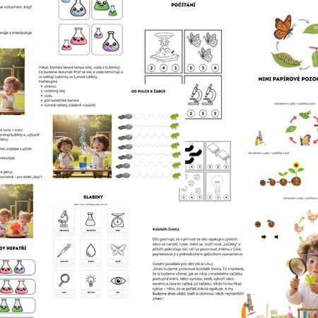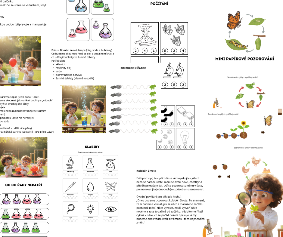 Materiál Vědci z naší školky – Hravá věda pro děti přináší učitelkám sadu jednoduchých, bezpečných a zábavných aktivit, díky kterým děti objevují svět vědy přirozeně a s nadšením. Obsahuje krátké úvodní povídání, vybrané pokusy s jasným postupem, část pozorování zaměřenou na přírodní cykly a navazující pracovní listy na rozvoj řeči, grafomotoriky, zrakové pozornosti, logiky i předmatematických dovedností. Vše je připravené tak, aby šlo snadno zařadit do běžného režimu mateřské školy bez složitých pomůcek a dlouhých příprav.