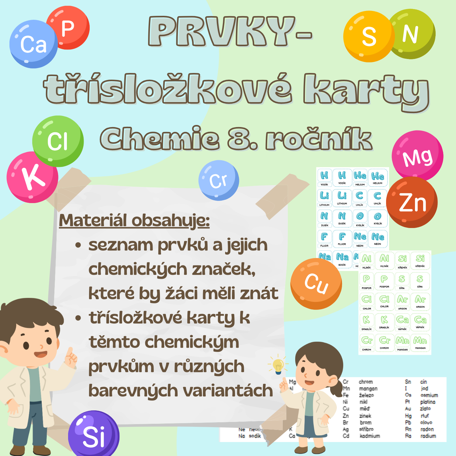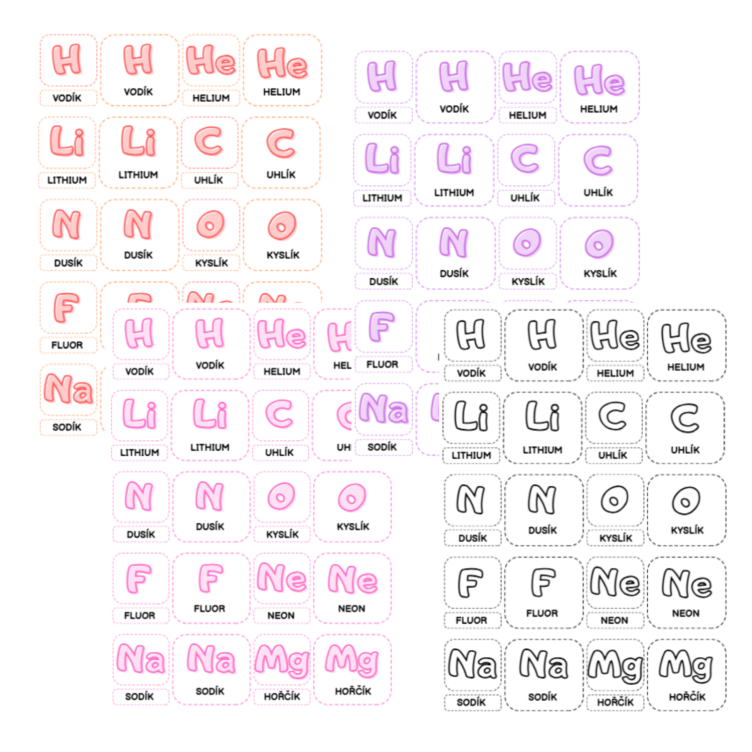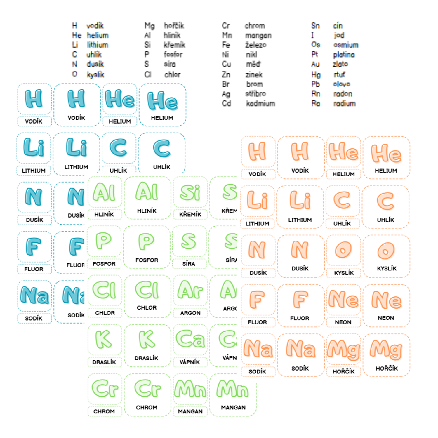 - třísložkové karty k těmto chemickým prvkům - barevné varianty: