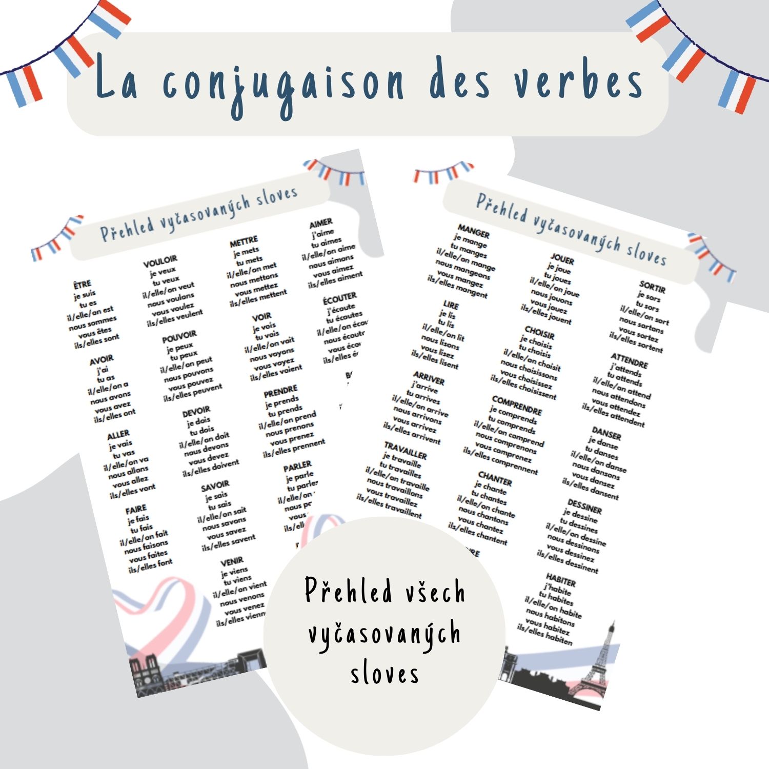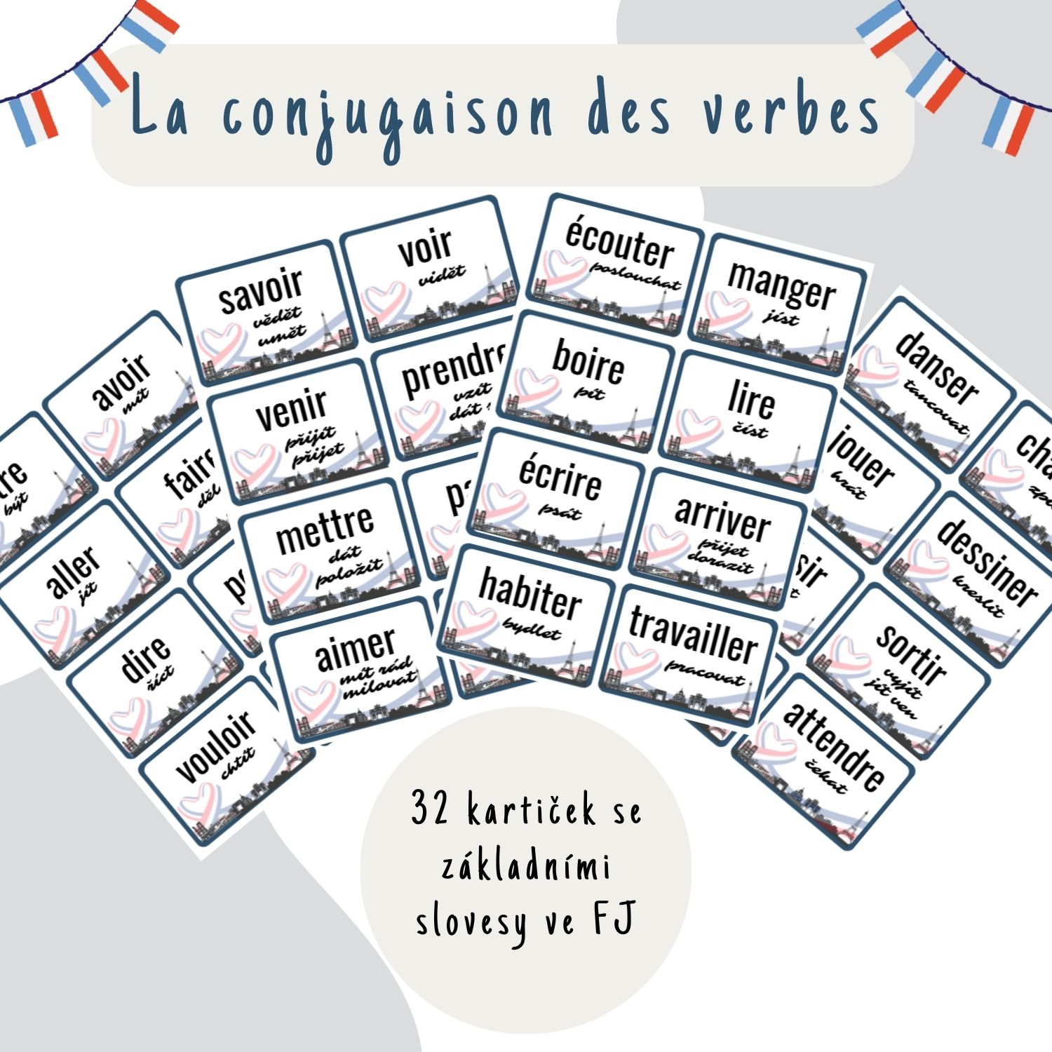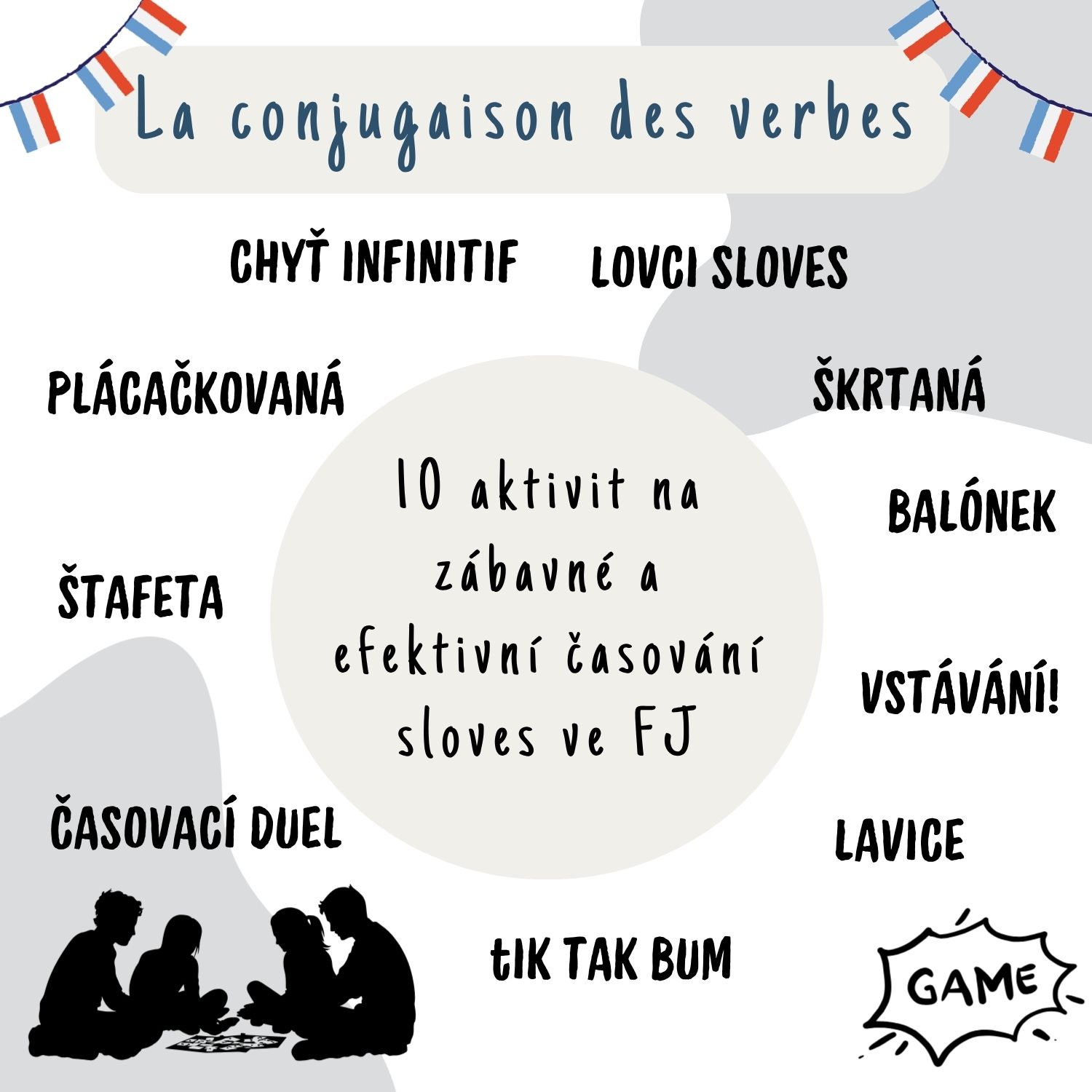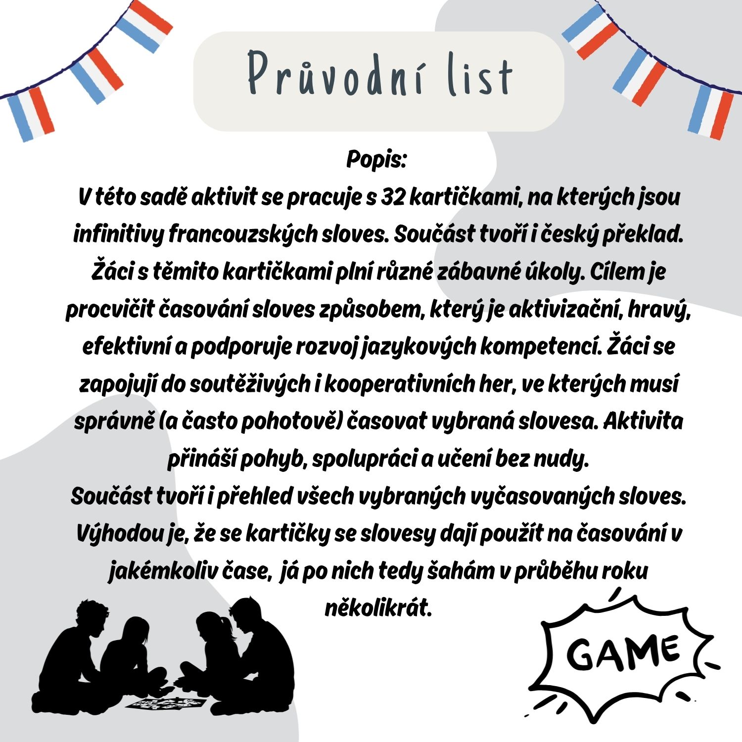 V této sadě aktivit se pracuje s 32 kartičkami, na kterých jsou infinitivy francouzských sloves. Součást tvoří i český překlad. Žáci s těmito kartičkami plní různé zábavné úkoly. Cílem je procvičit časování sloves způsobem, který je aktivizační, hravý, efektivní a podporuje rozvoj jazykových kompetencí. Žáci se zapojují do soutěživých i kooperativních her, ve kterých musí správně (a často pohotově) časovat vybraná slovesa. Aktivita přináší pohyb, spolupráci a učení bez nudy.