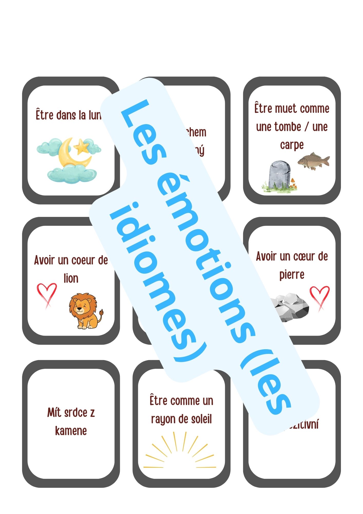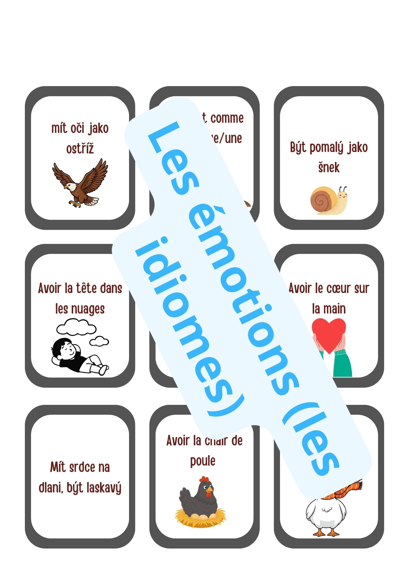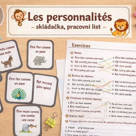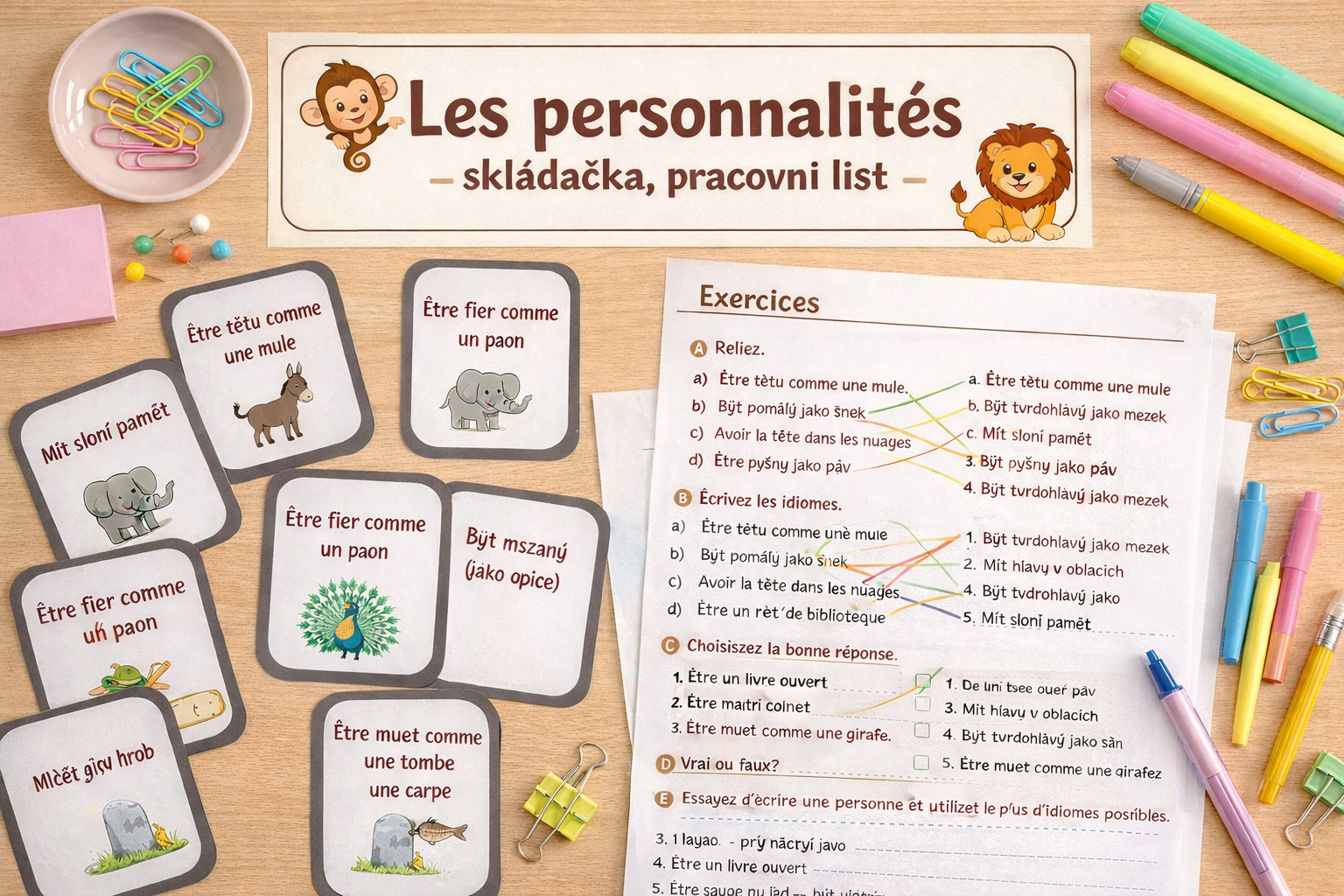 Materiál je zaměřen na osvojení francouzských idiomatických výrazů popisujících vlastnosti osobnosti a vybrané charakterové rysy. První část tvoří kartičková skládačka, ve které žáci přiřazují francouzské idiomy k jejich českým významům, případně k ilustracím. Druhou částí je pracovní list, jenž slouží k upevnění a aktivnímu procvičení nové slovní zásoby v kontextu vět.