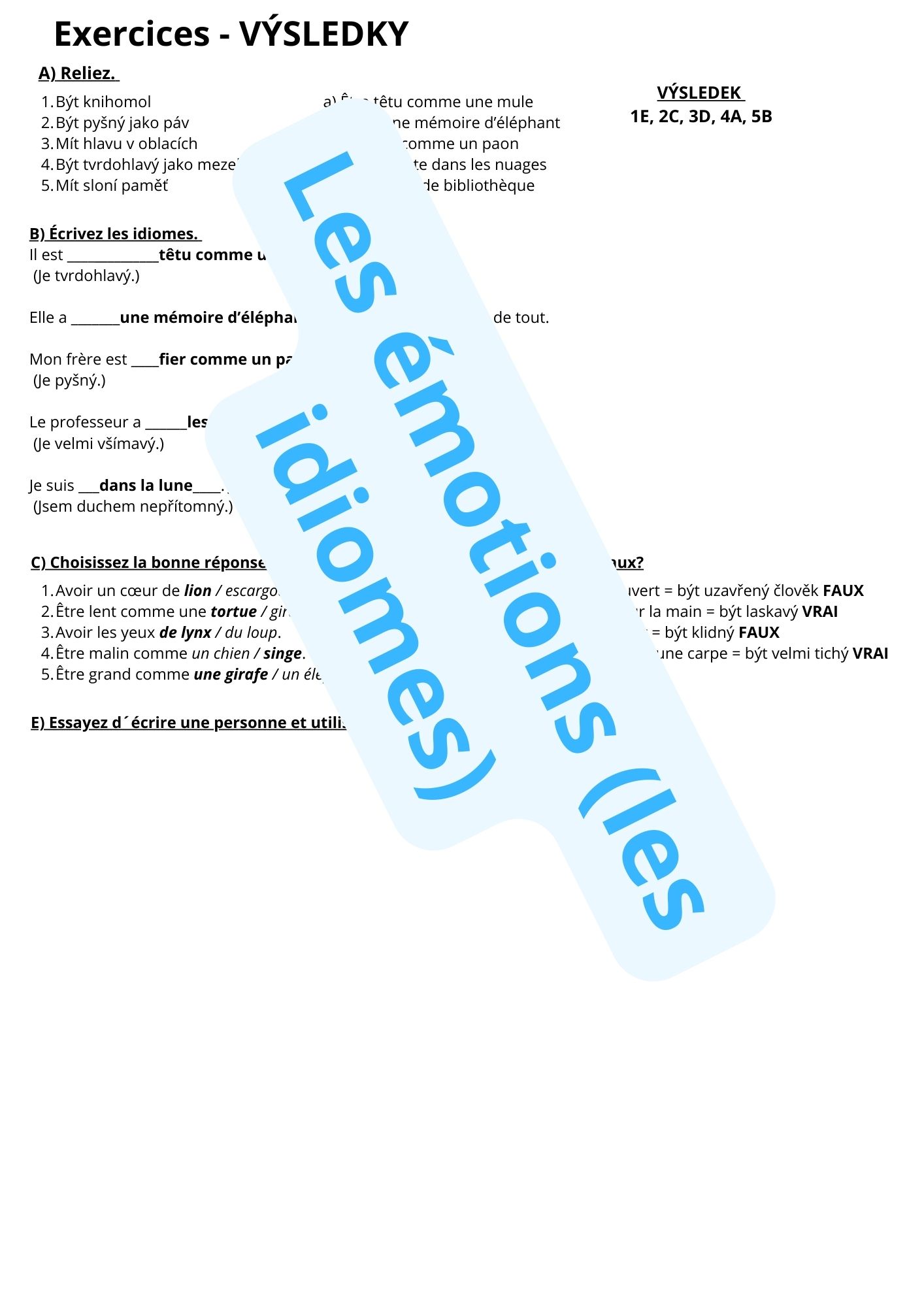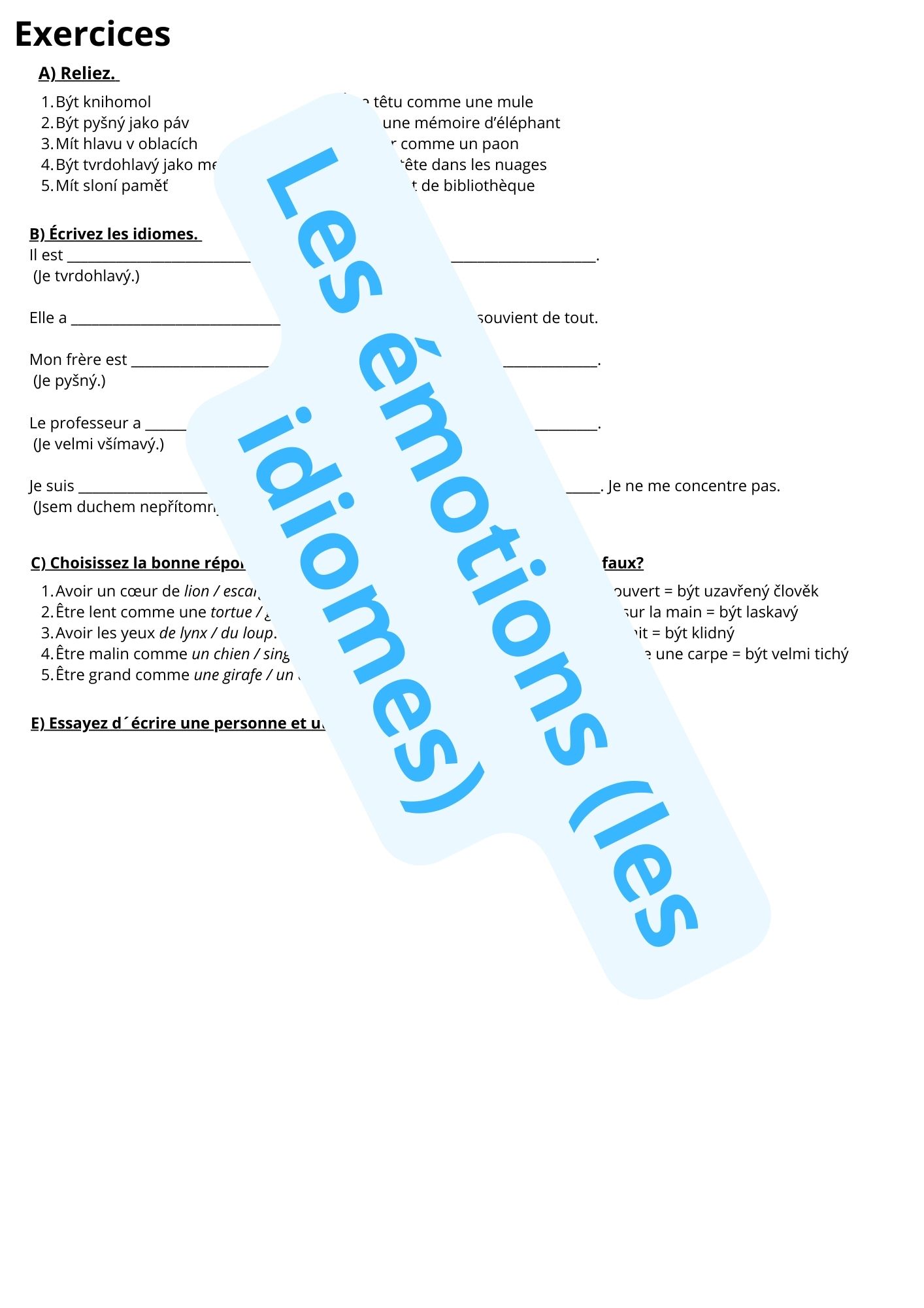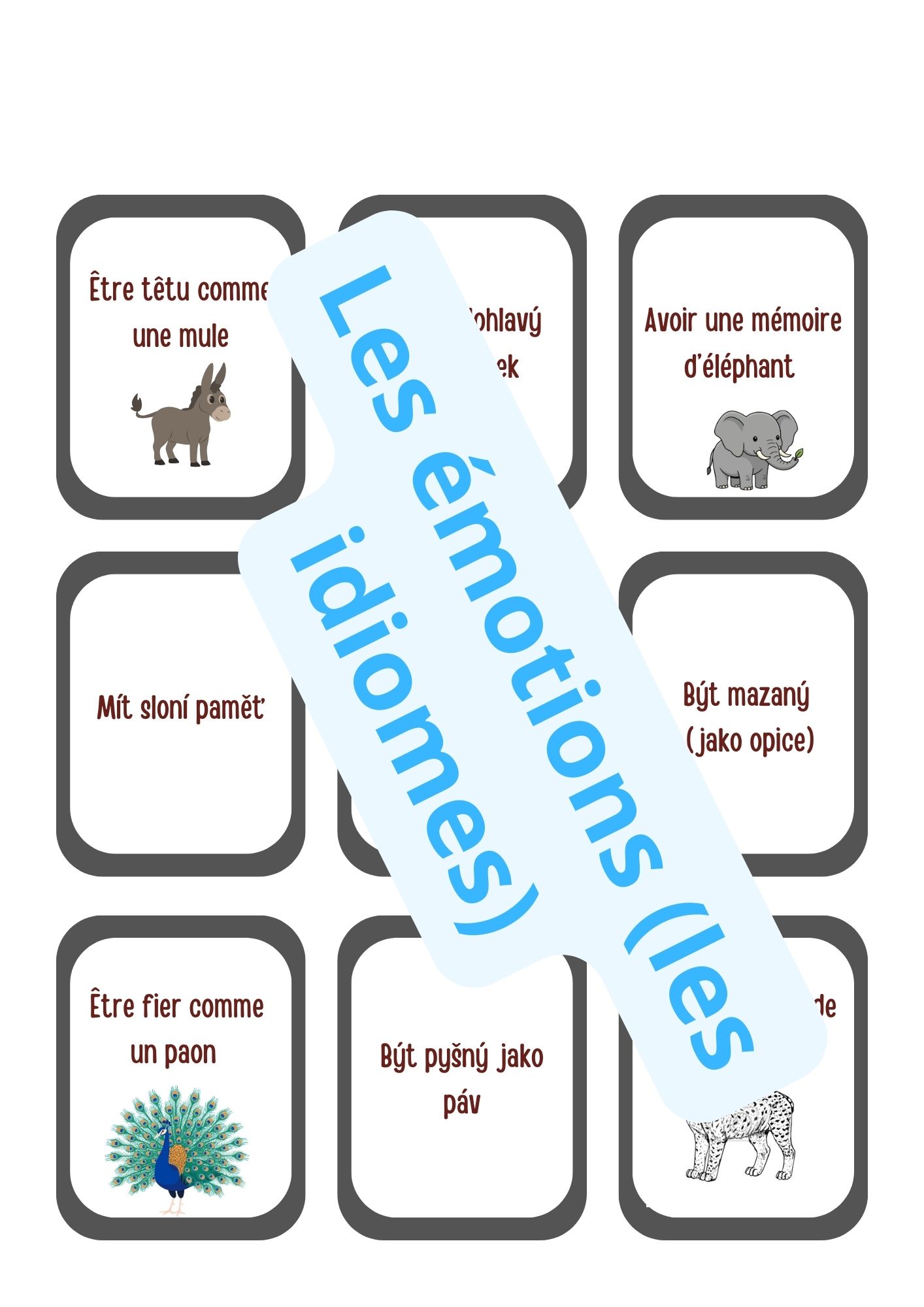 Materiál je zaměřen na osvojení francouzských idiomatických výrazů popisujících vlastnosti osobnosti a vybrané charakterové rysy. První část tvoří kartičková skládačka, ve které žáci přiřazují francouzské idiomy k jejich českým významům, případně k ilustracím. Druhou částí je pracovní list, jenž slouží k upevnění a aktivnímu procvičení nové slovní zásoby v kontextu vět.