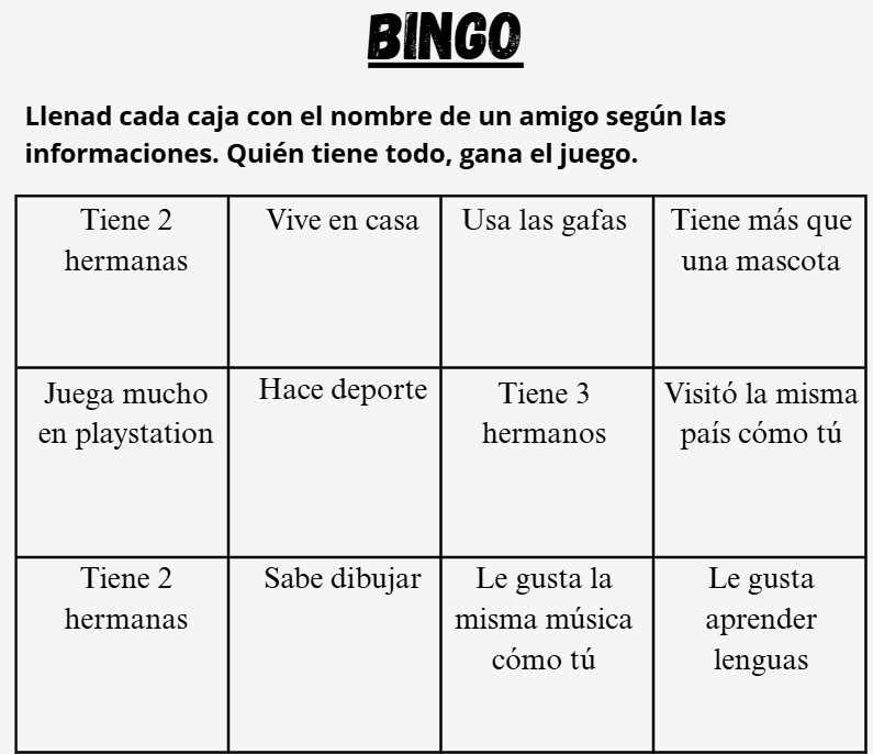 * 1 strana pohybové hry bingo se shrnutím informací o kamarádech
