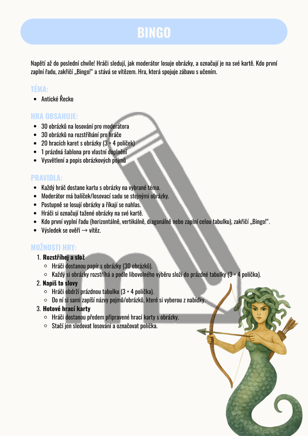 Napětí až do poslední chvíle! Hráči sledují, jak moderátor losuje obrázky, a označují je na své kartě. Kdo první zaplní řadu, zakřičí „Bingo!“ a stává se vítězem. Hra, která spojuje zábavu s učením.