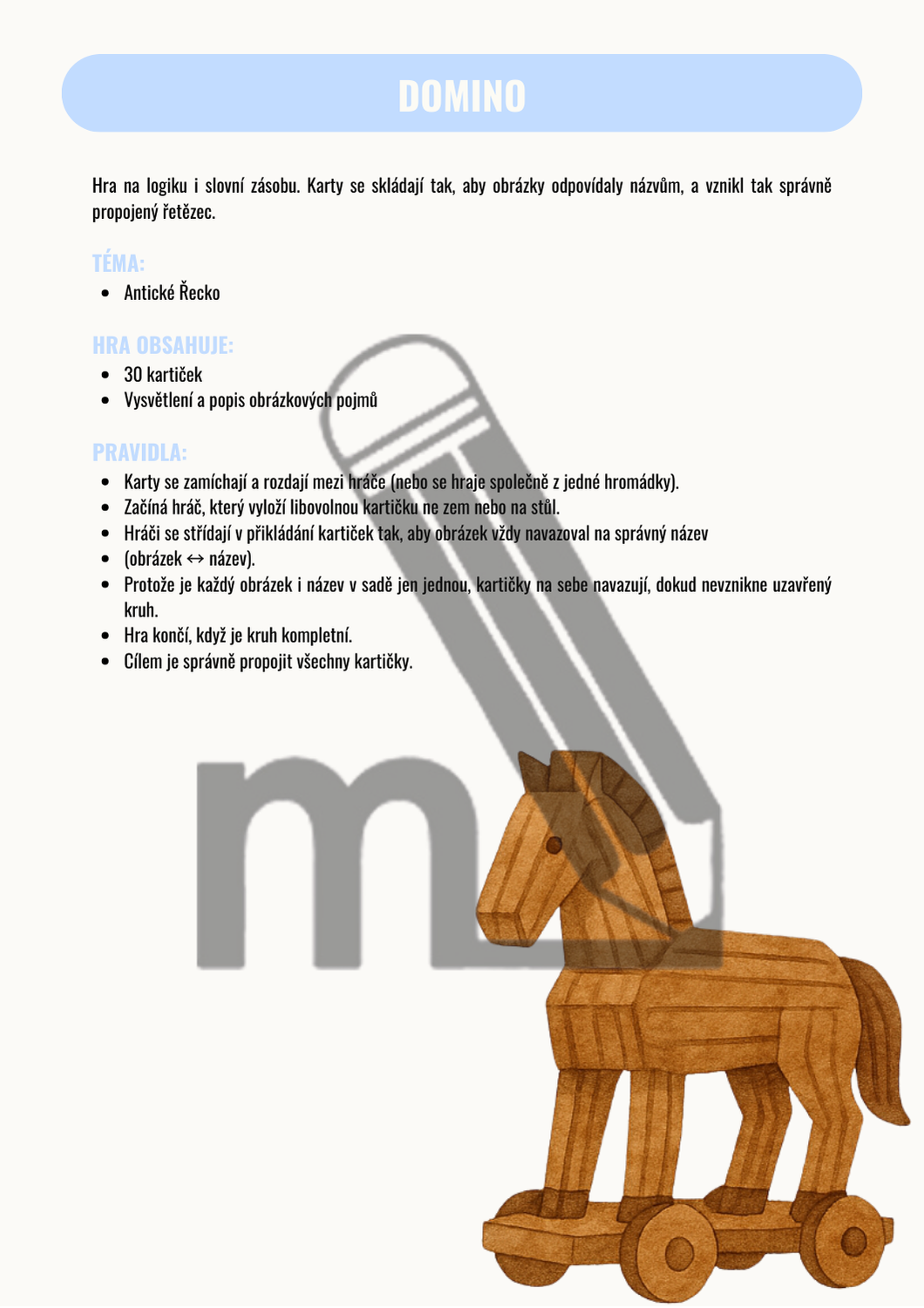 Hra na logiku i slovní zásobu. Karty se skládají tak, aby obrázky odpovídaly názvům, a vznikl tak správně propojený řetězec.