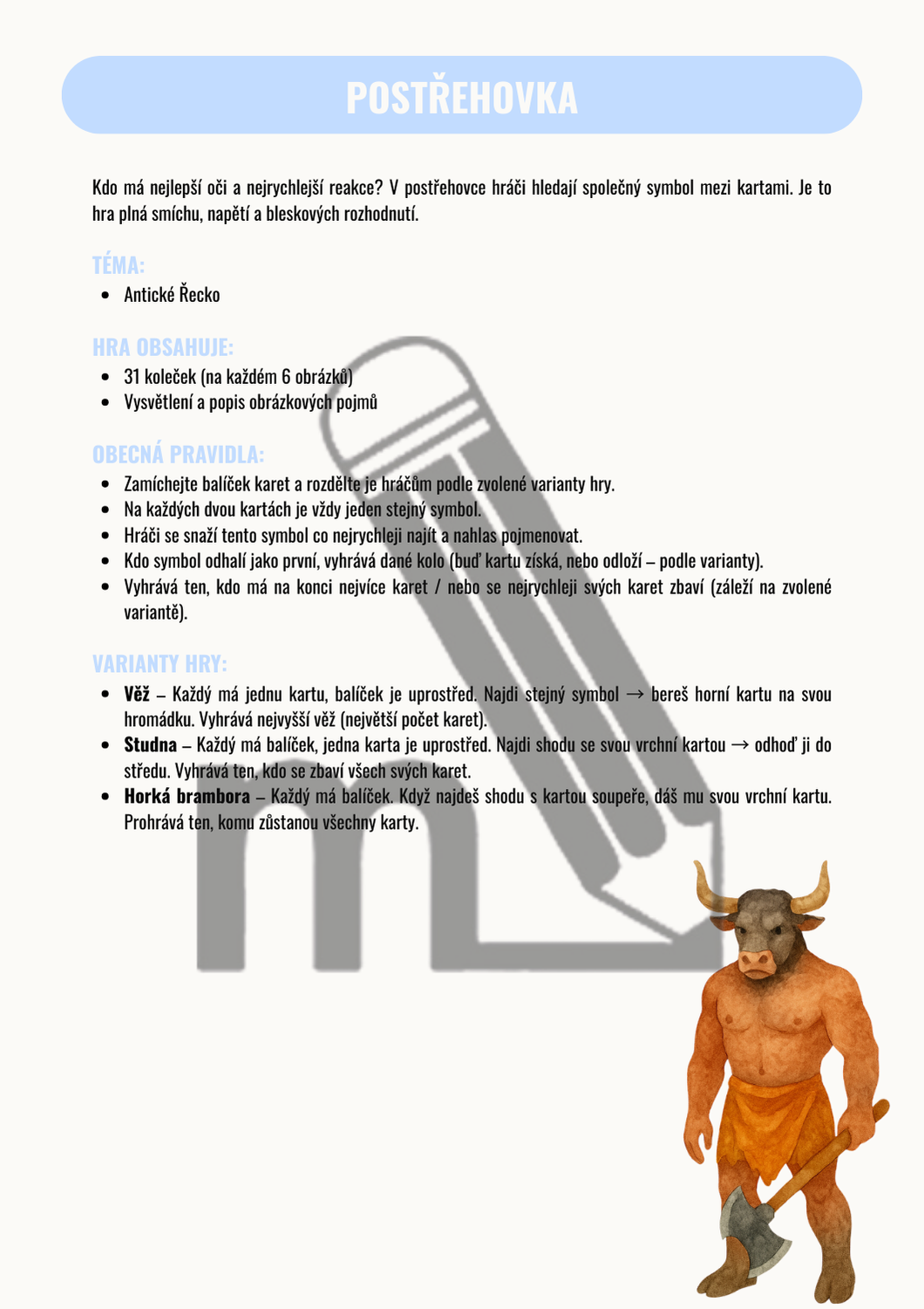 Kdo má nejlepší oči a nejrychlejší reakce? V postřehovce hráči hledají společný symbol mezi kartami. Je to hra plná smíchu, napětí a bleskových rozhodnutí.
