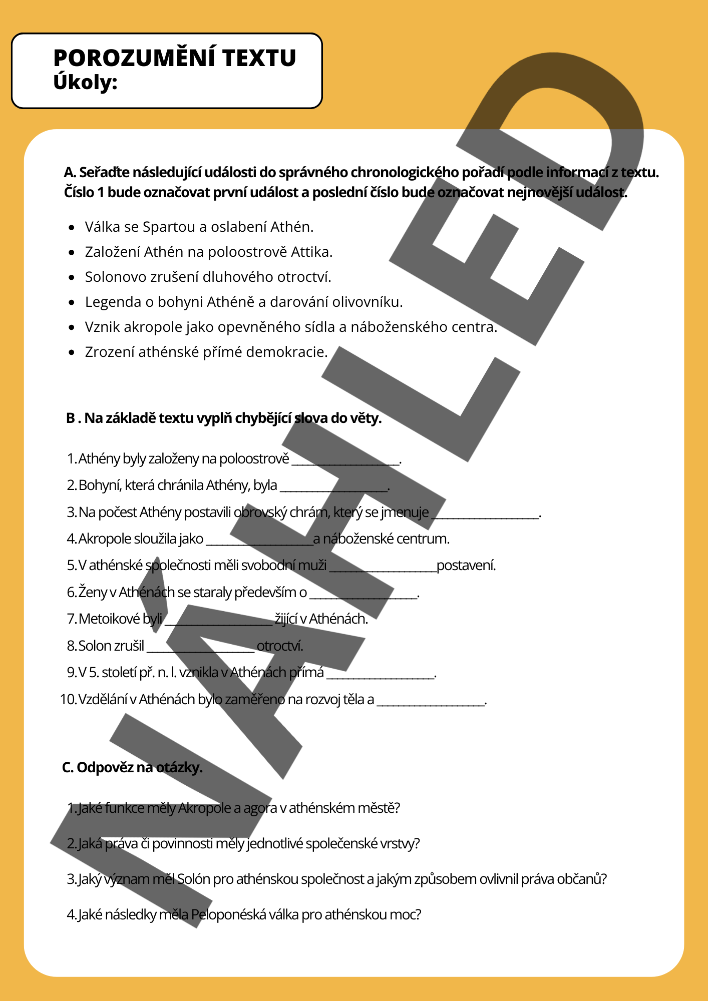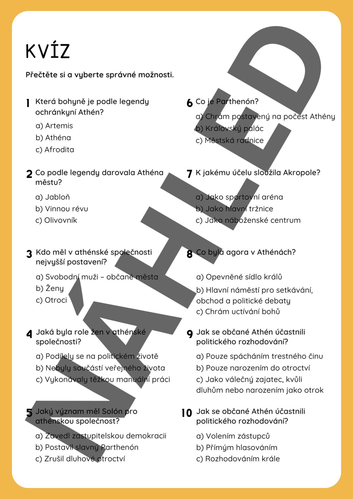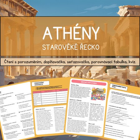 Cílem materiálu je seznámit žáky se vznikem a fungováním městského státu Athén. Pracovní list je zaměřený na čtení s porozuměním a obsahuje různorodé aktivity - doplňovačka, ověřovací otázky, seřazovačka, porovnávací tabulka, kvíz.