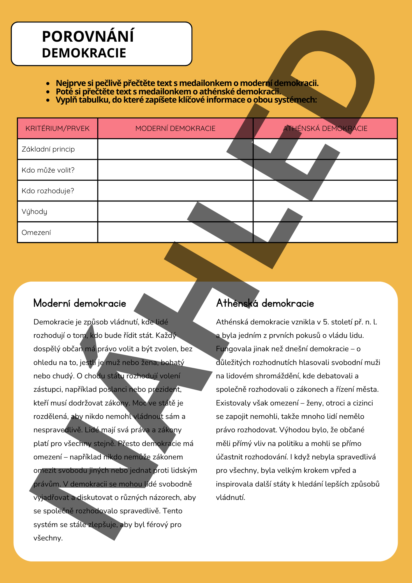 • Demokracie: Žáci si přečtou medailonky o demokracii v Aténách a demokracii dnes a na jeho základě vyplní porovnávací tabulku.