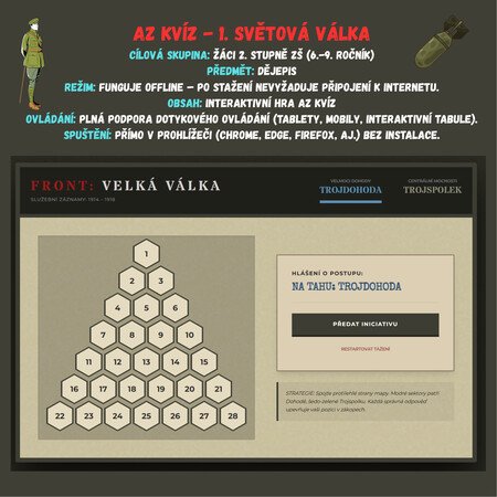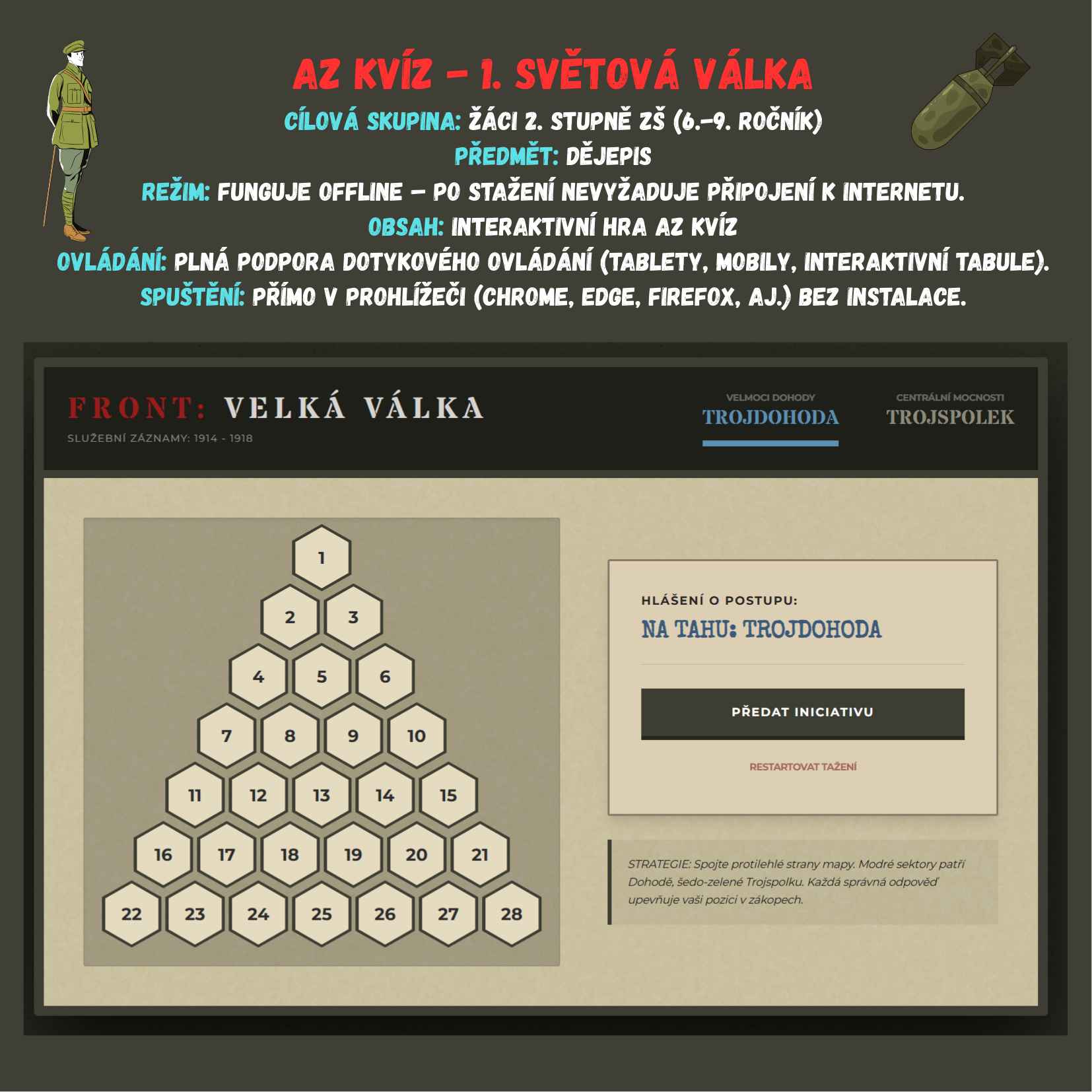 - Zaměření: Digitální vzdělávací hra zaměřená na procvičování učiva o „Velké válce“ z let 1914–1918.