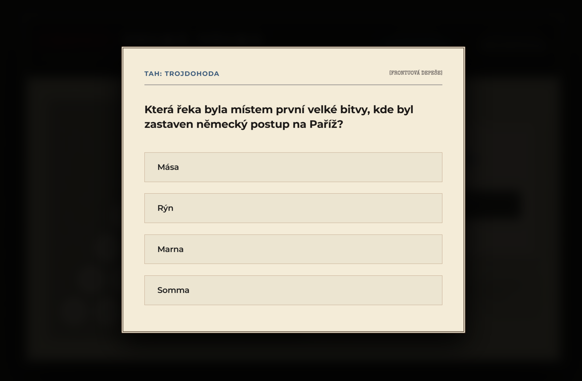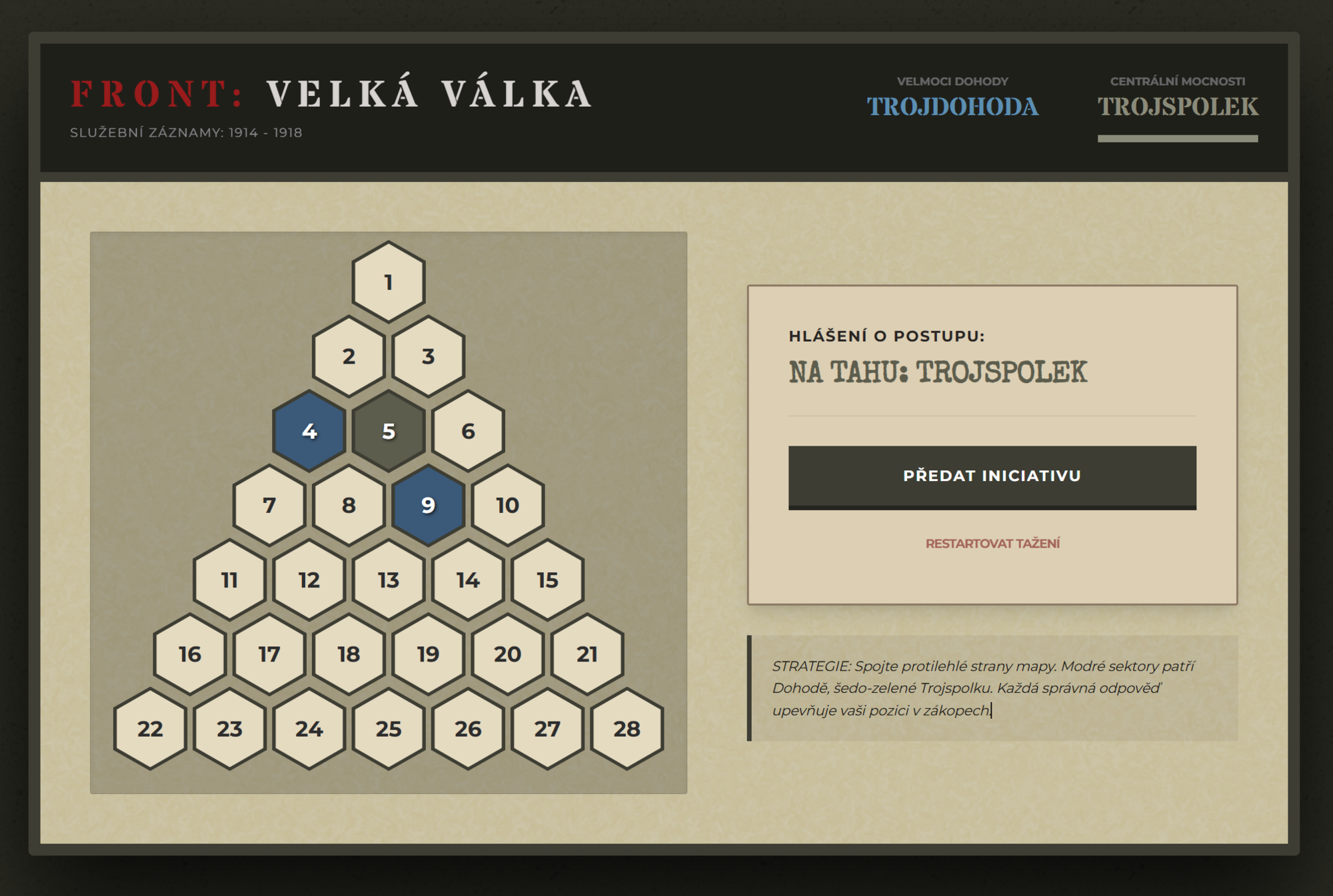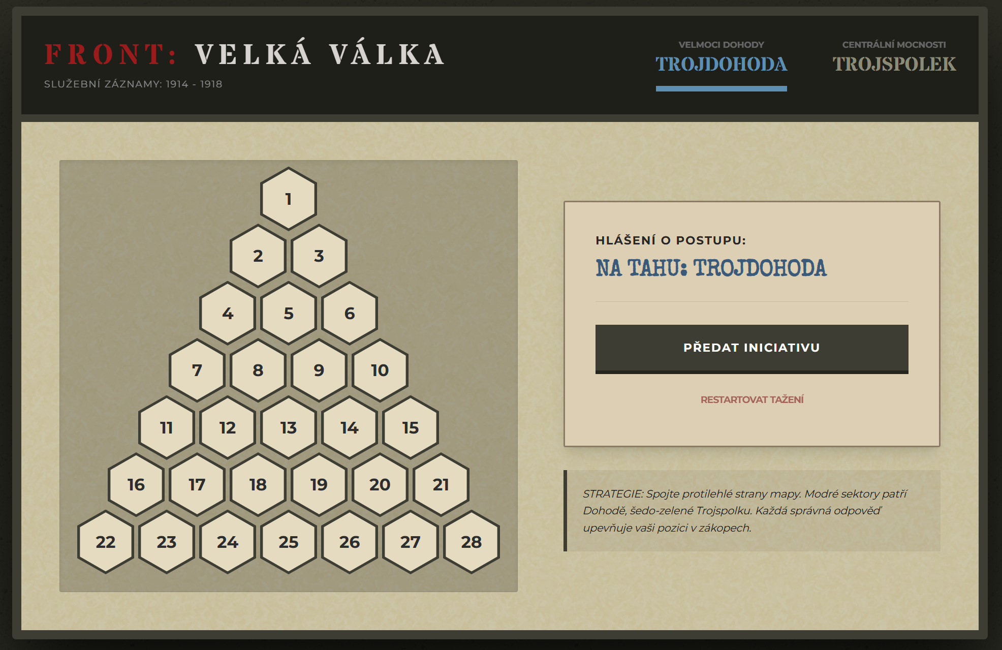 - Princip: Dvě strany – Trojdohoda (modrá) a Trojspolek (šedo-zelená) – soupeří o pole v hexagonální mřížce. Každá správná odpověď na historickou otázku upevňuje pozici týmu v „zákopech“ a umožní mu obsadit daný sektor.