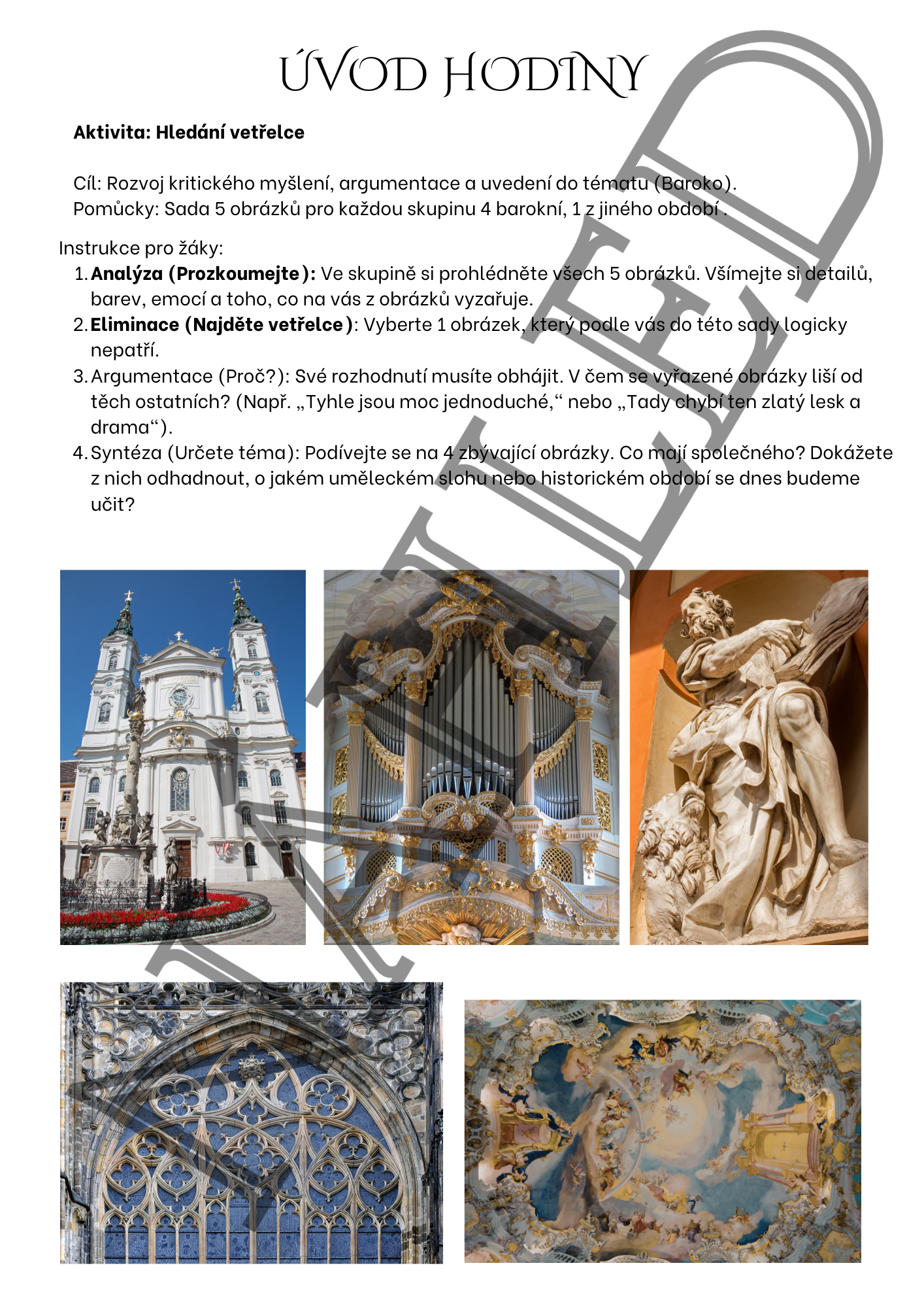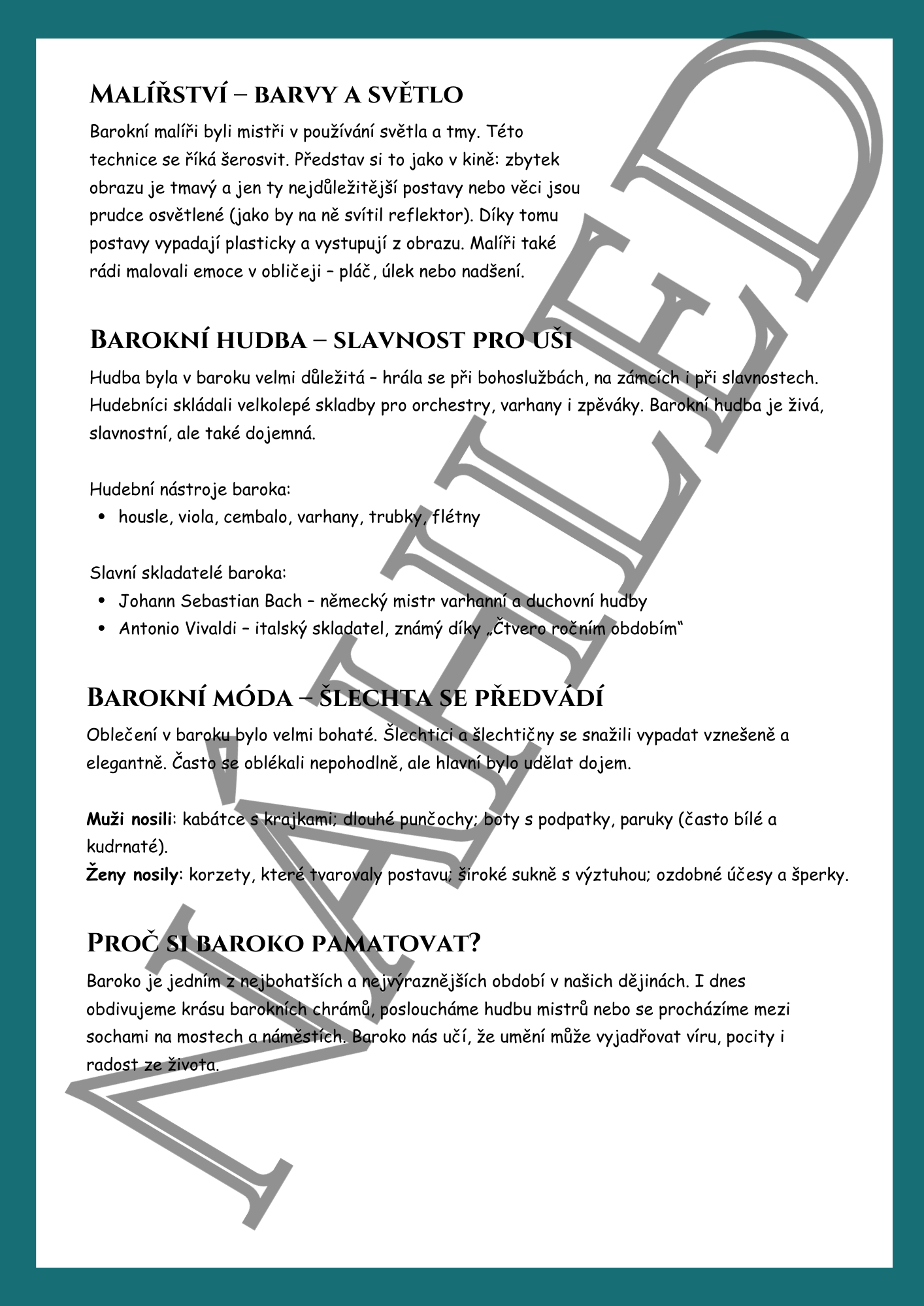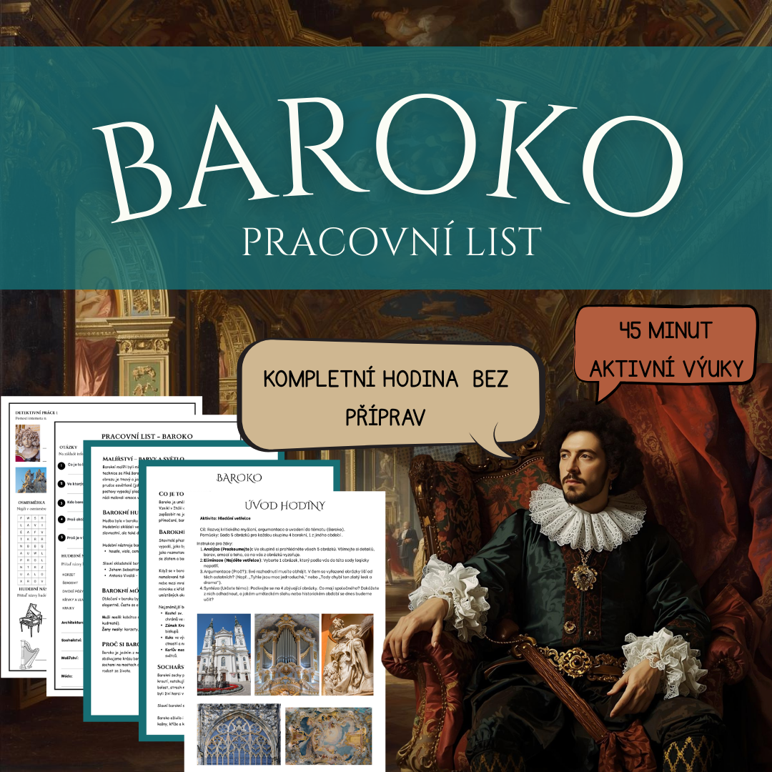 Hotová výuková jednotka k tématu baroko pro 7.–8. třídu ZŠ (případně nižší gymnázium). Materiál je koncipován jako 45minutová aktivní hodina, kterou stačí vytisknout a učit.
