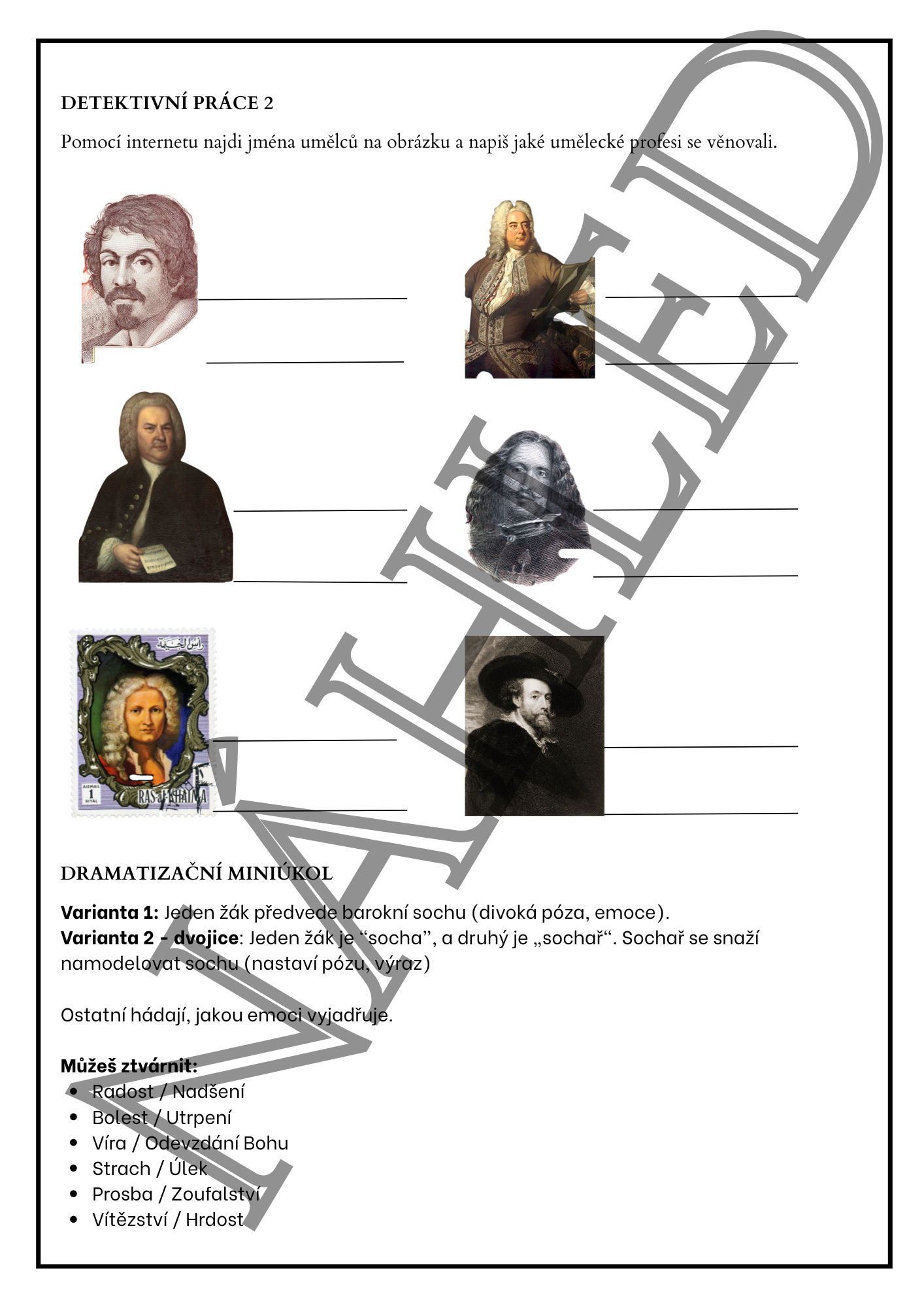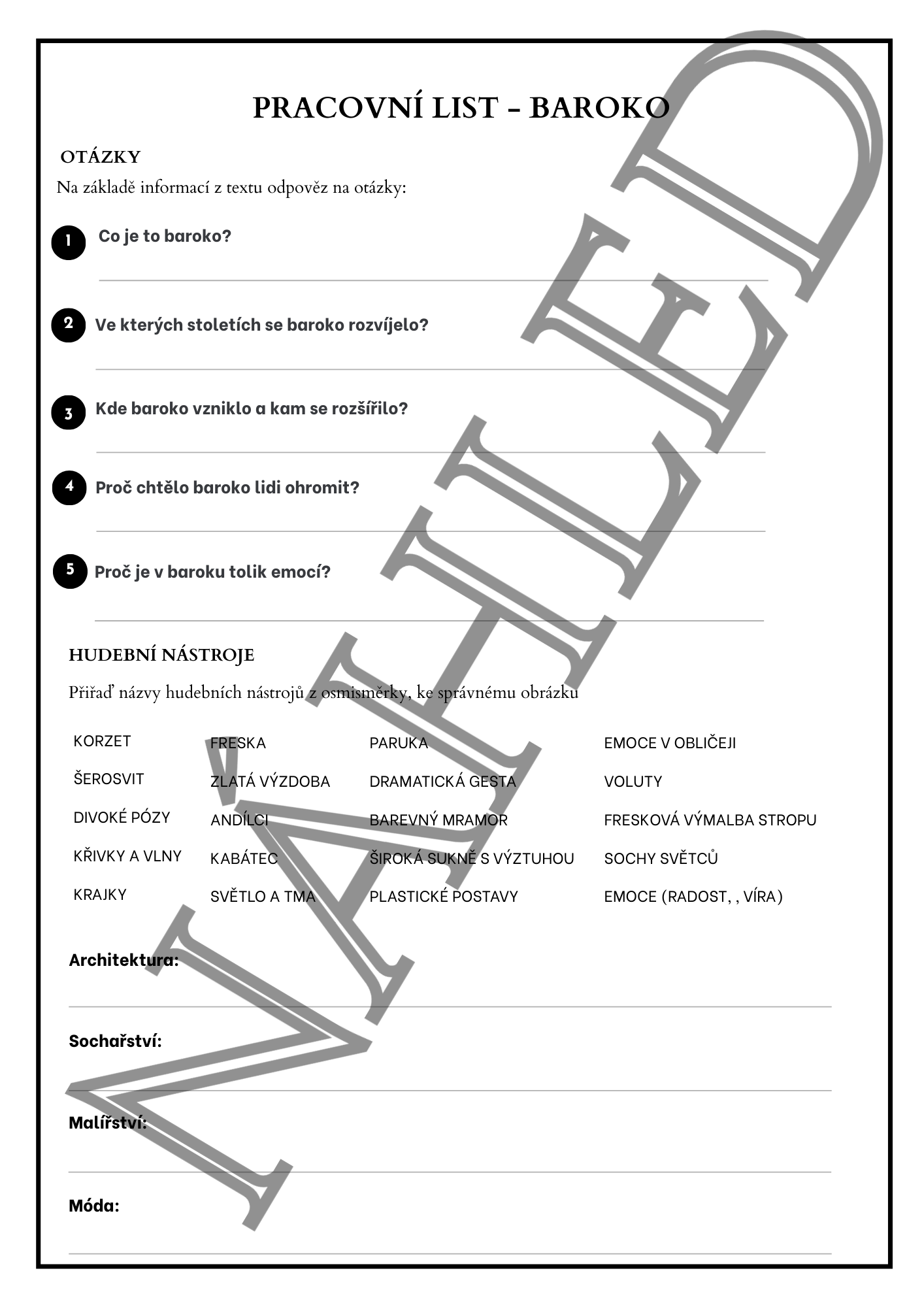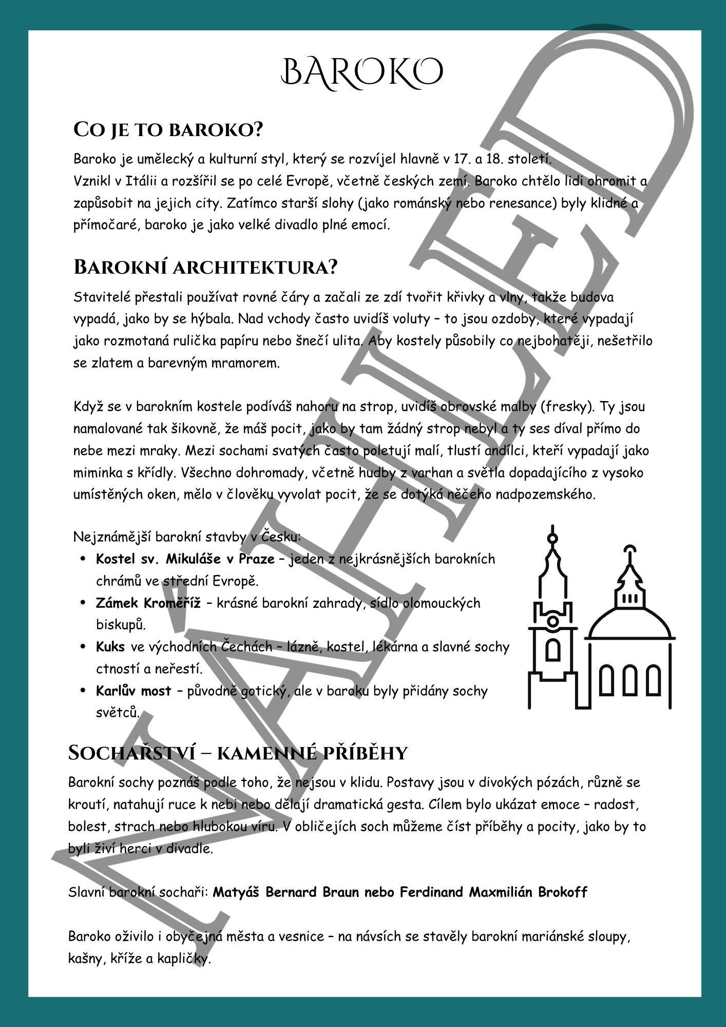Hotová výuková jednotka k tématu baroko pro 7.–8. třídu ZŠ (případně nižší gymnázium). Materiál je koncipován jako 45minutová aktivní hodina, kterou stačí vytisknout a učit.