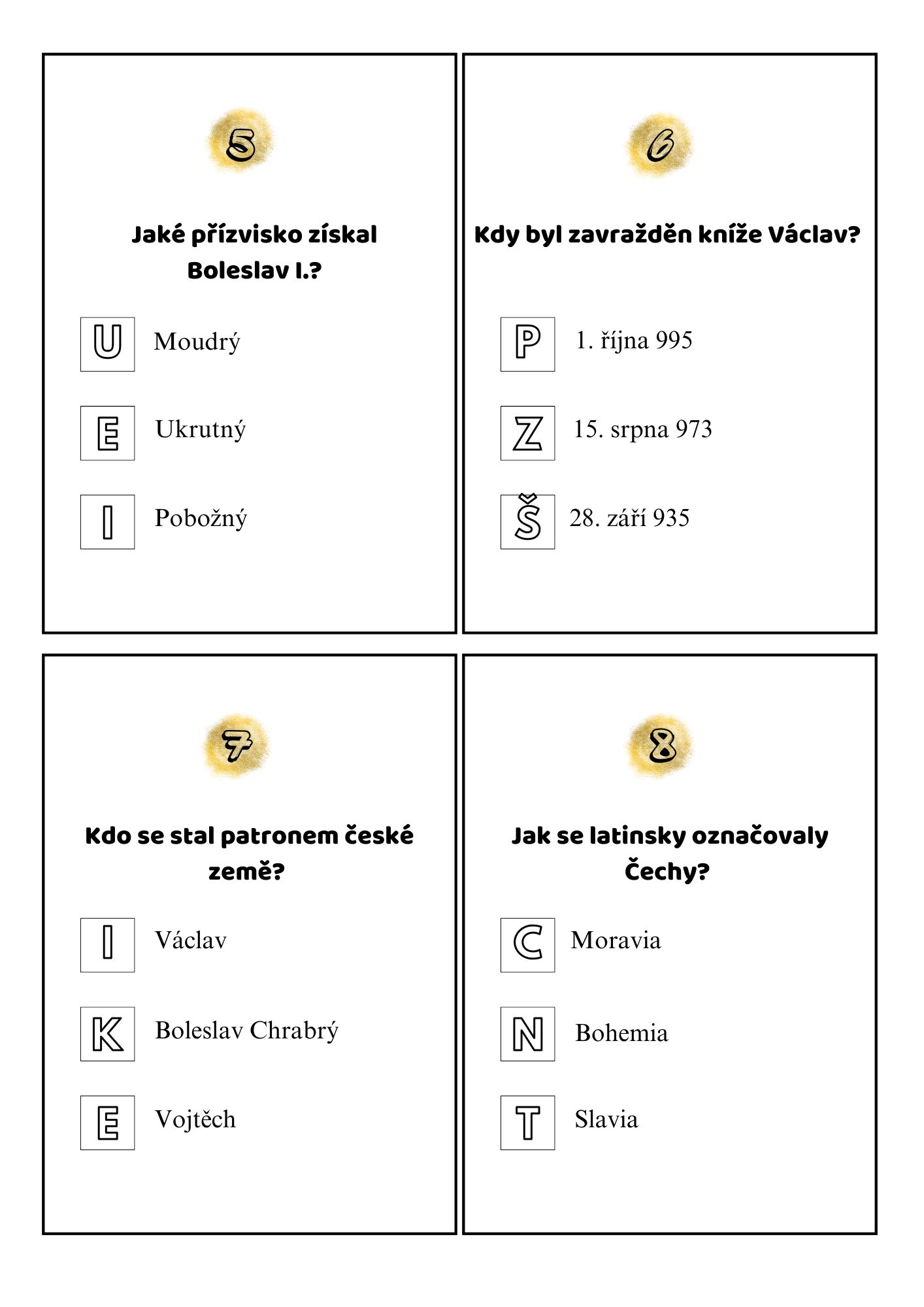 Materiál obsahuje 14 kvízových karet na zopakování učiva o Čechách v době knížecí.