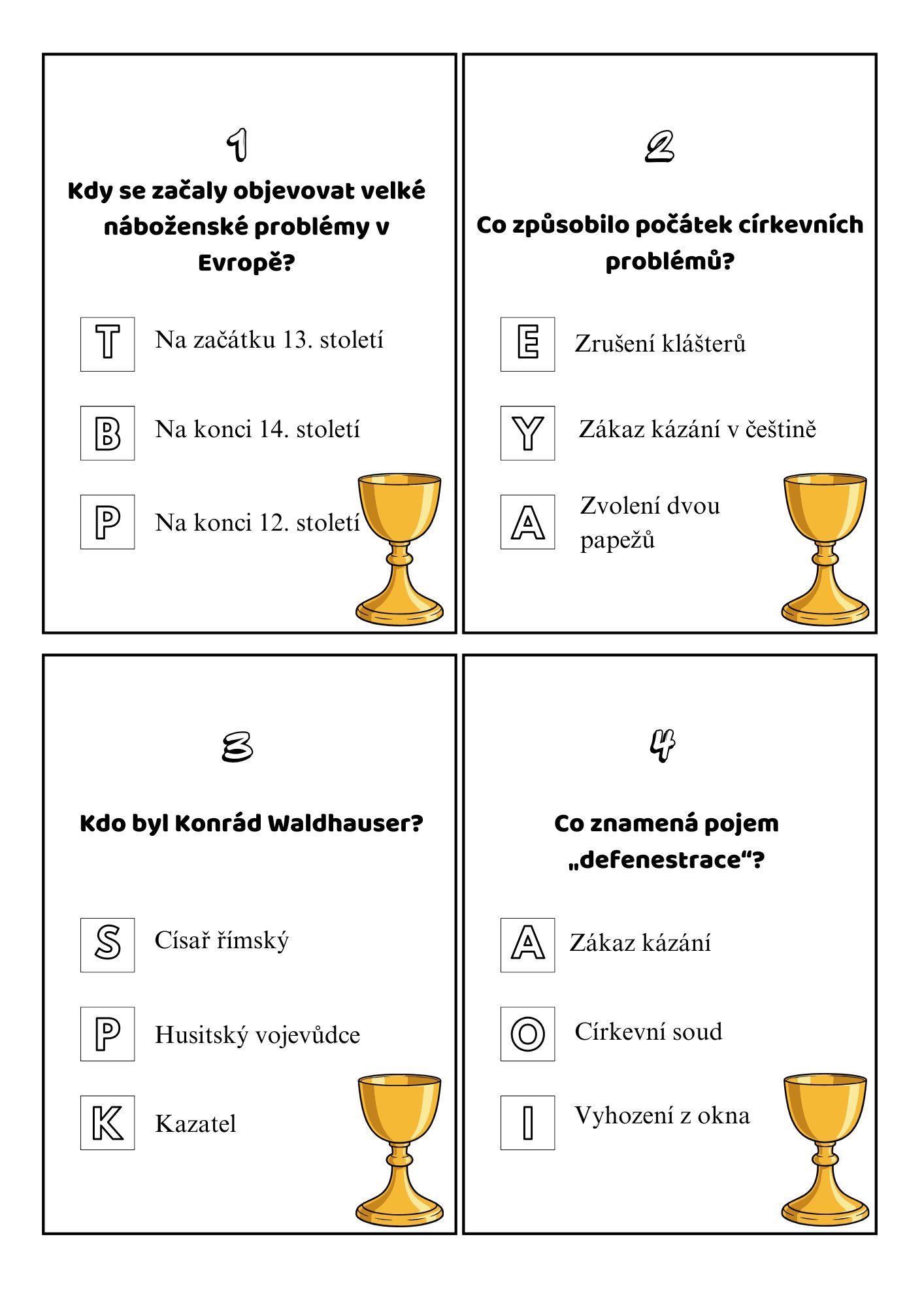 Materiál obsahuje 20 kvízových karet na zopakování učiva o husitství. Soubor obsahuje i záznamový arch.