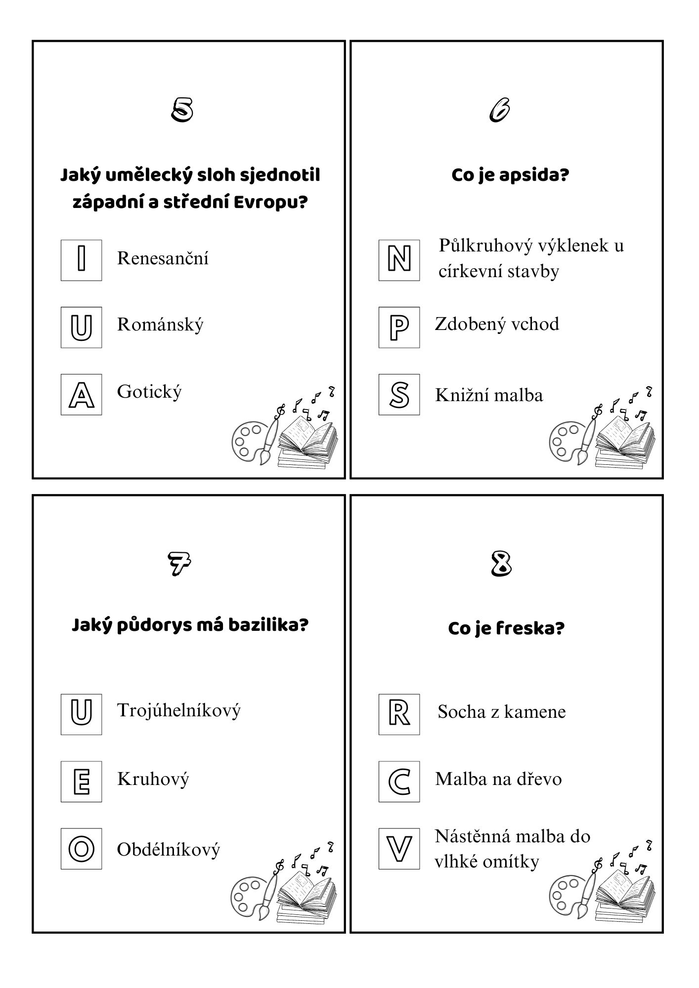 Materiál obsahuje 15 kvízových karet na zopakování učiva o kultuře raného středověku. Součástí je i záznamový arch. Materiál je určen primárně do hodin dějepisu pro žáky 7. třídy.