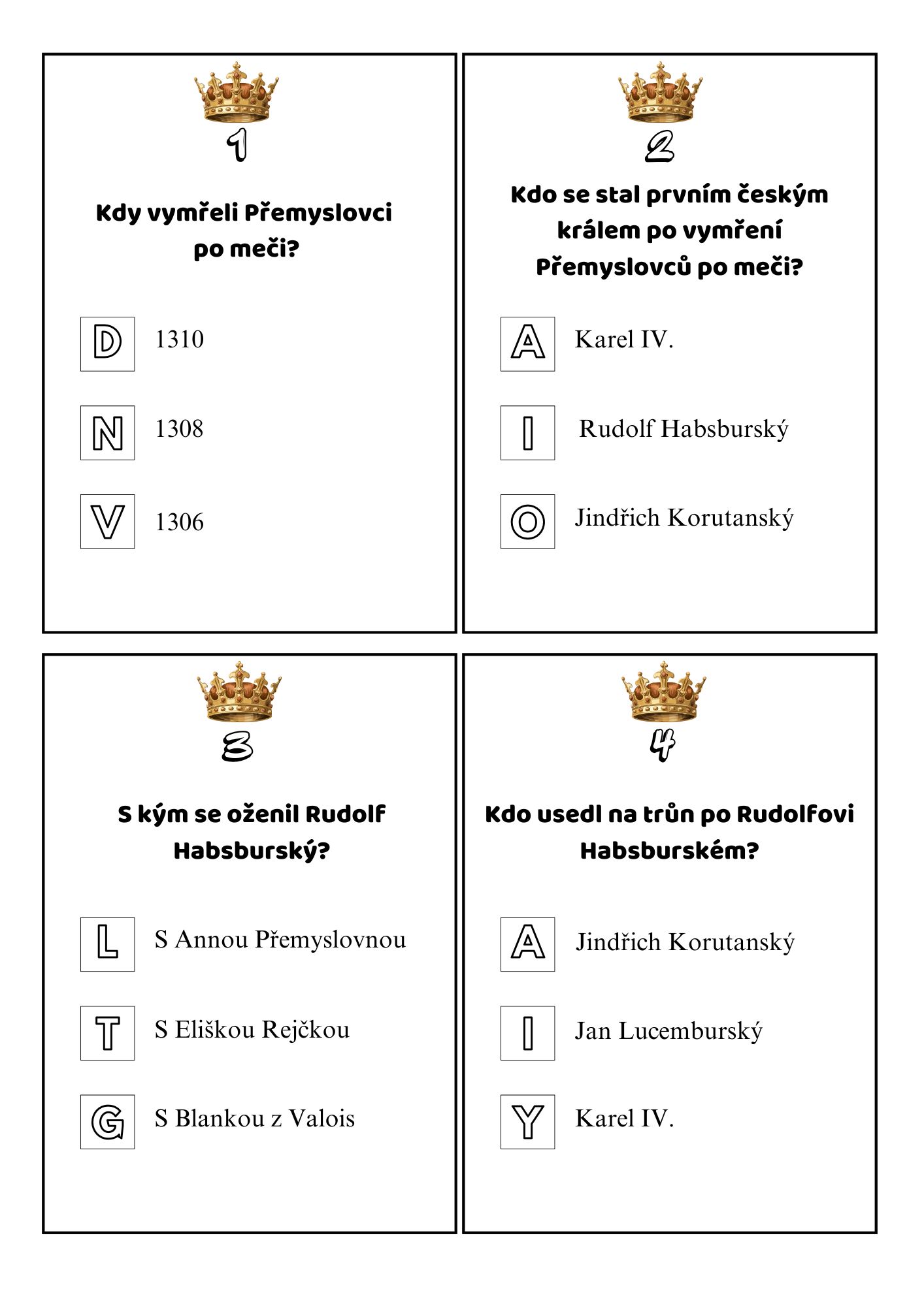 Materiál obsahuje 31 kvízových karet na zopakování učiva o rodu Lucemburků. Součástí je i záznamový arch.