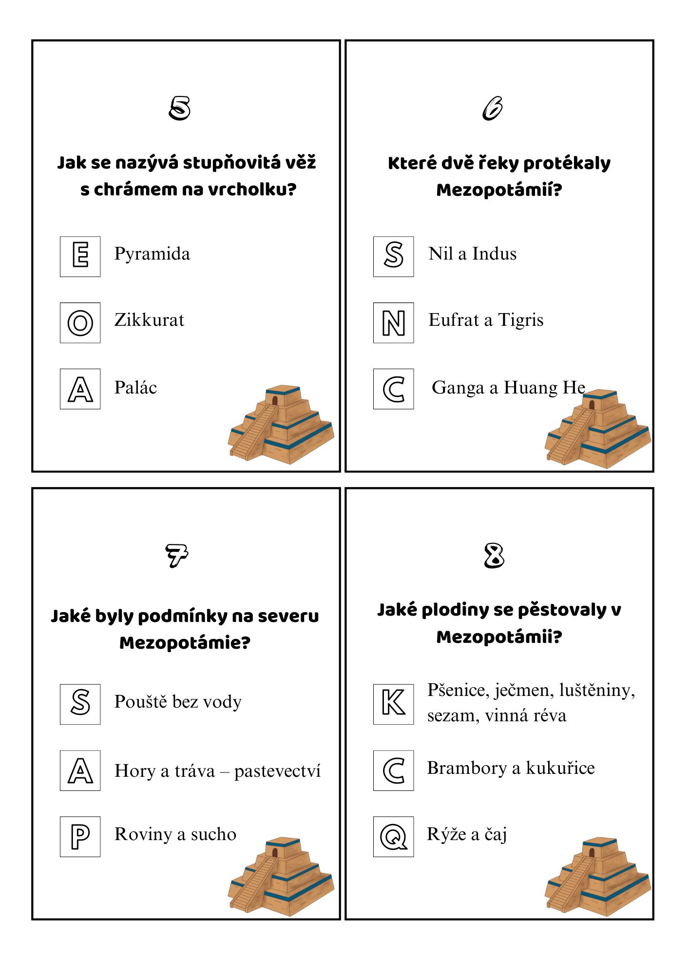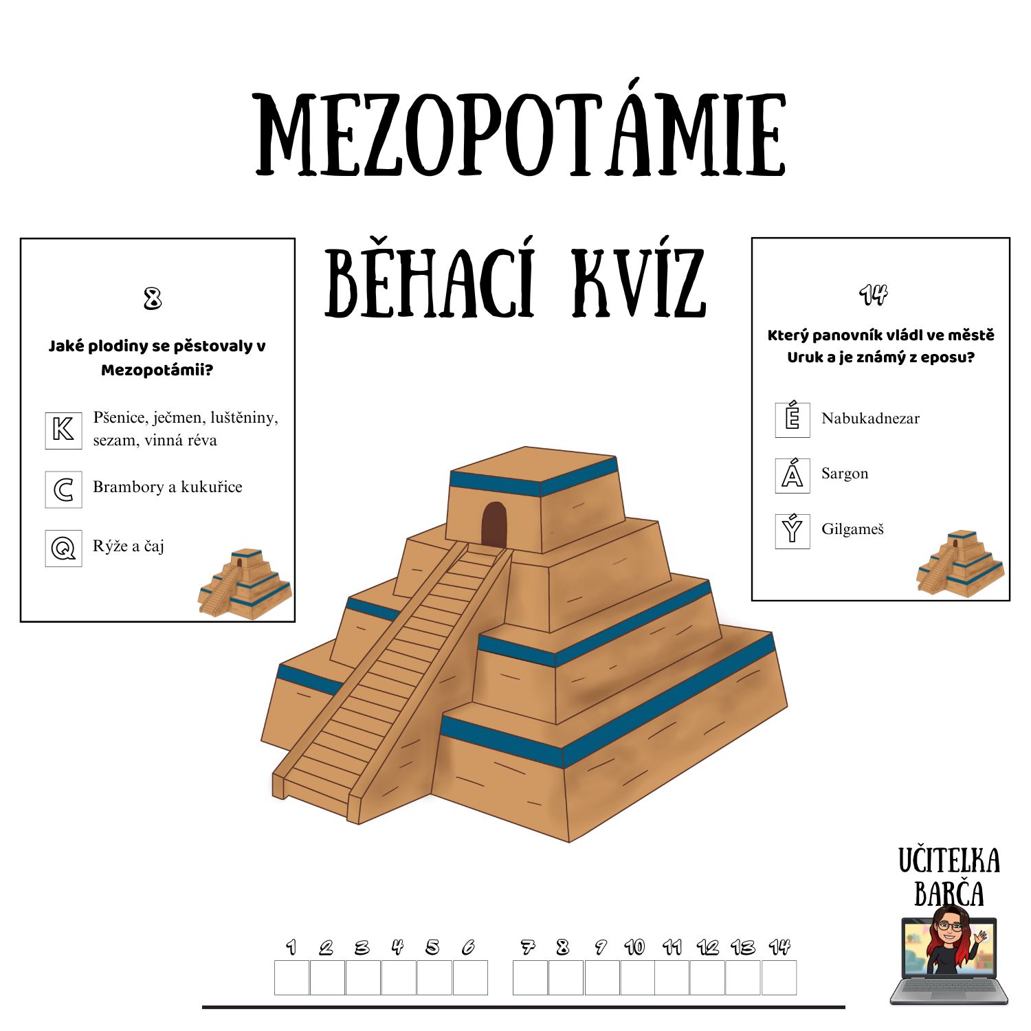 Materiál obsahuje 14 kvízových karet na zopakování učiva o starověké Mezopotámii. Součástí je i záznamový arch.