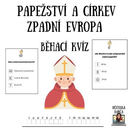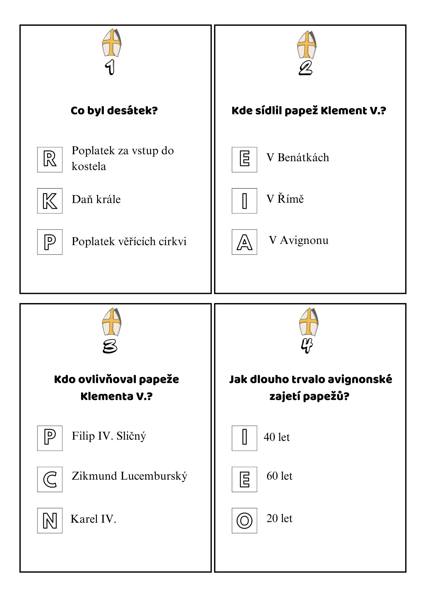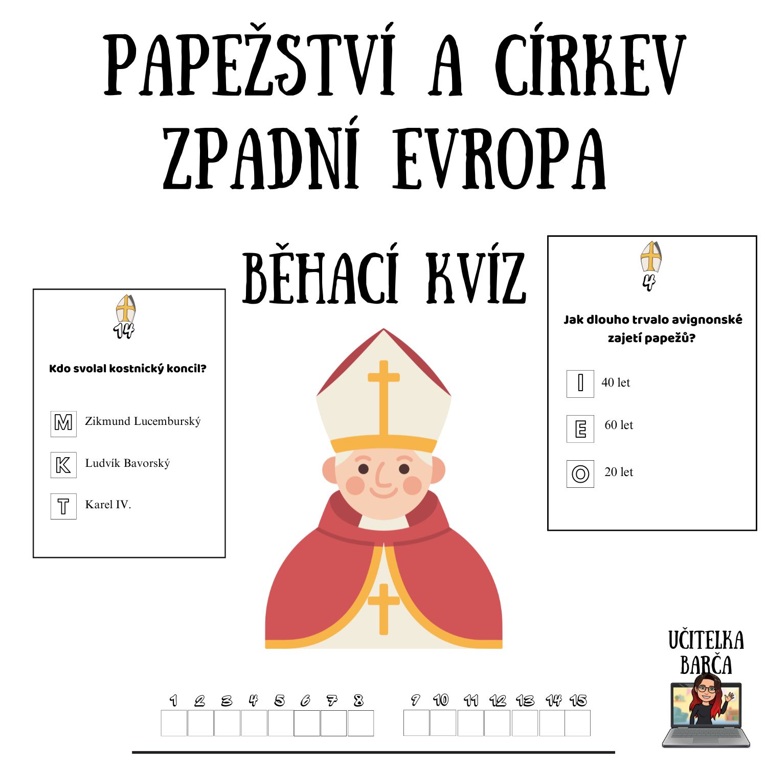 Materiál obsahuje 15 kvízových karet na zopakování učiva o papežském schizma. Součástí je i záznamový arch. Materiál je určen primárně do hodin dějepisu pro žáky 7. třídy.