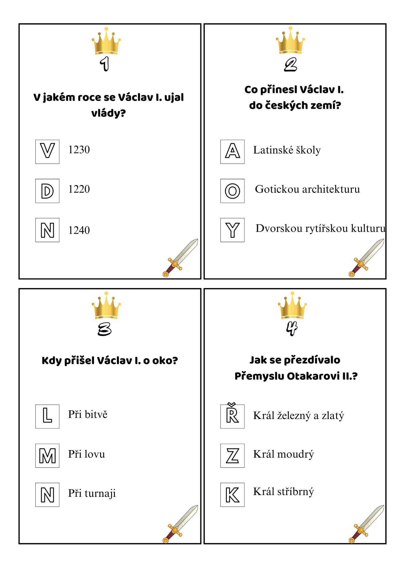 Materiál obsahuje 13 kvízových karet na zopakování učiva o posledních Přemyslovcích. Součástí je záznamový arch. Materiál je určen primárně do hodin dějepisu pro žáky 7. třídy.