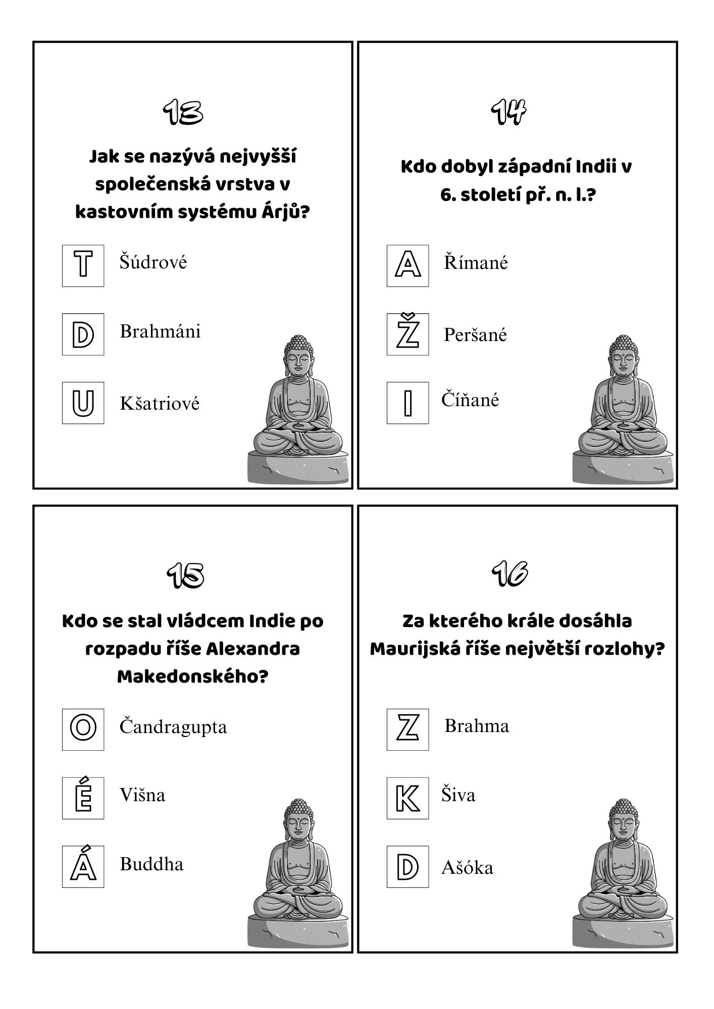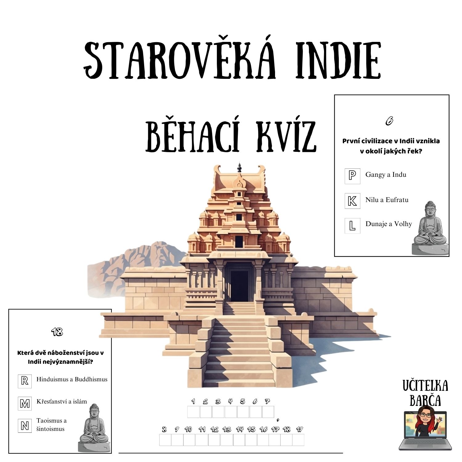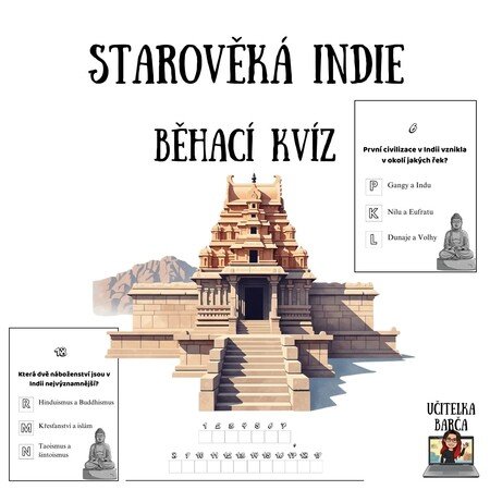 Materiál obsahuje 19 kvízových karet na zopakování učiva o starověké Indii. Součástí je i záznamový arch.