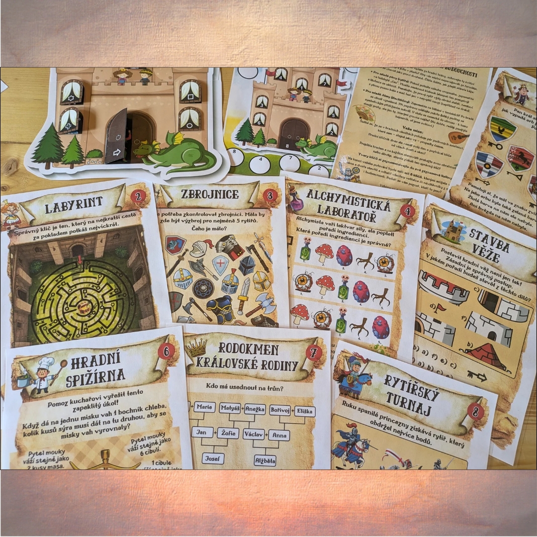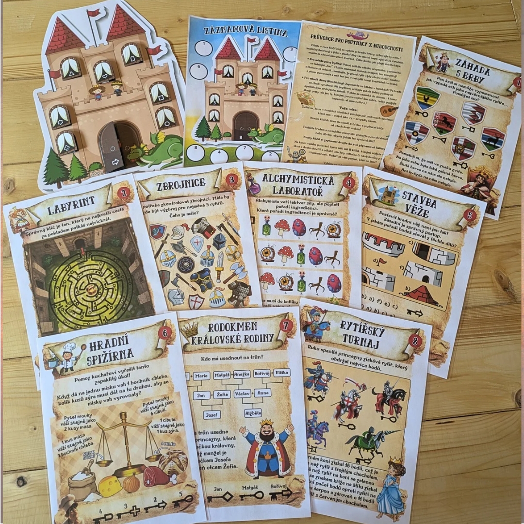 📜 Děti vyřeší záhadu s erby, pokusí se nezabloudit v labyrintu, udělají pořádek ve zbrojnici, navštíví také alchymistickou laboratoř, postaví hradní věž, pomůžou kuchaři vyřešit zapeklitý úkol v hradní spižírně, potrápí hlavičky nad rodokmenem královské rodiny a rozhodnou výsledky rytířského turnaje. To vše ovšem až po lekci středověké etikety! 👑🪭
