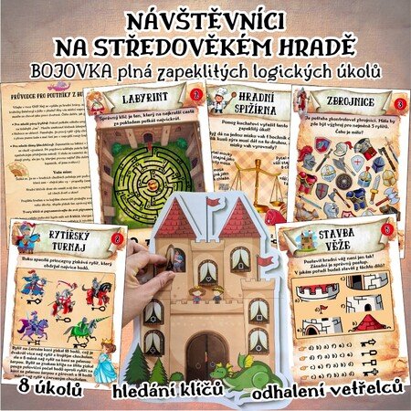 ⏳ Děti se ocitnou ve středověku a stanou se návštěvníky hradu, kde budou plnit speciální misi. Hradní klíčník totiž poztrácel klíče od hradu a na děti teď čeká 8 stanovišť s 8 záludnými logickými hádankami se středověkou tematikou, při jejichž vyřešení postupně všech 8 klíčů naleznou 🗝️
