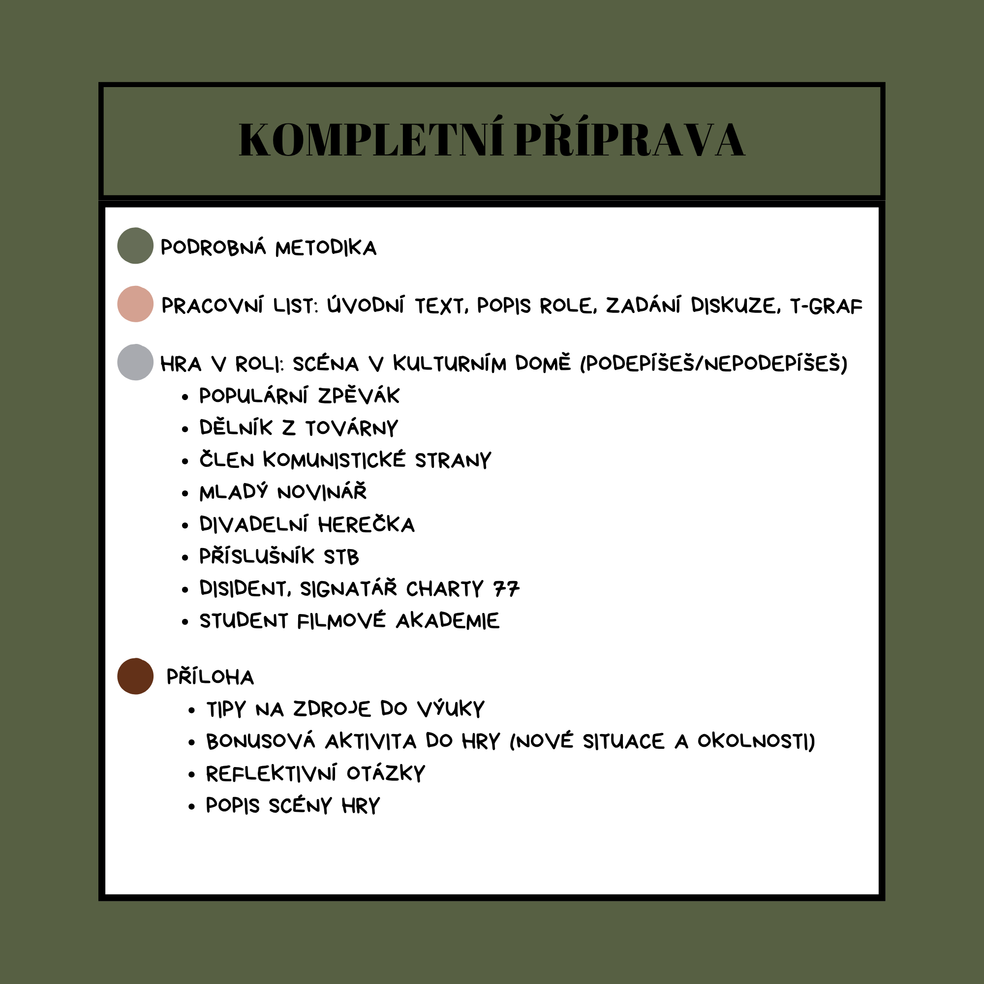 Pracovní list obsahuje úvodní text, popis role, pokyny pro diskuzi, T-graf a rozuzlení hry - podepíšeš/nepodepíšeš.