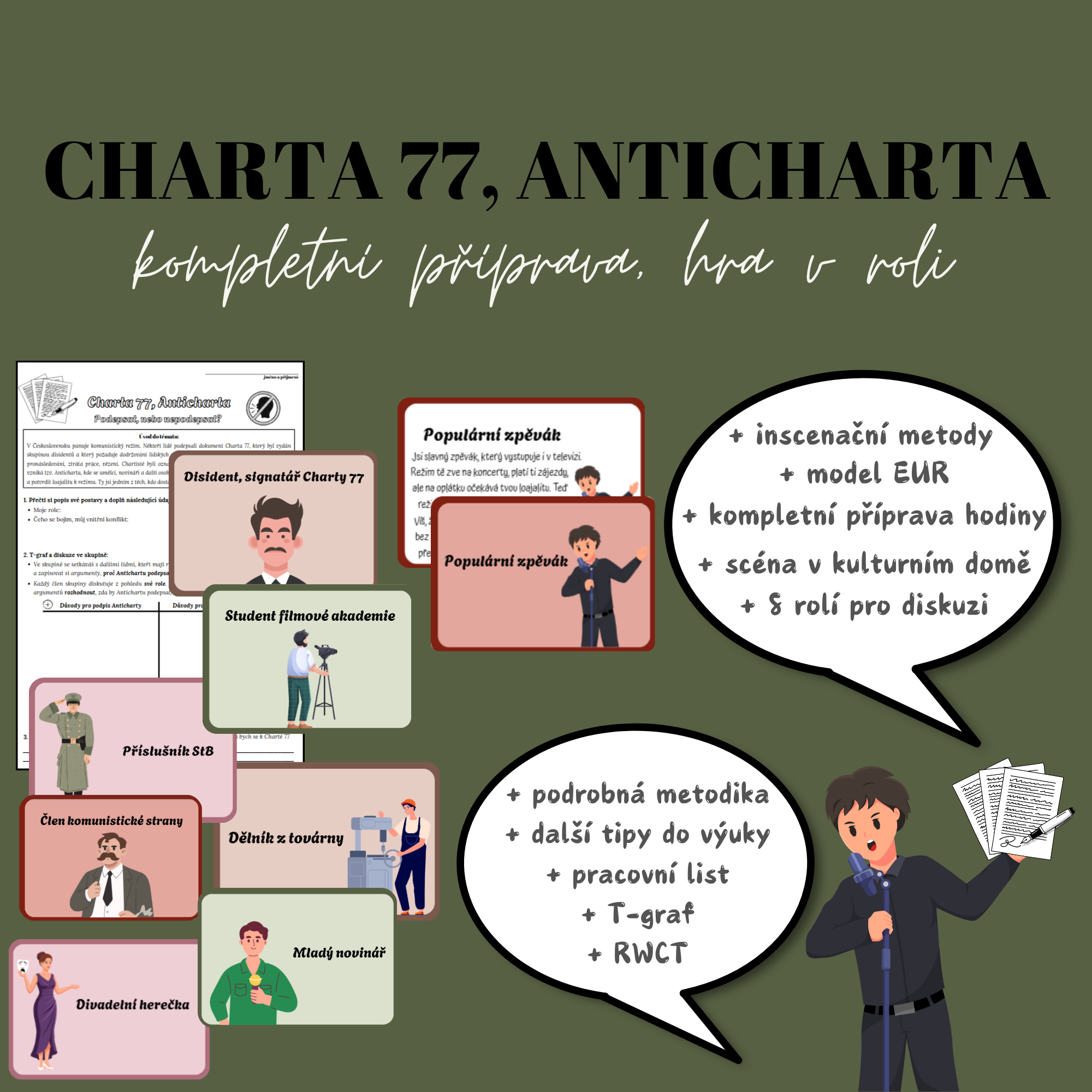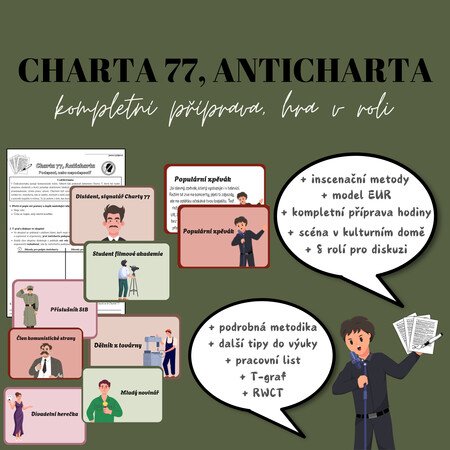 Materiál slouží k výuce tématu CHARTA 77 A ANTICHARTA. Jedná se o kompletní přípravu s podrobně popsanou metodikou. Hodina je sestavena dle modelu EUR.