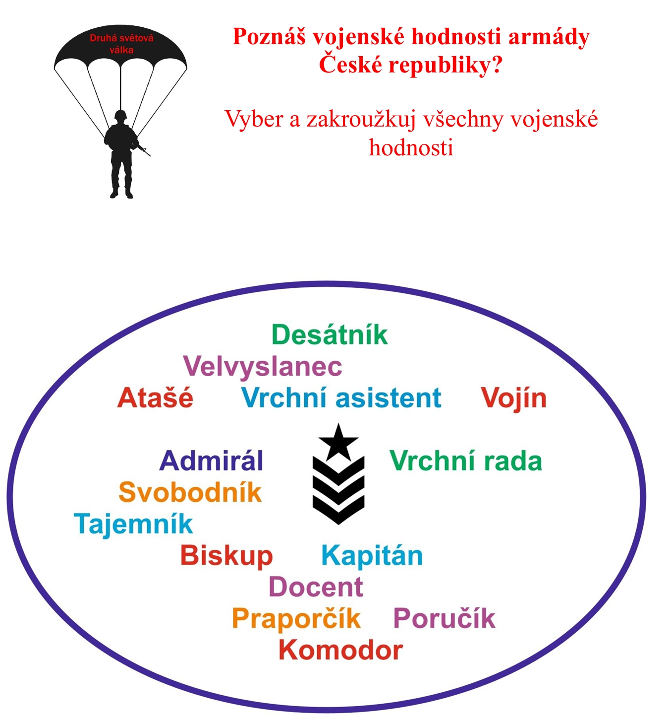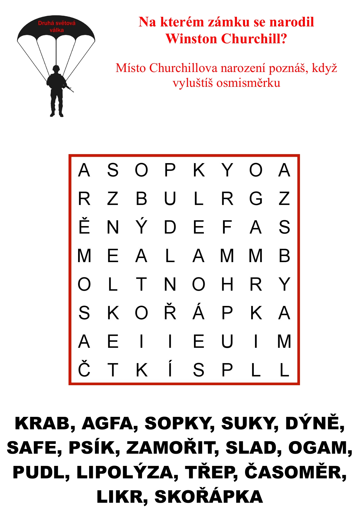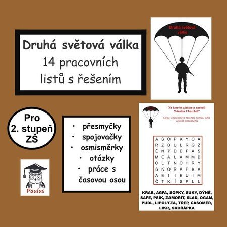 Pracovní listy s názvem Druhá světová válka obsahují úvodní stránku, 14 pracovních listů a řešení pro učitele. Listy mimo jiné obsahují: přesmyčky, spojovačky, osmisměrky, práce s časovou osou, otázky a vysvětlování dobových pojmů.