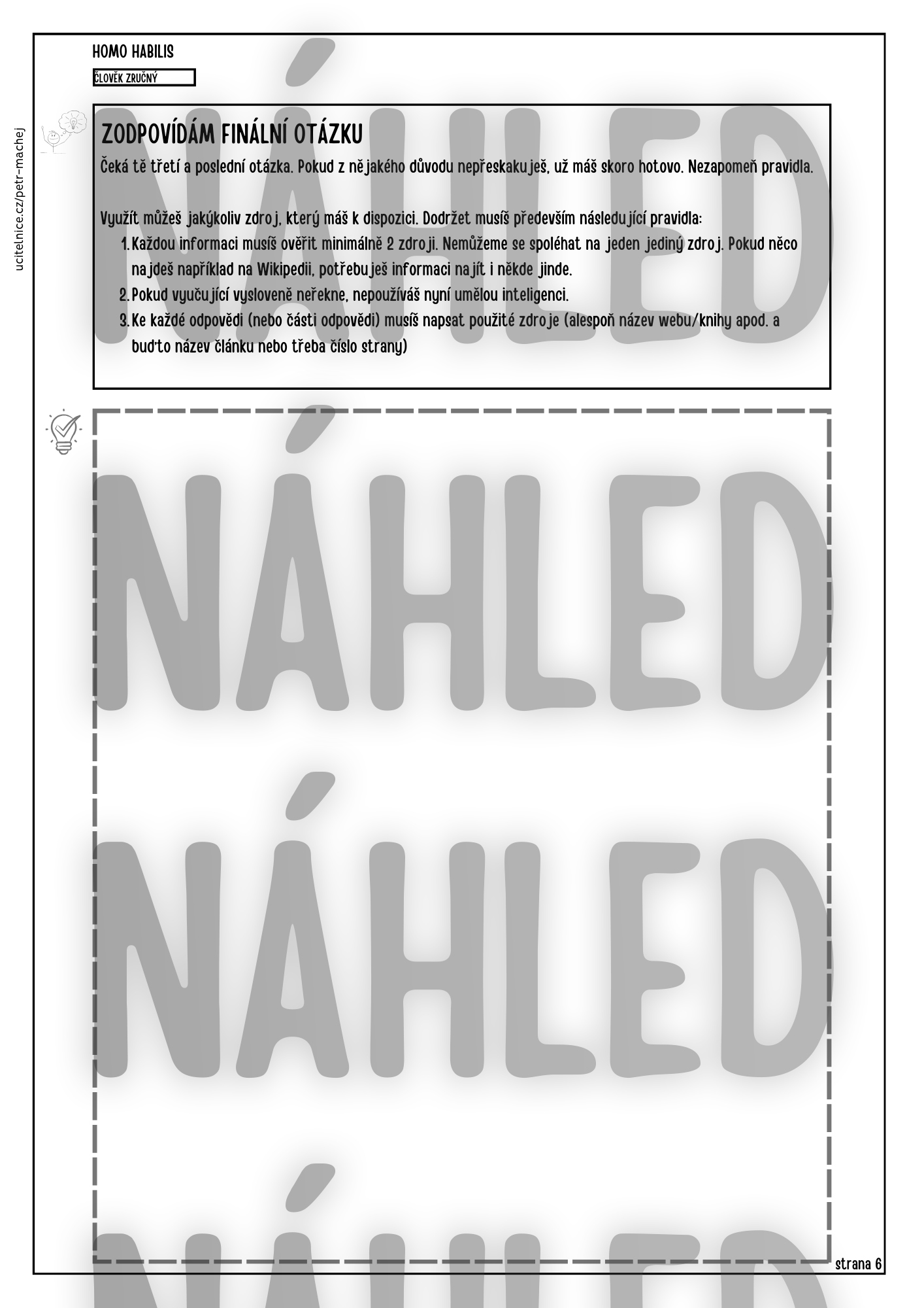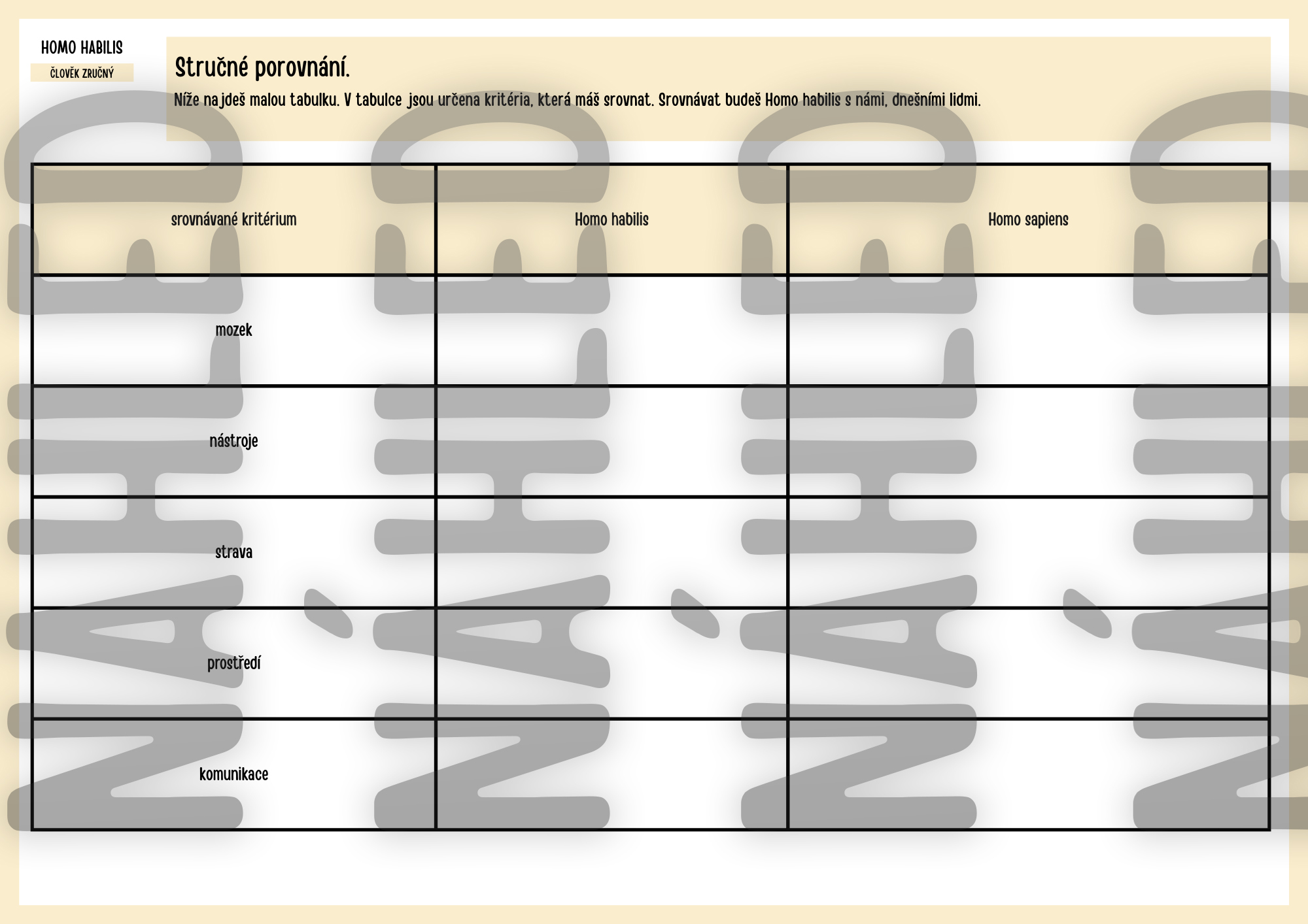 - Rozšiřující materiály, které práci zpestří (úkol k ilustraci, prázdné časové osy nebo srovnávací tabulku s kritérii pro lepší uvědomění odlišností Homo habilis od dnešního člověka).