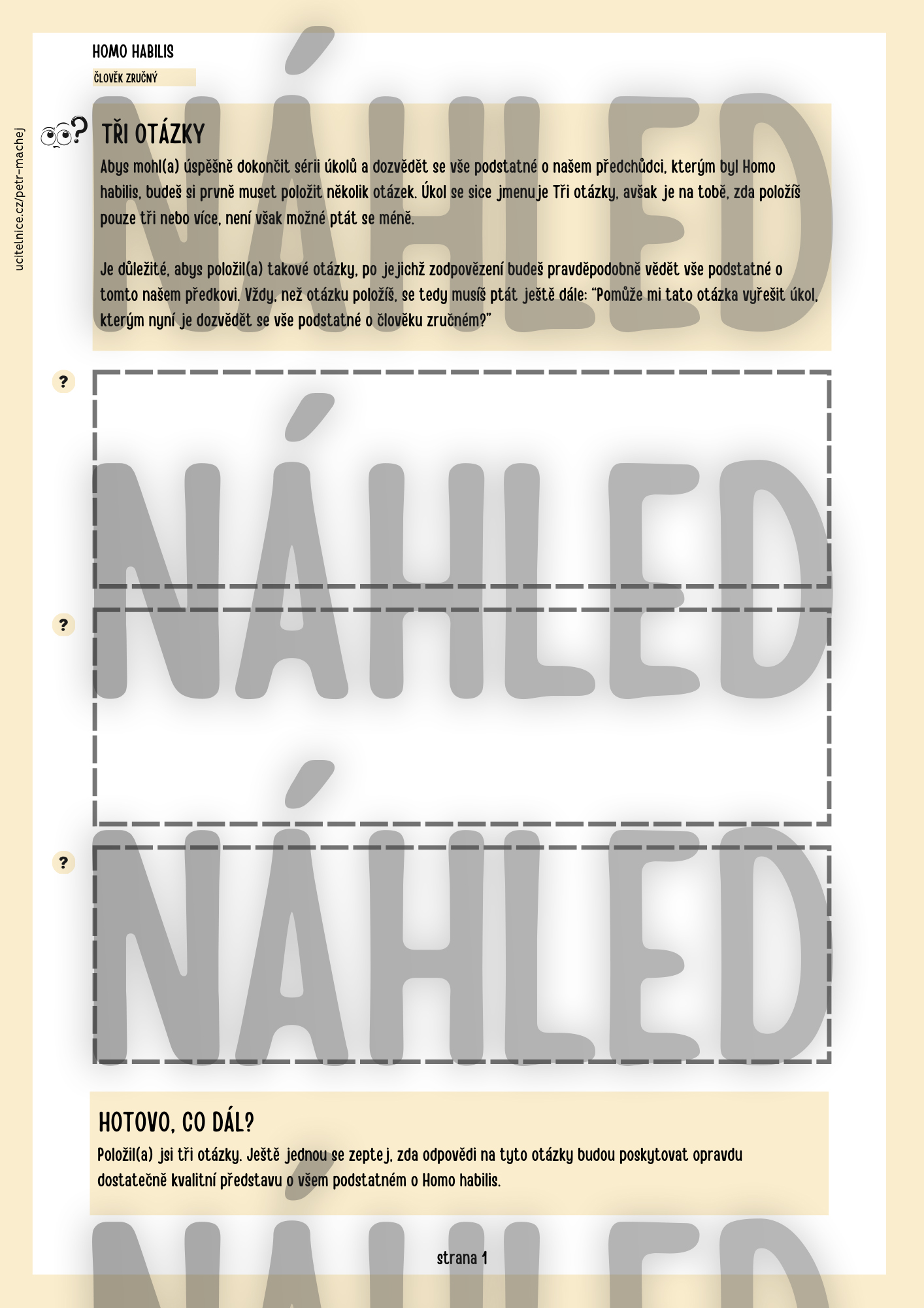 Materiál slouží k výuce o Homo habilis. Je strukturován tak, aby jej bylo možné plnit samostatně, ve dvojici i ve skupinách (ideálně menších).