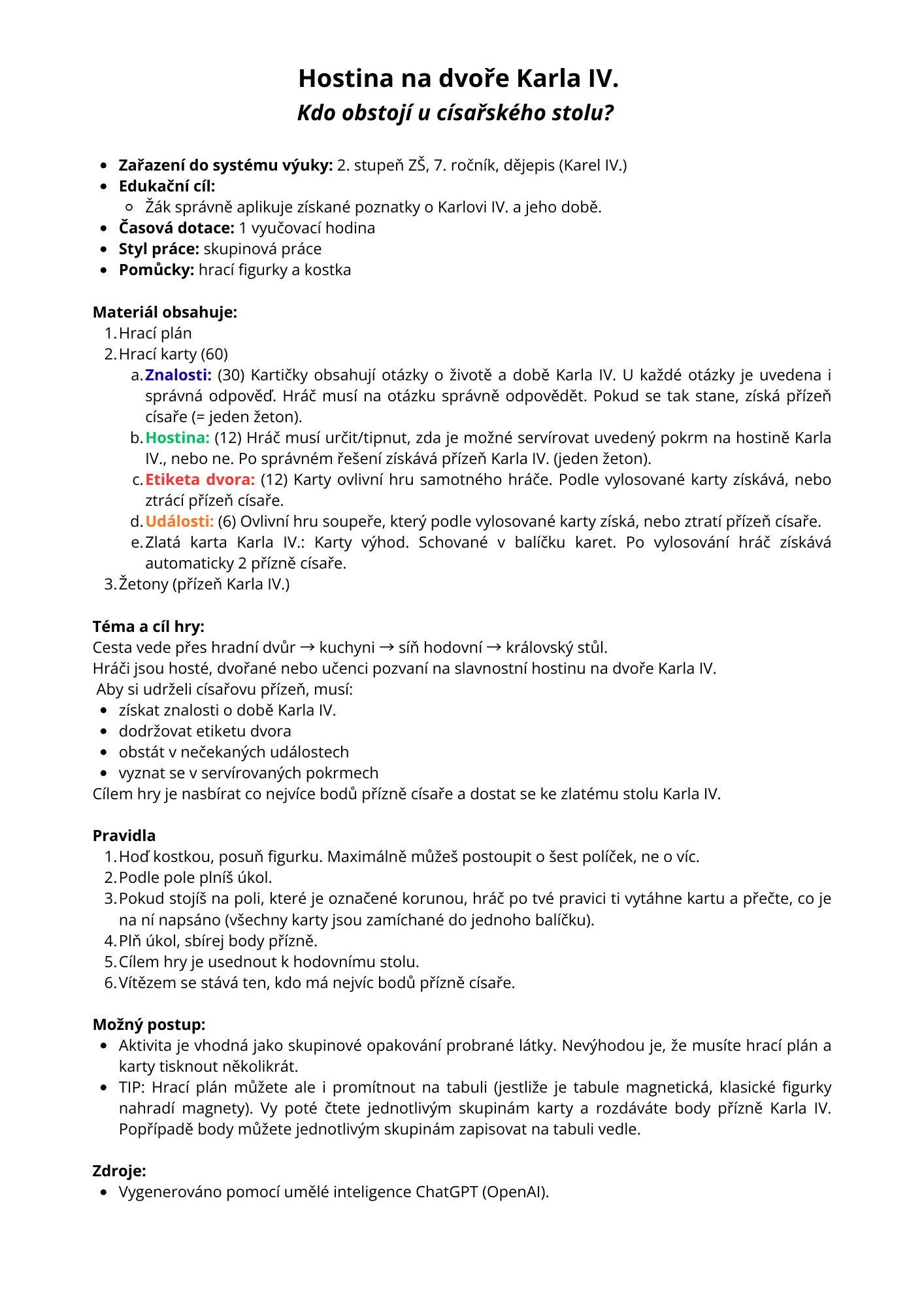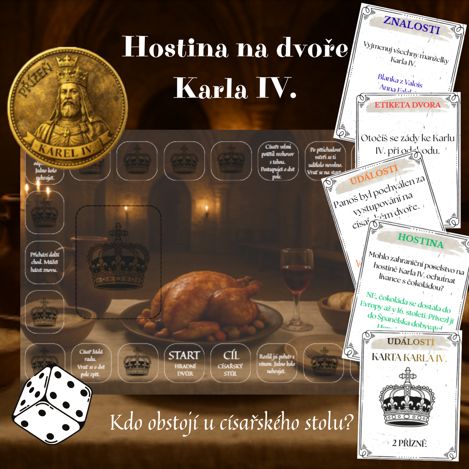 Vstupte na dvůr Karla IV. a staňte se jeho hostem. Opakování dějepisných poznatků hrou. Zahrajte si o císařovu přízeň. Hostina, intriky i etiketa dvora. Zábava zaručena.