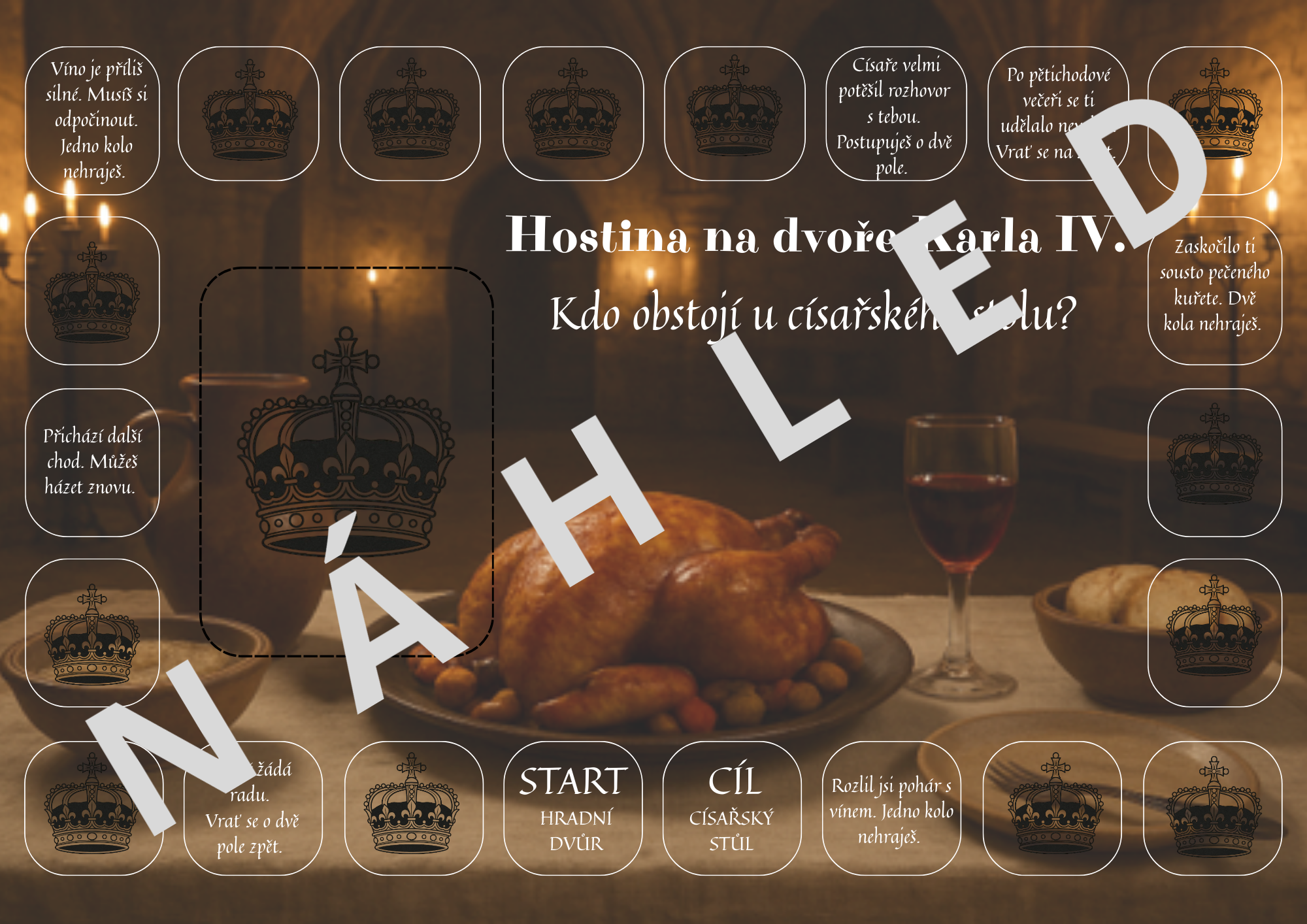 císaře (= jeden žeton).Hostina: (12) Hráč musí určit/tipnut, zda je možné servírovat uvedený pokrm na hostině Karla
