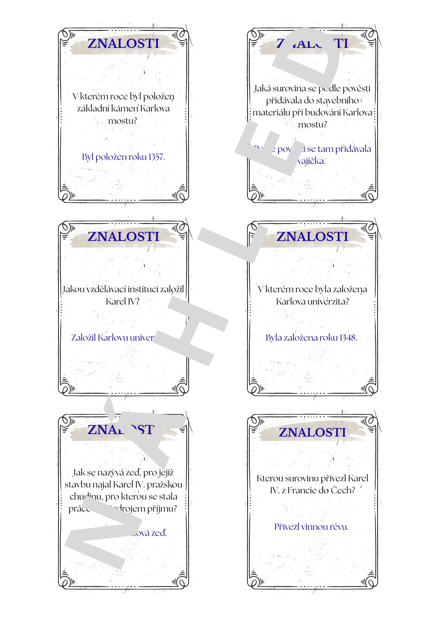 Znalosti: (30) Kartičky obsahují otázky o životě a době Karla IV. U každé otázky je uvedena i