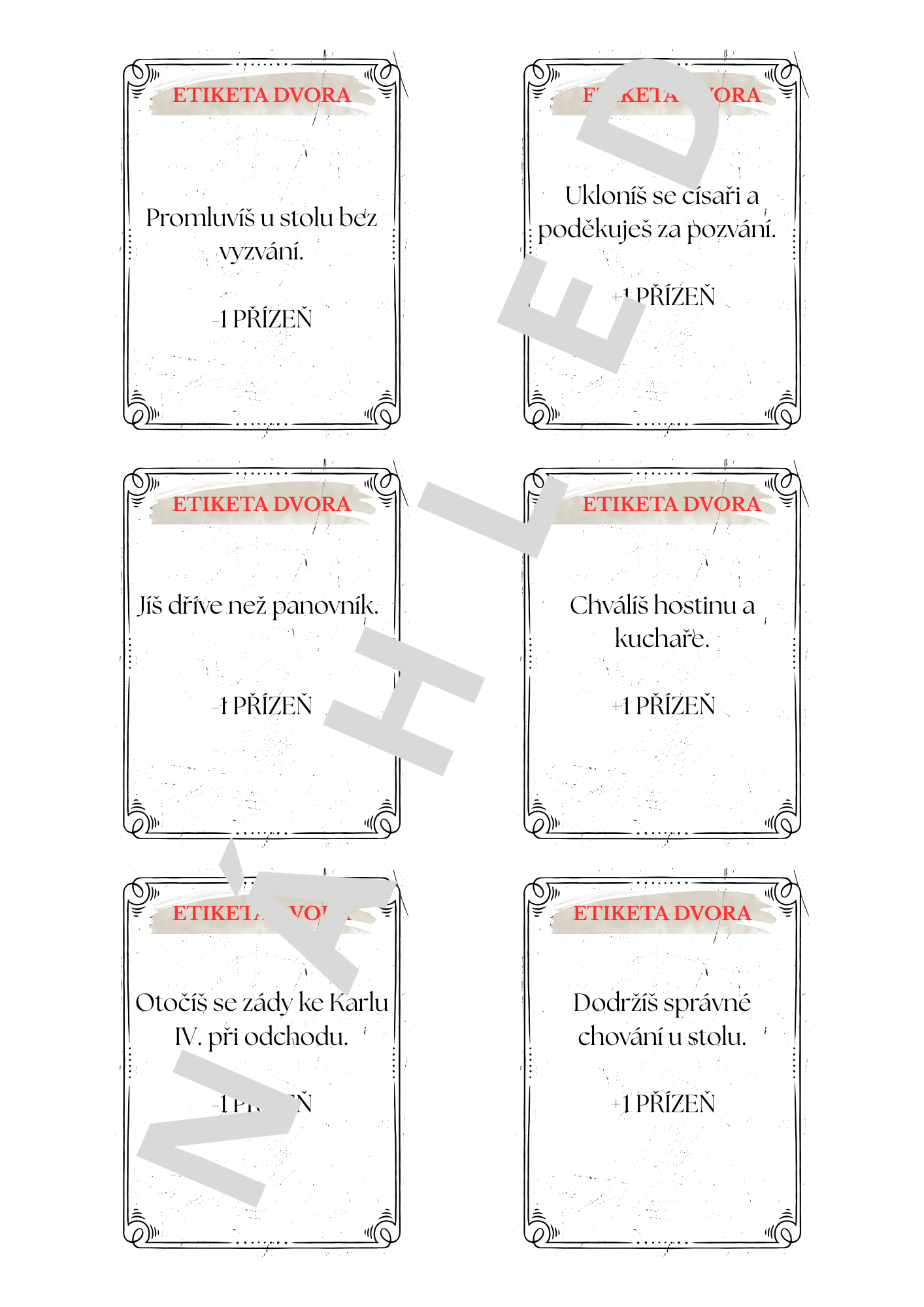 IV., nebo ne. Po správném řešení získává přízeň Karla IV. (jeden žeton).Etiketa dvora: (12) Karty ovlivní hru samotného hráče. Podle vylosované karty získává, nebo