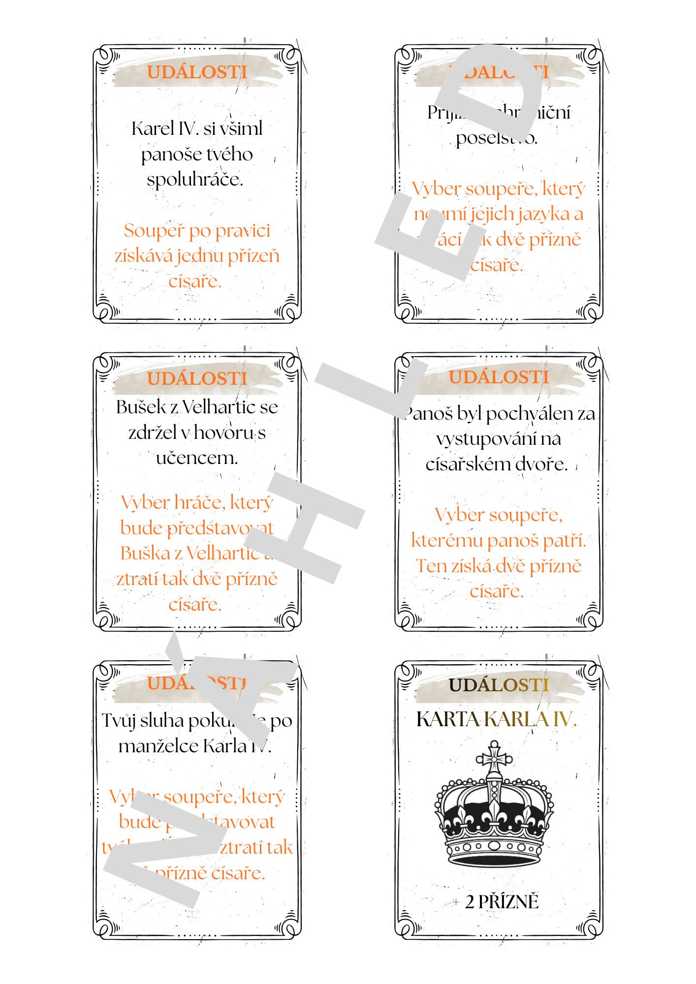ztrácí přízeň císaře.Události: (6) Ovlivní hru soupeře, který podle vylosované karty získá, nebo ztratí přízeň císaře.